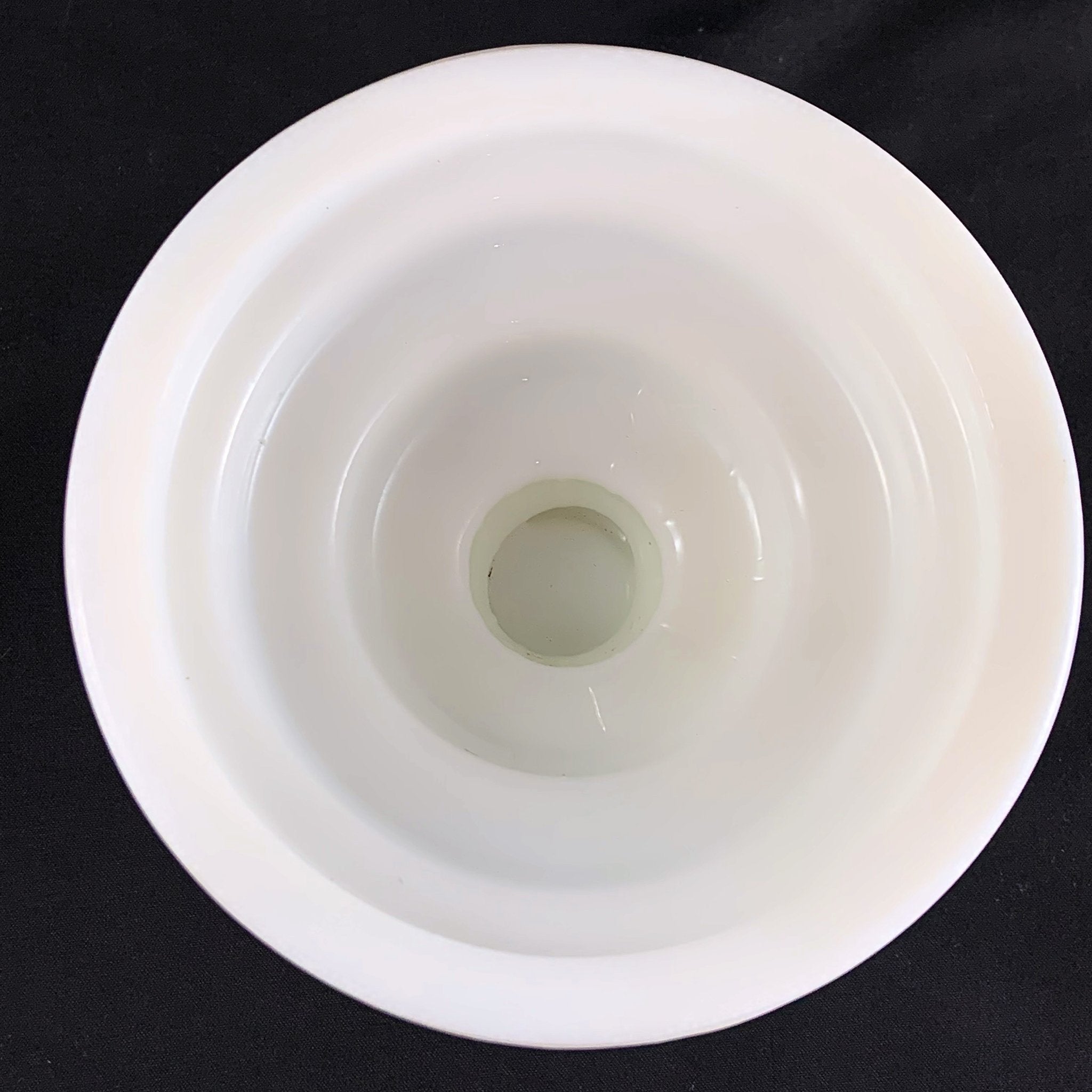 Versatile vintage milk glass pedestal candle holder, features a embossed swirl detail. May be used with several sized candles including taper, 2" votive, 3" pillar and 4" pillar, with the reverse side perfect for a round candle.