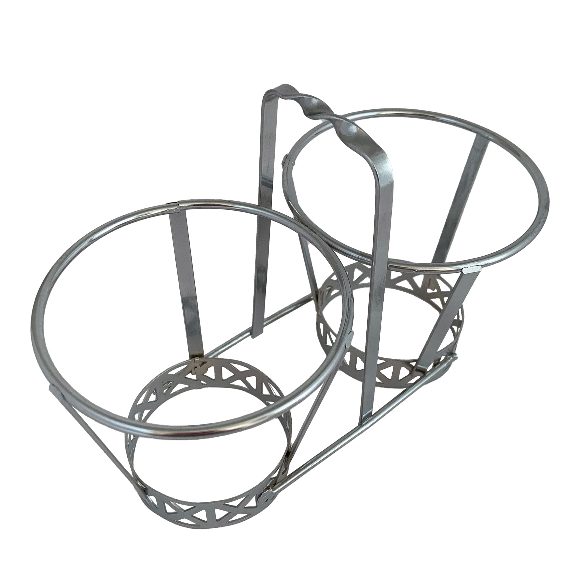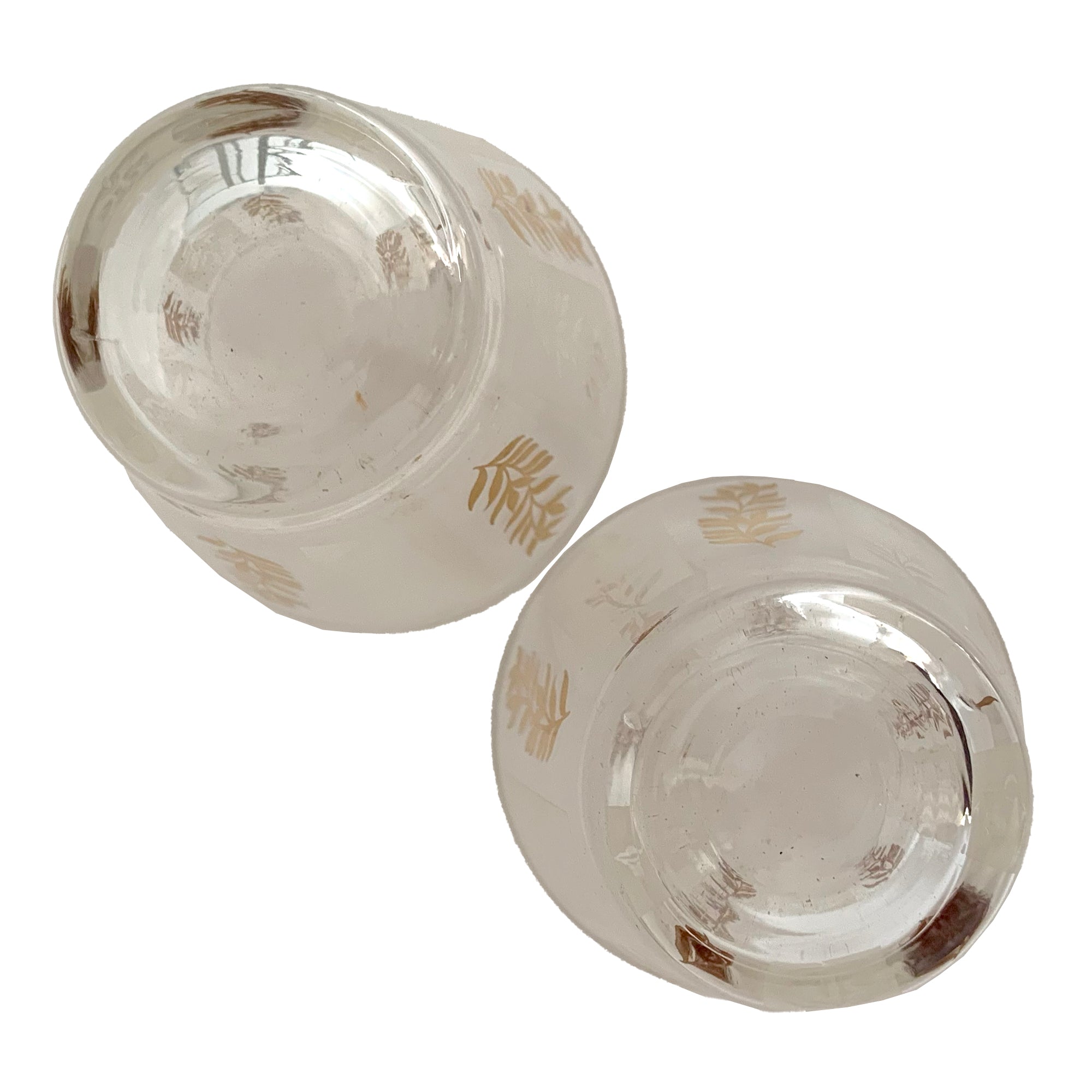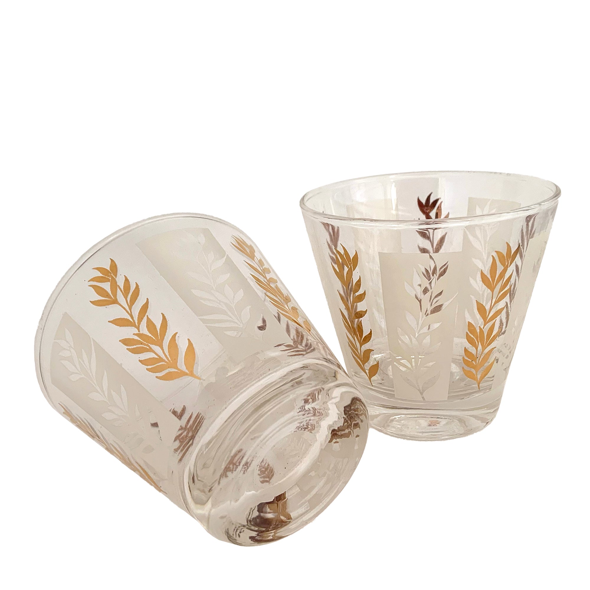 Vintage 2-part glass condiment server featuring alternating 22kt gold leaves and clear leaves on a white stripe and pinecone embossed aluminum lids in chrome caddy. Crafted by Dominion Glass, Canada, 1950s. Love the conical shape of the glass and the styling on the caddy....very mid-century modern and a great way to serve your favourite fixings.
