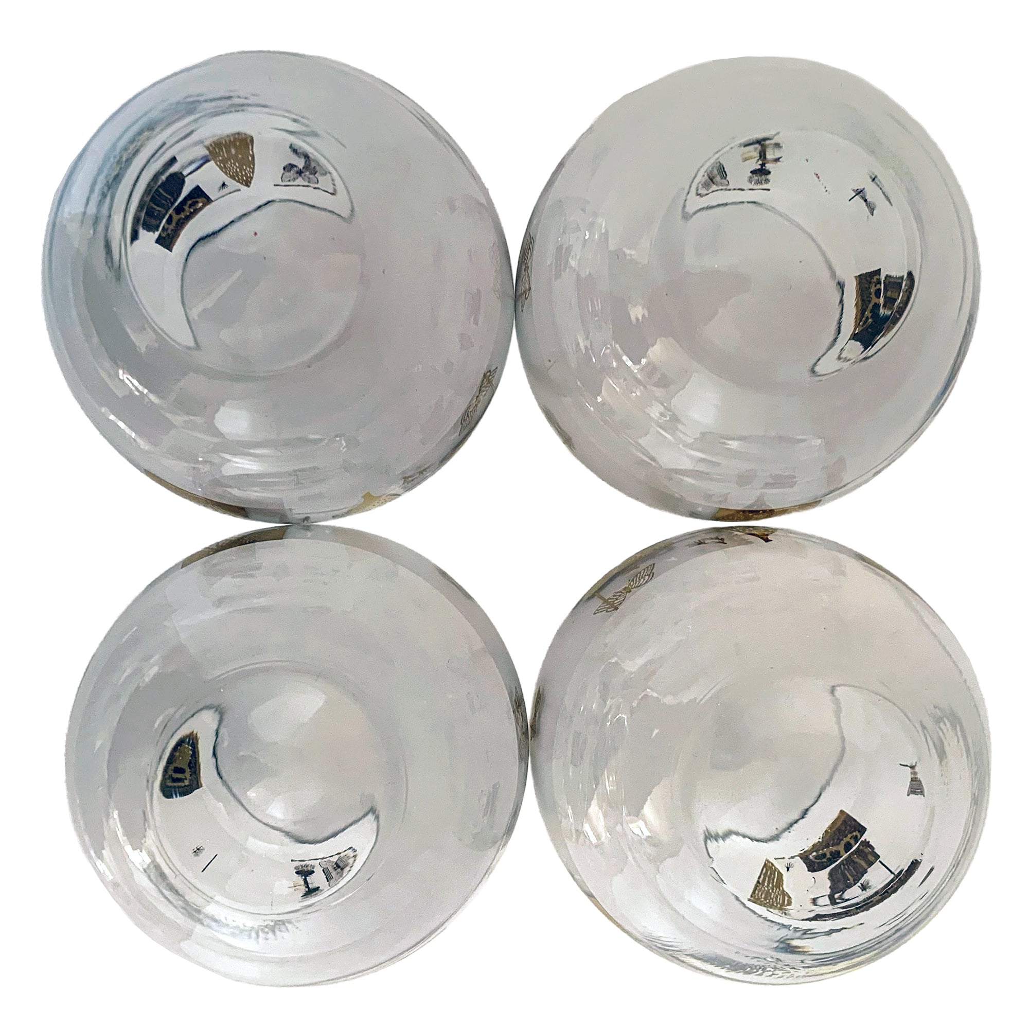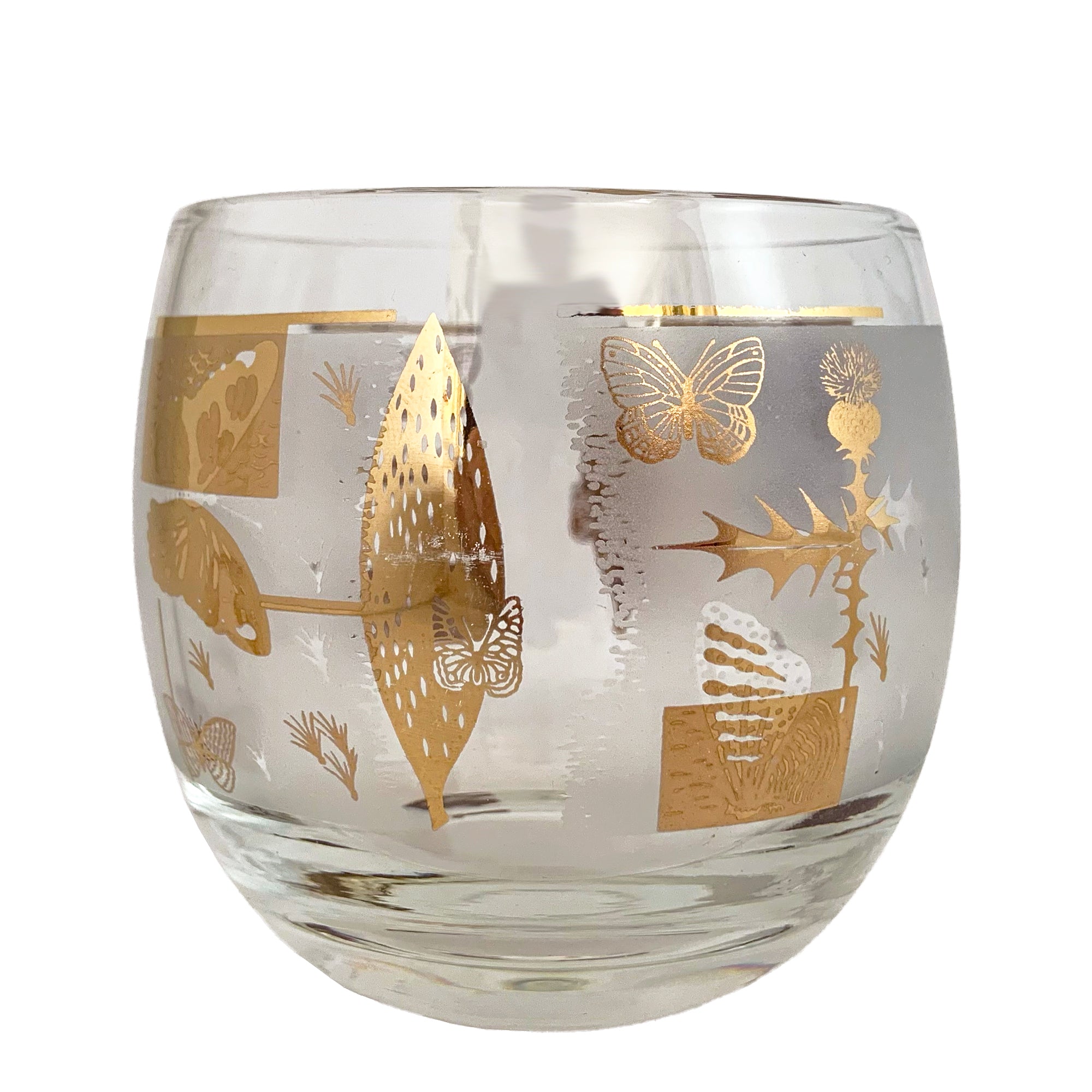 Set of four vintage Fred Press "Golden Meadow" 13oz roly poly glasses featuring 22kt gold butterflies and botanicals on a frosted band. Crafted by Federal Glass, USA, 1950s/60s. Add these iconic glasses to your barware collection!