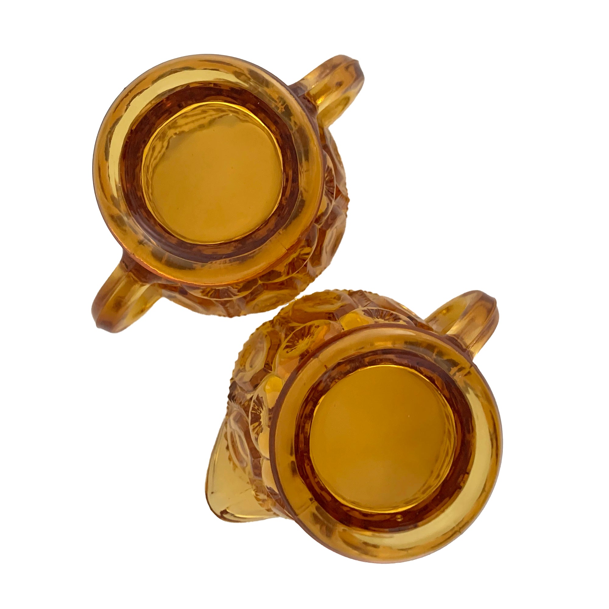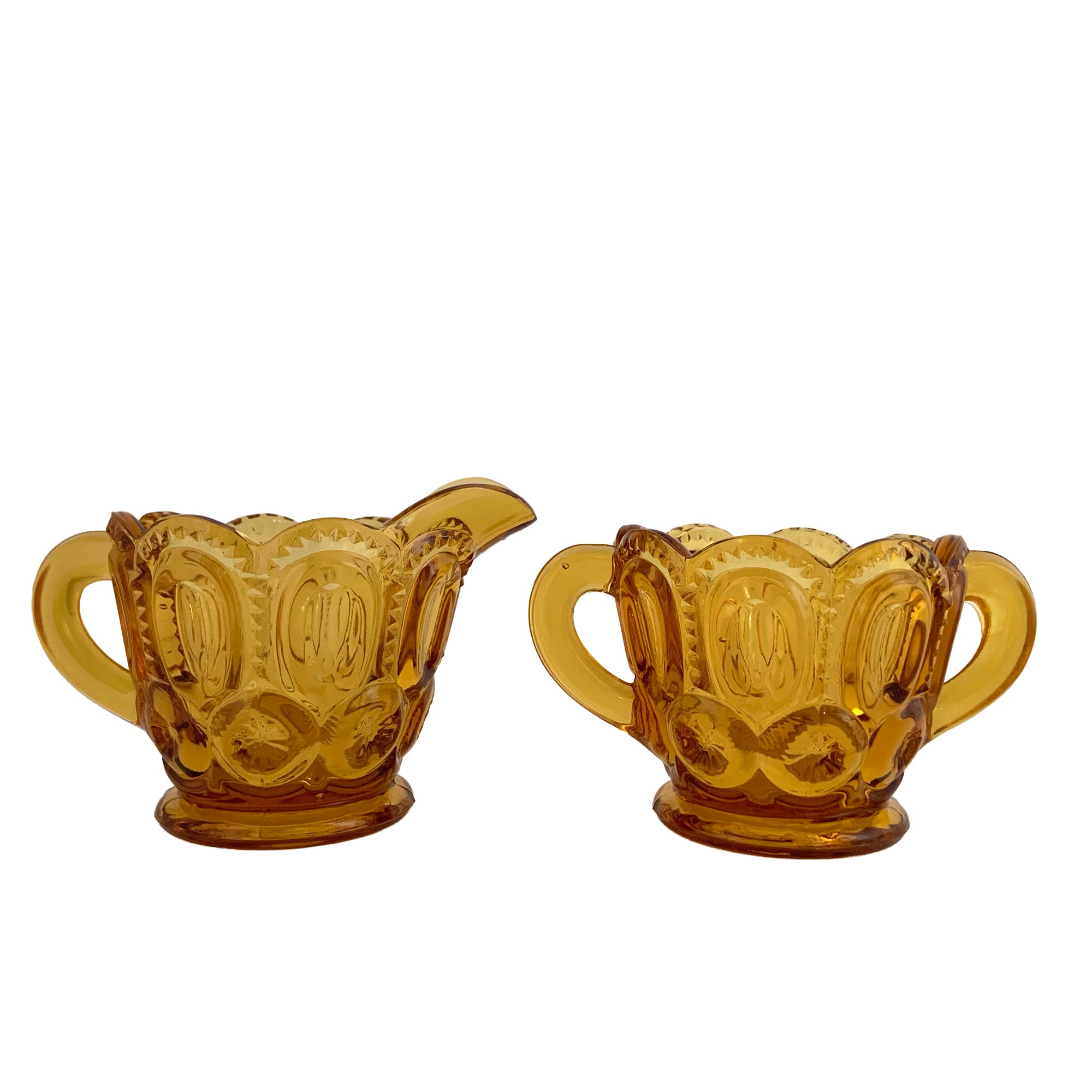 Vintage amber "Moon and Star" glass creamer and sugar. Crafted by LE Smith Glass, USA. Makes a lovely addition to your tablescape!