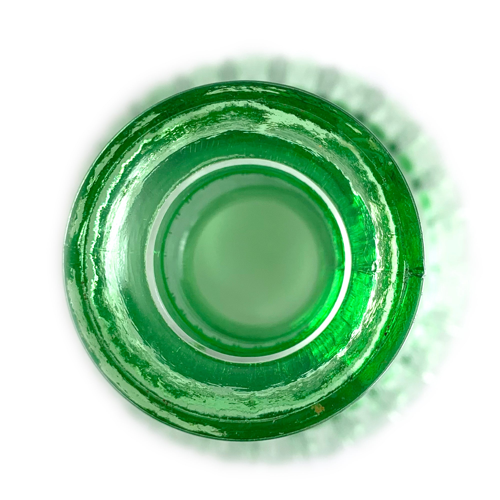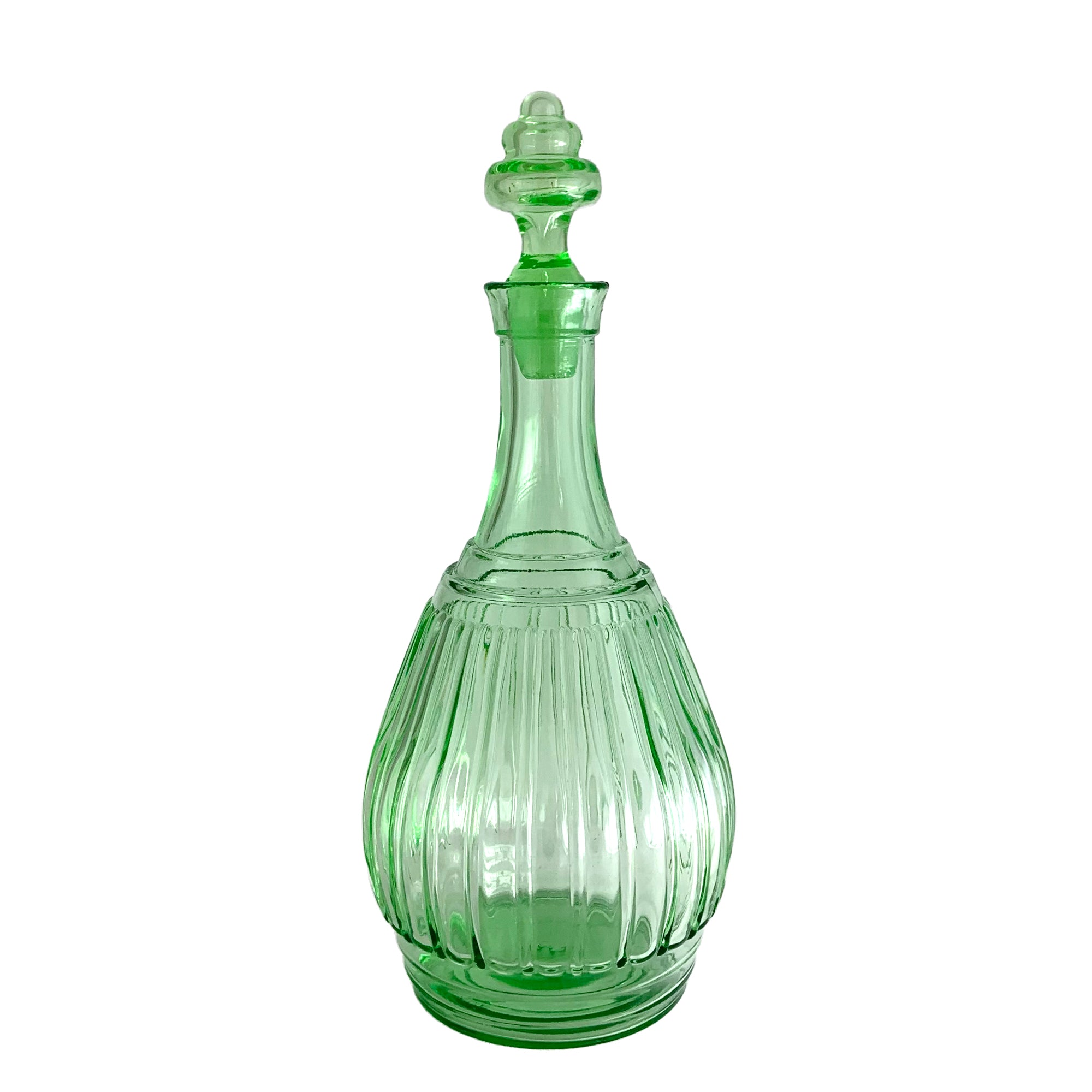 Vintage "New Century" Green Uranium Glass Decanter, Hazel-Atlas Glass, USA, 1930 - 1935. Glows brilliantly under black light. A wonderful addition to your glowy glass collection... perfect for a spooky barware display too!