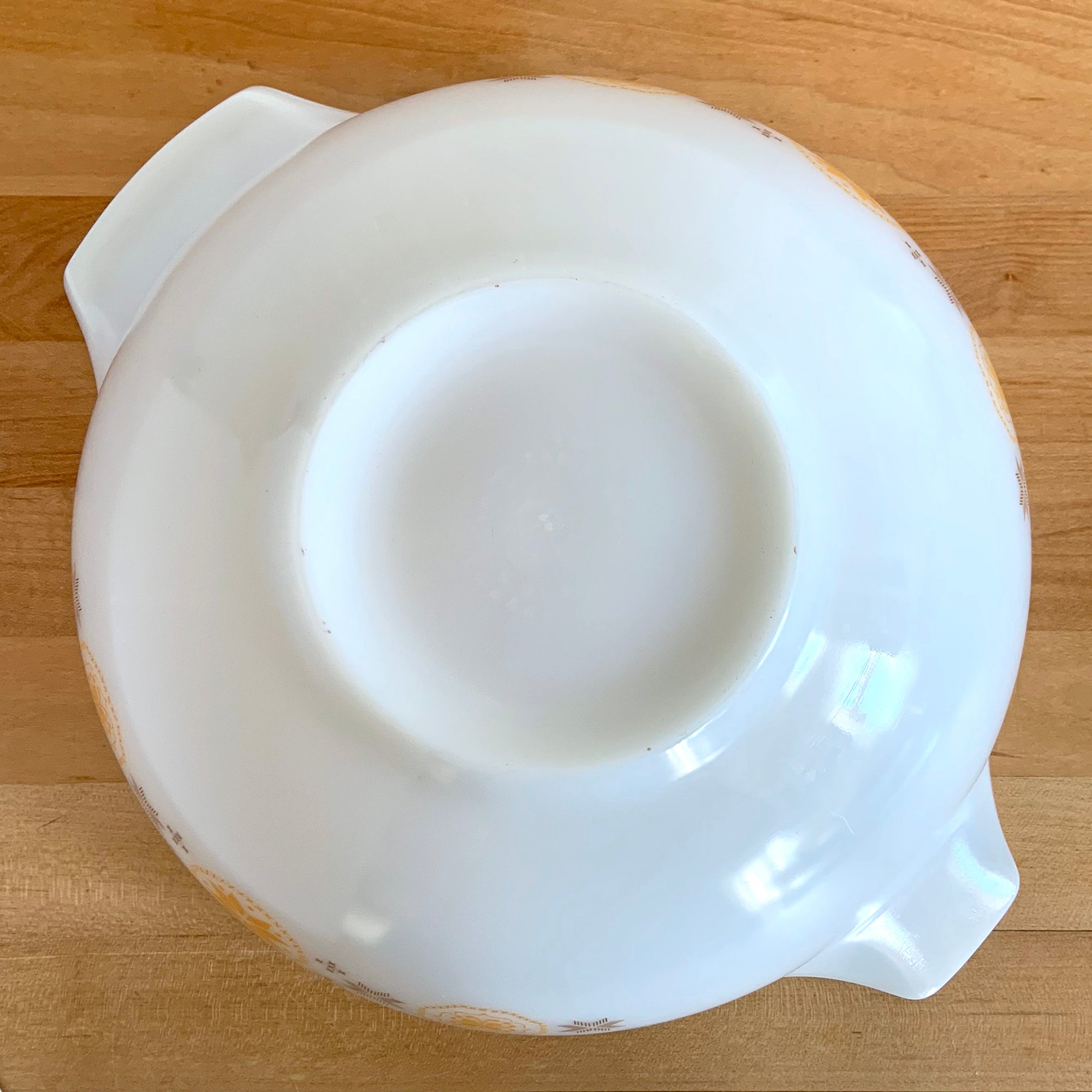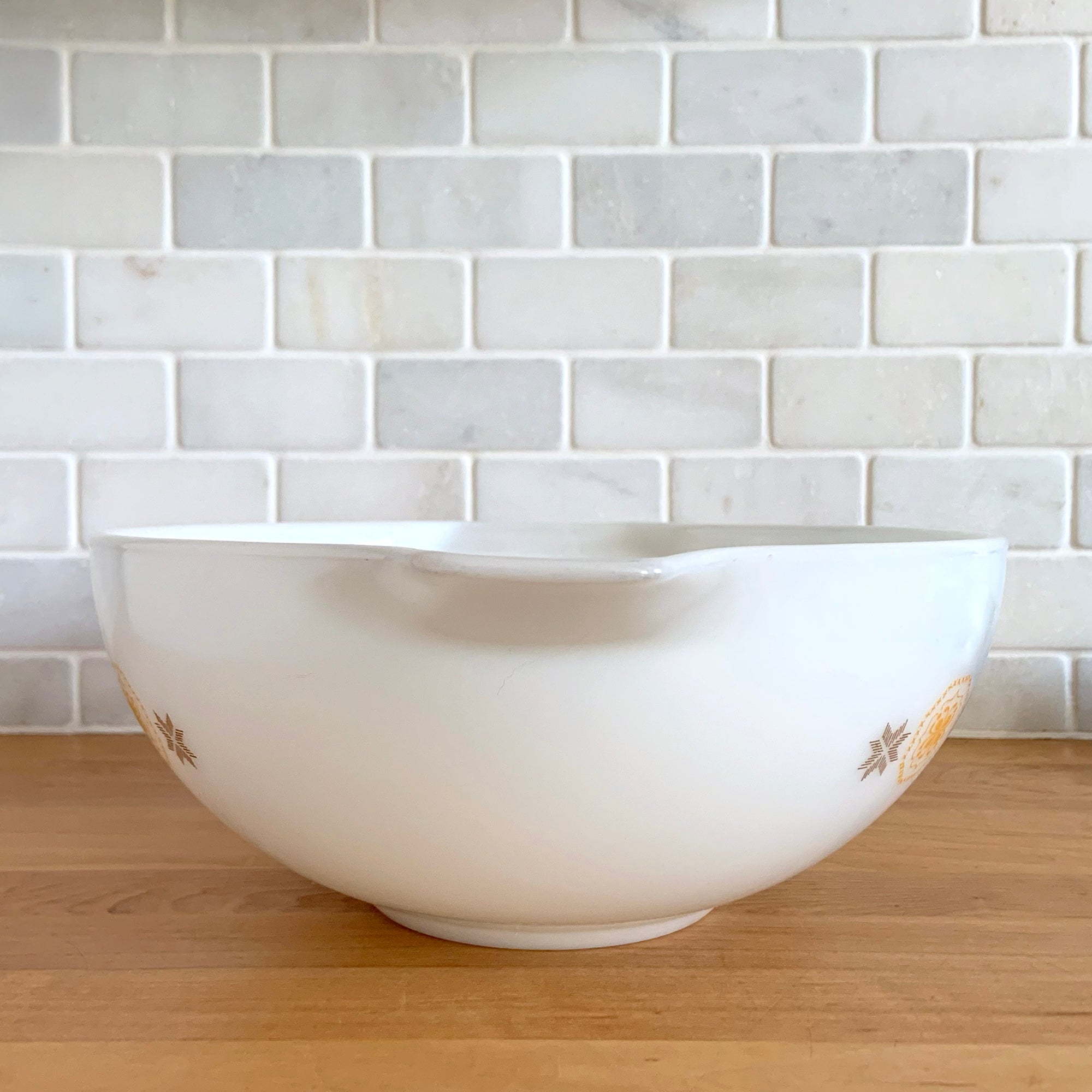 Vintage "Town and Country" 444 Cinderella mixing bowl featuring a rustic star quilt pattern in brown and orange. Crafted by PYREX, USA, 1963 - 1964. A true kitchen classic!