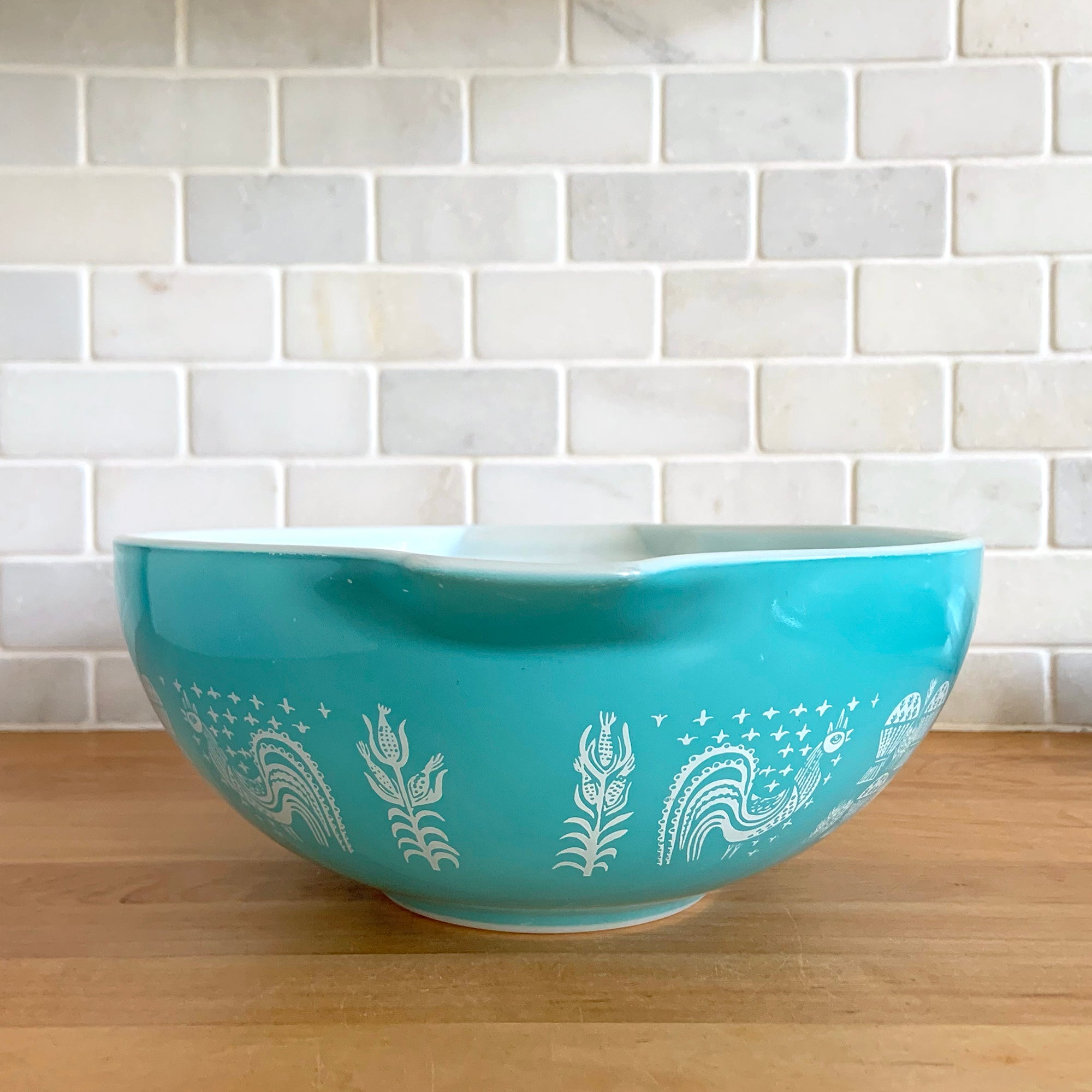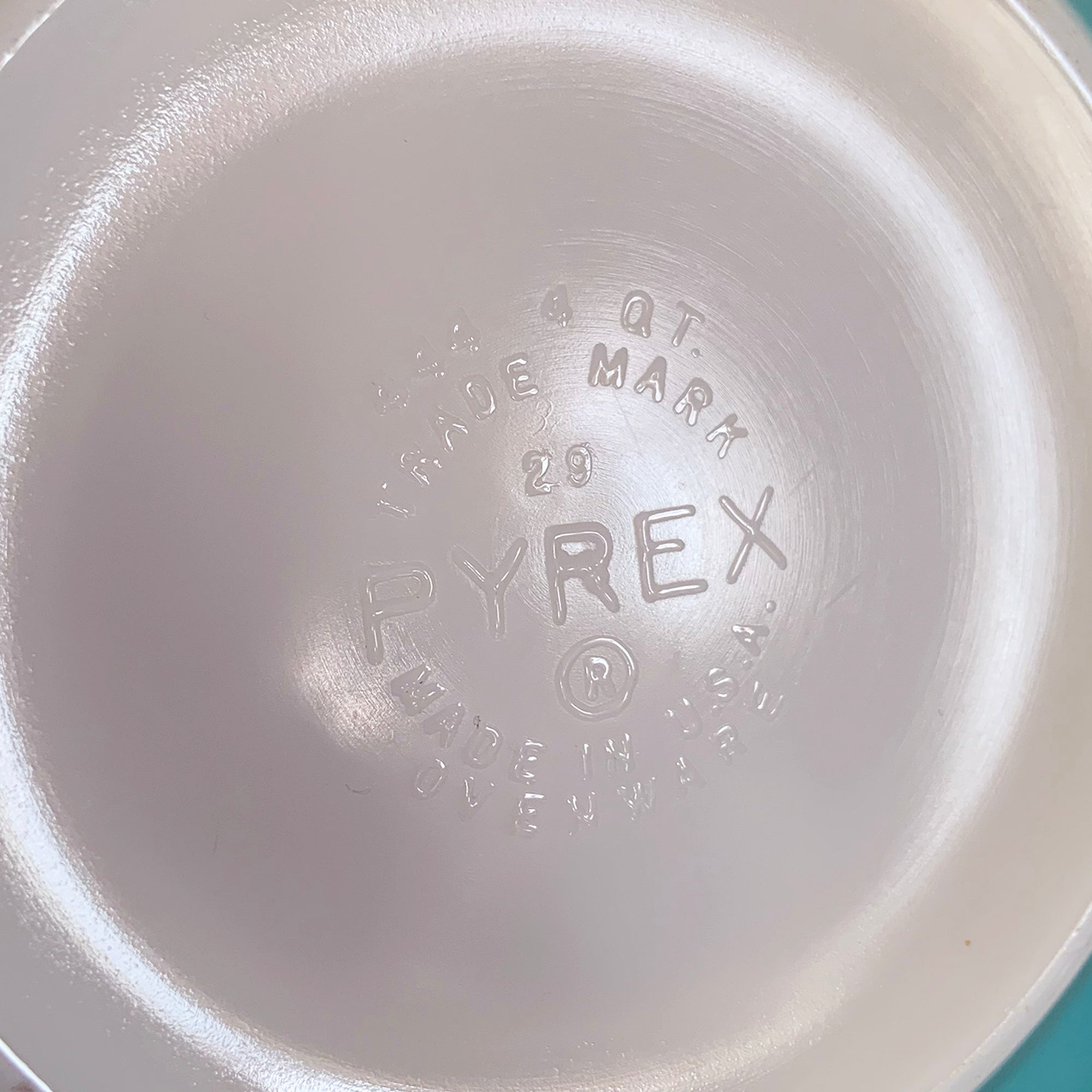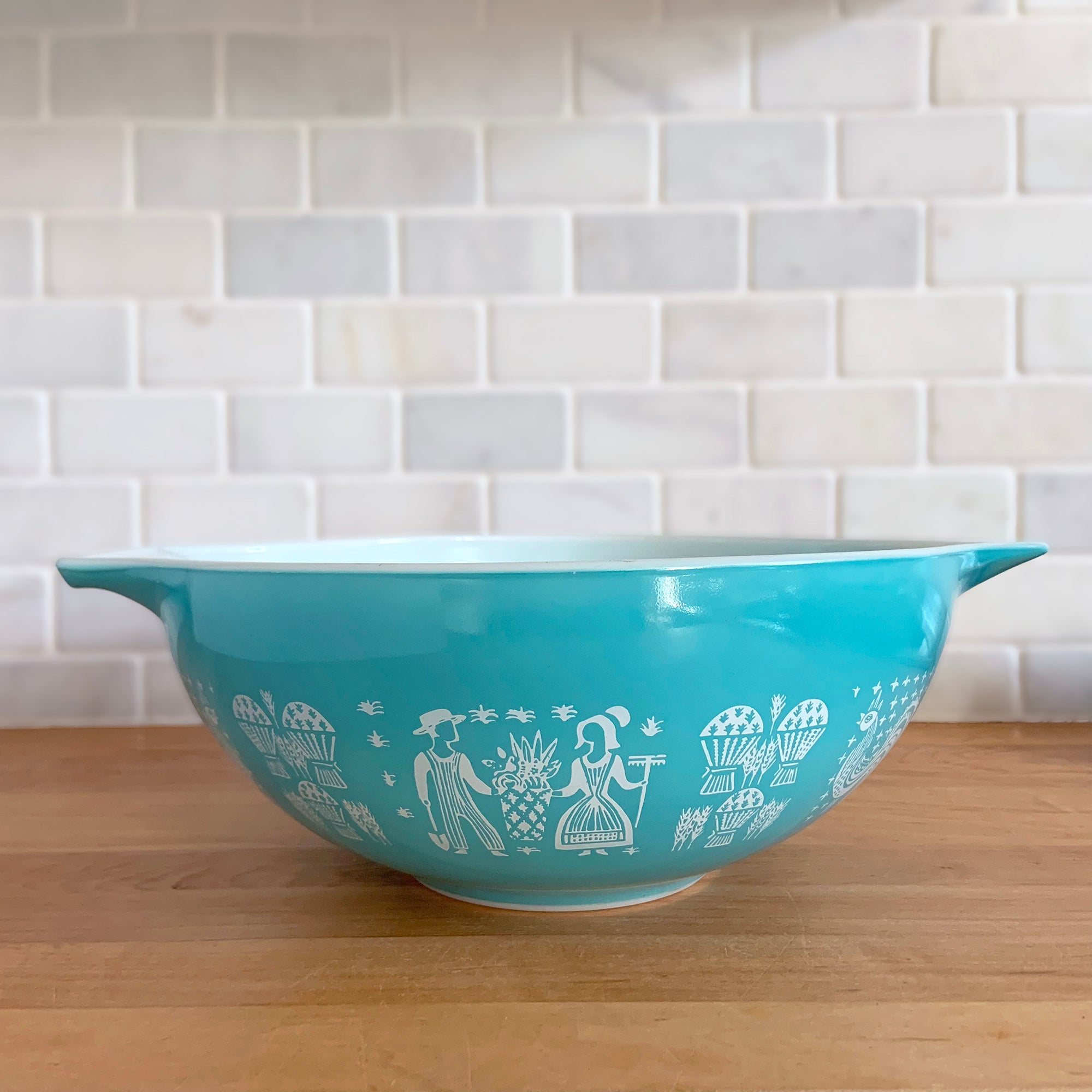Vintage turquoise "Butterprint" 444 Cinderella mixing bowl. Crafted by PYREX, USA, 1957 - 1968. A true kitchen classic!