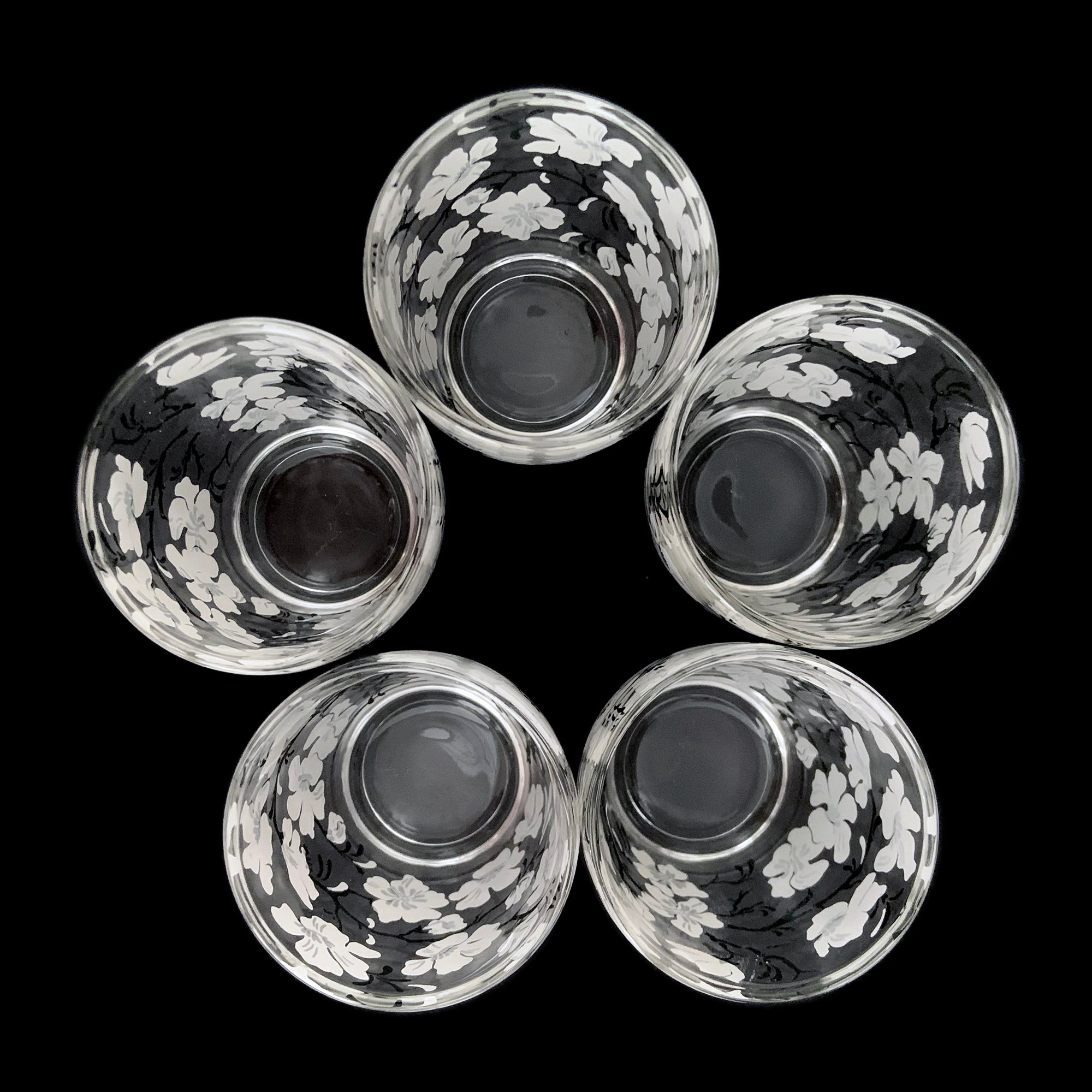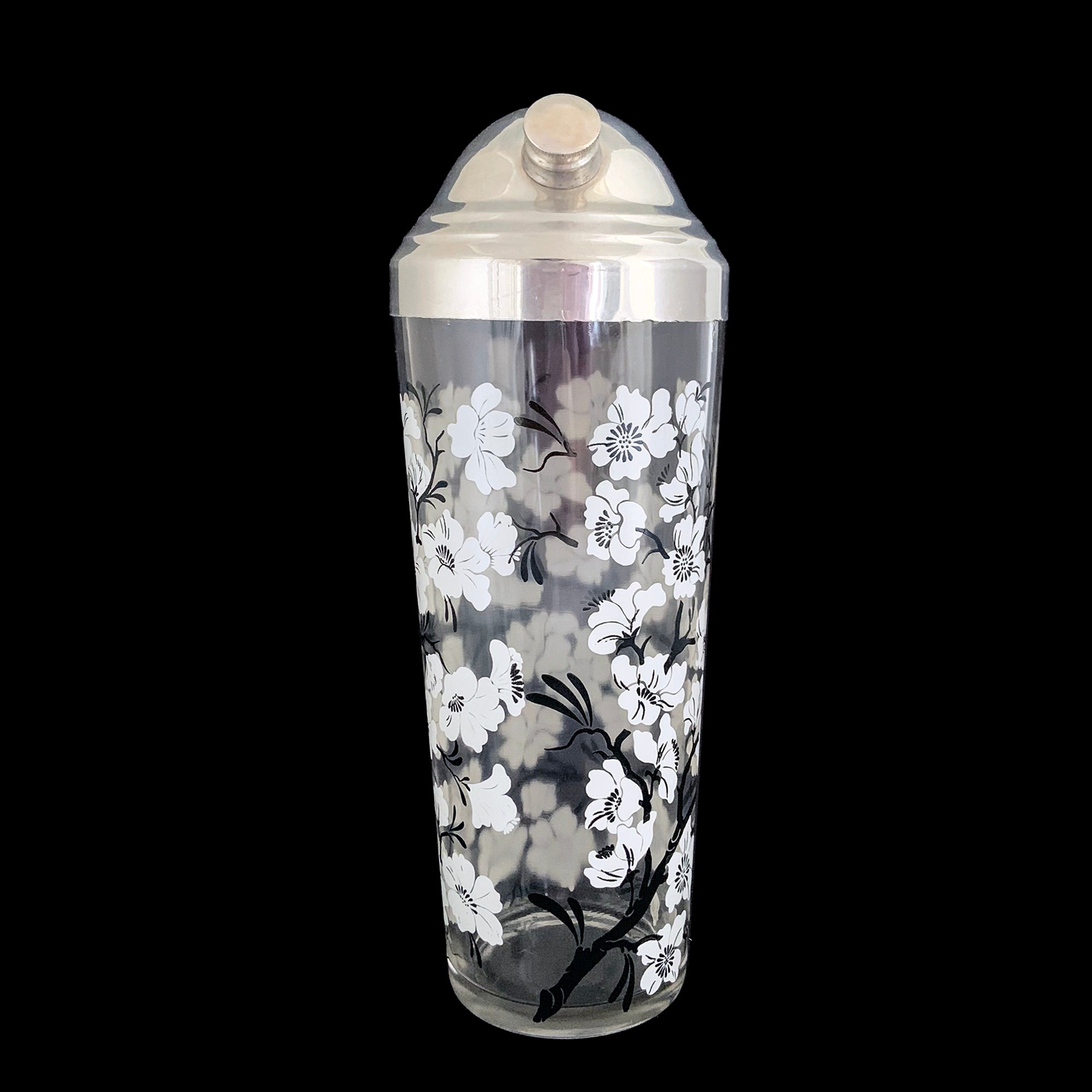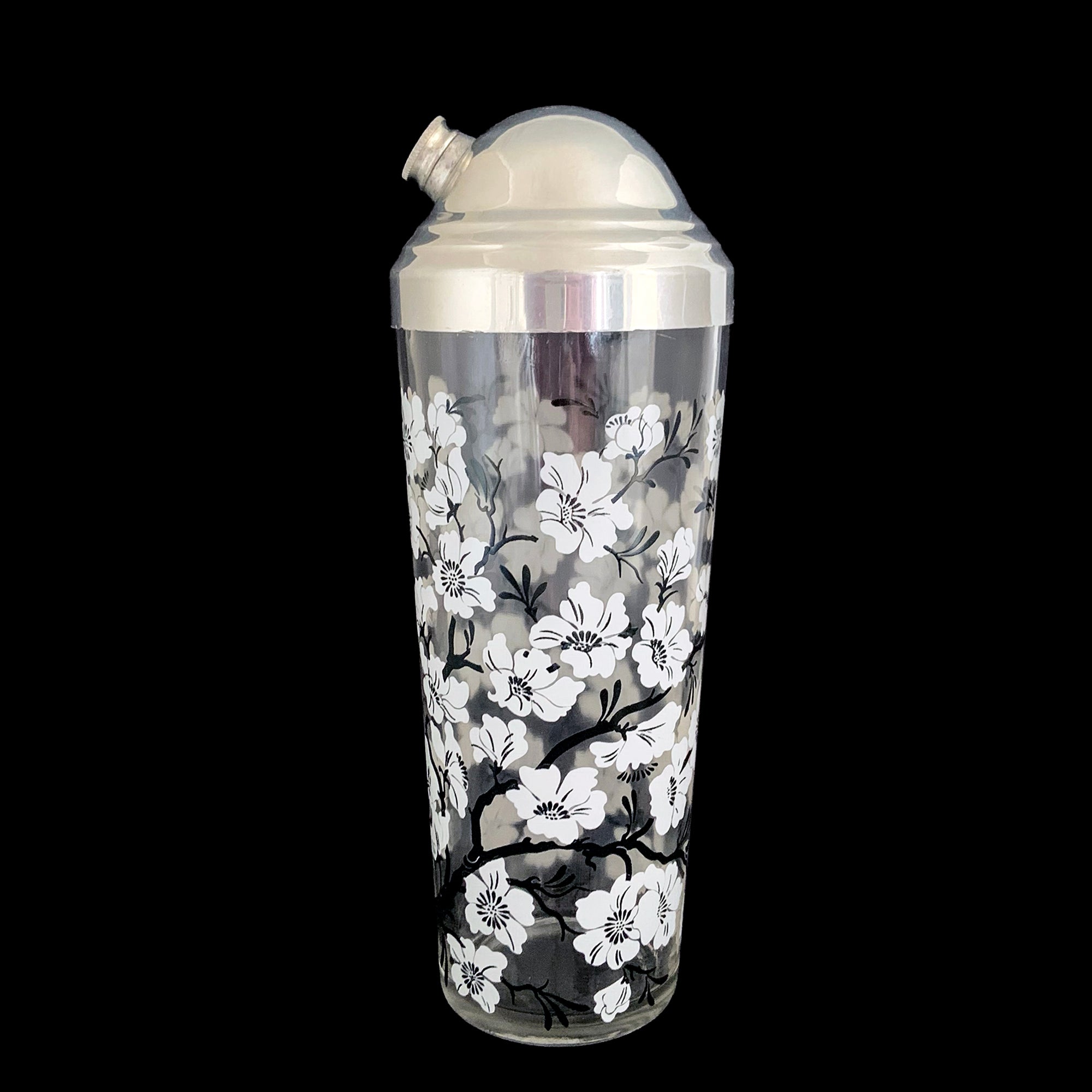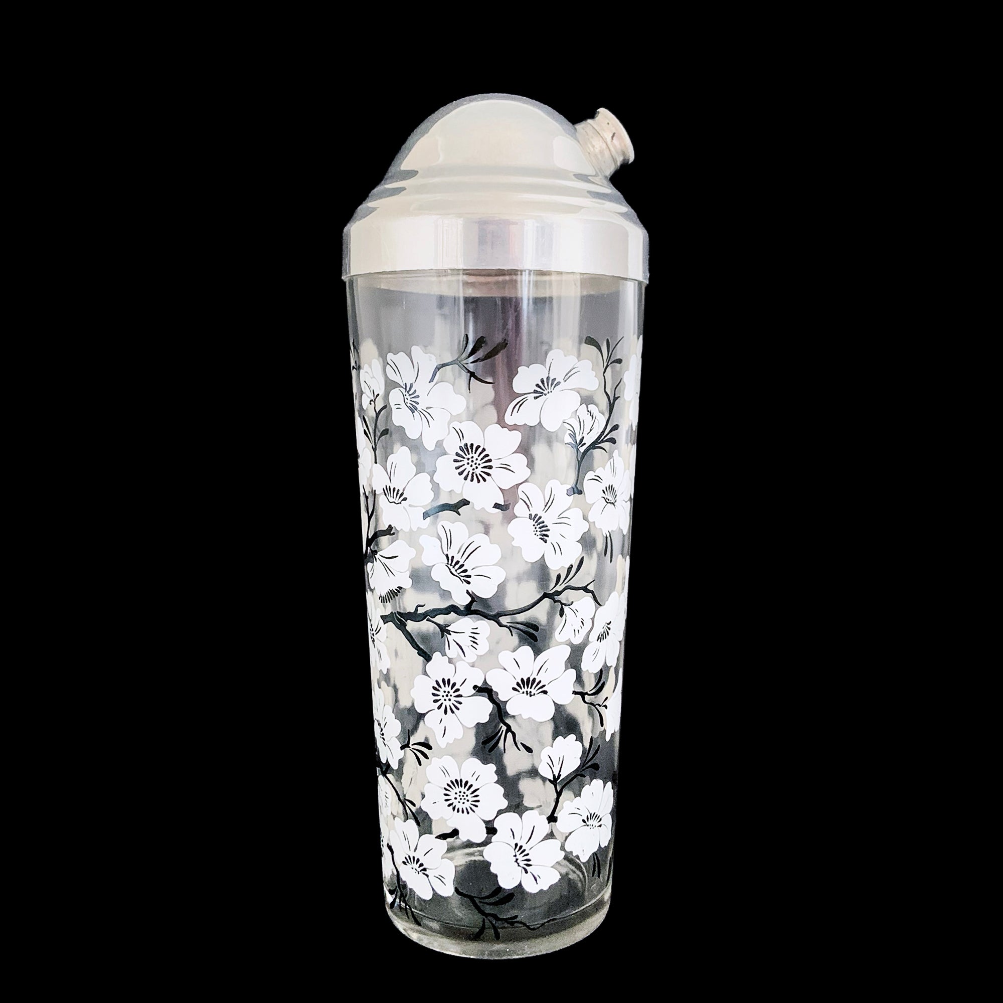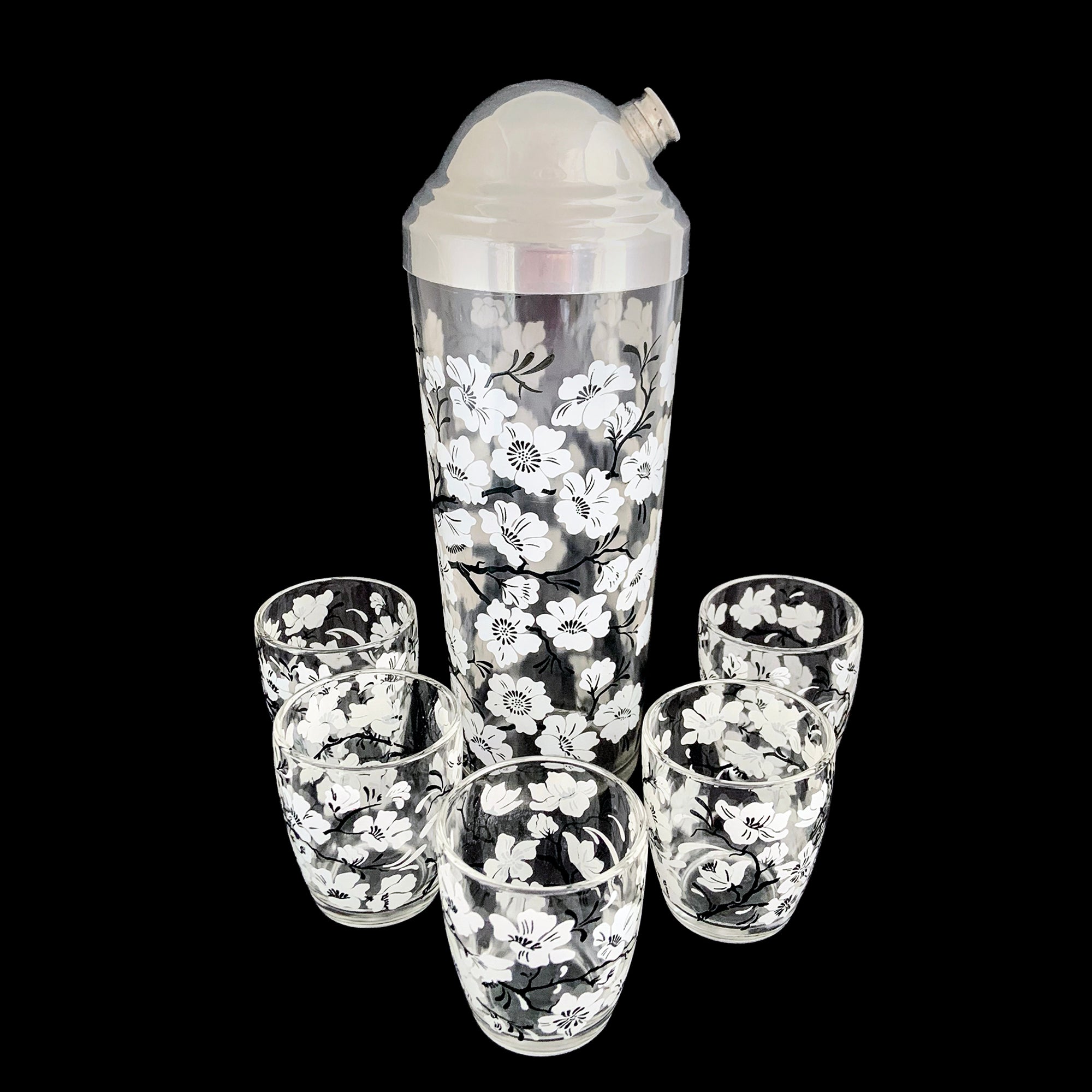 Jacks Daughter of All Trades Vintage Antique Mid-Century Kitsch Store Shop Reseller Etsy Shopify Toronto Canada Free Porch Pick Up Local Delivery Worldwide Shipping Judy Weinberg Unique Housewarming Gift Sustainable Gift Wedding Gift Home Decor Collectible Collector Gift Farmhouse Cottagecore Cottage Lodge Shabby Chic Industrial Hollywood Regency Art Deco Chinoiserie white Dogwood flower cocktail shaker matching glasses Hazel-Atlas Glass 1930s 1940s Mad Men barware