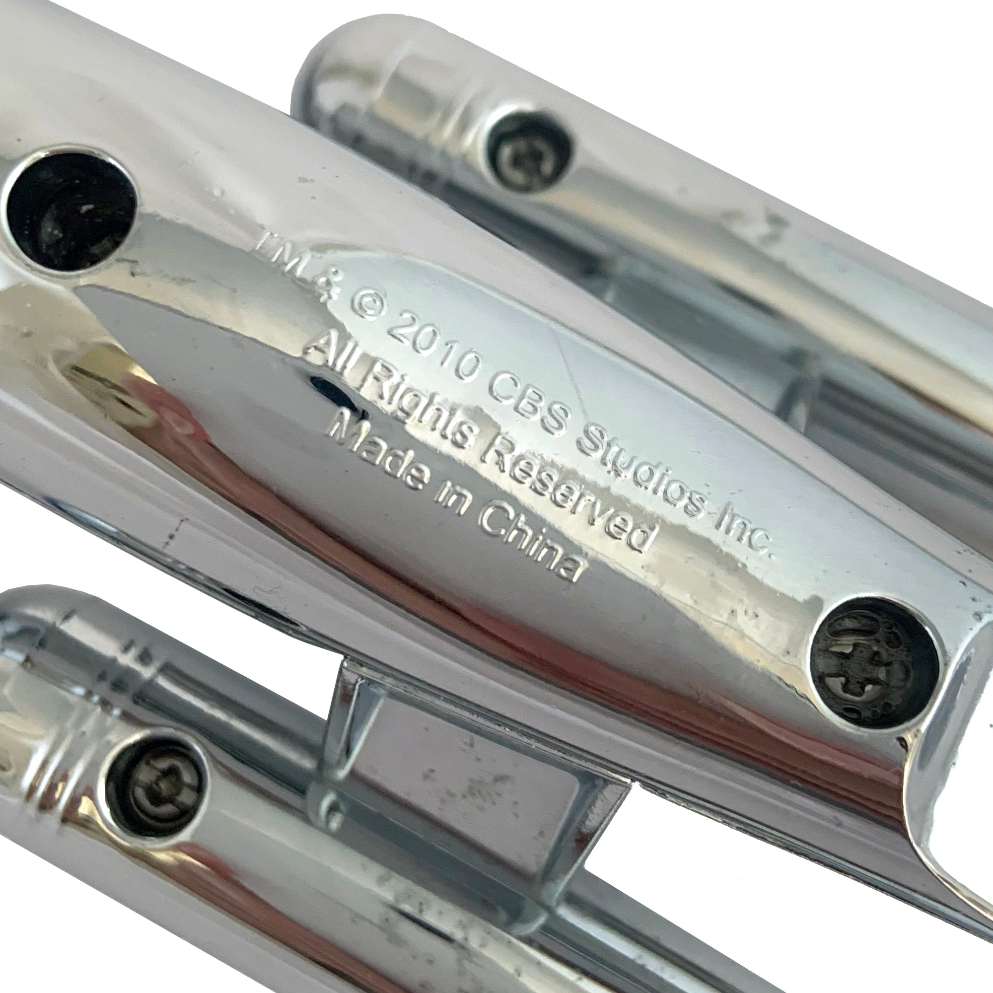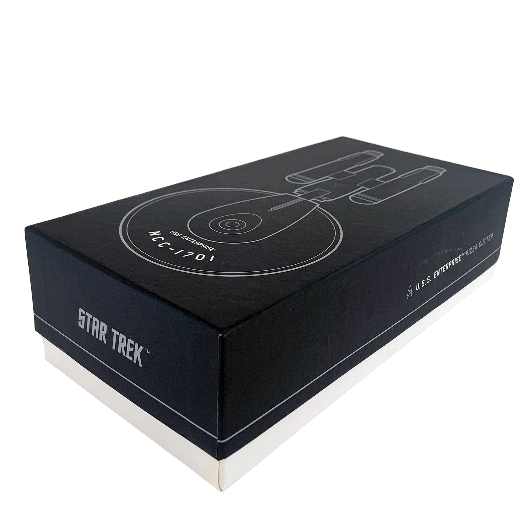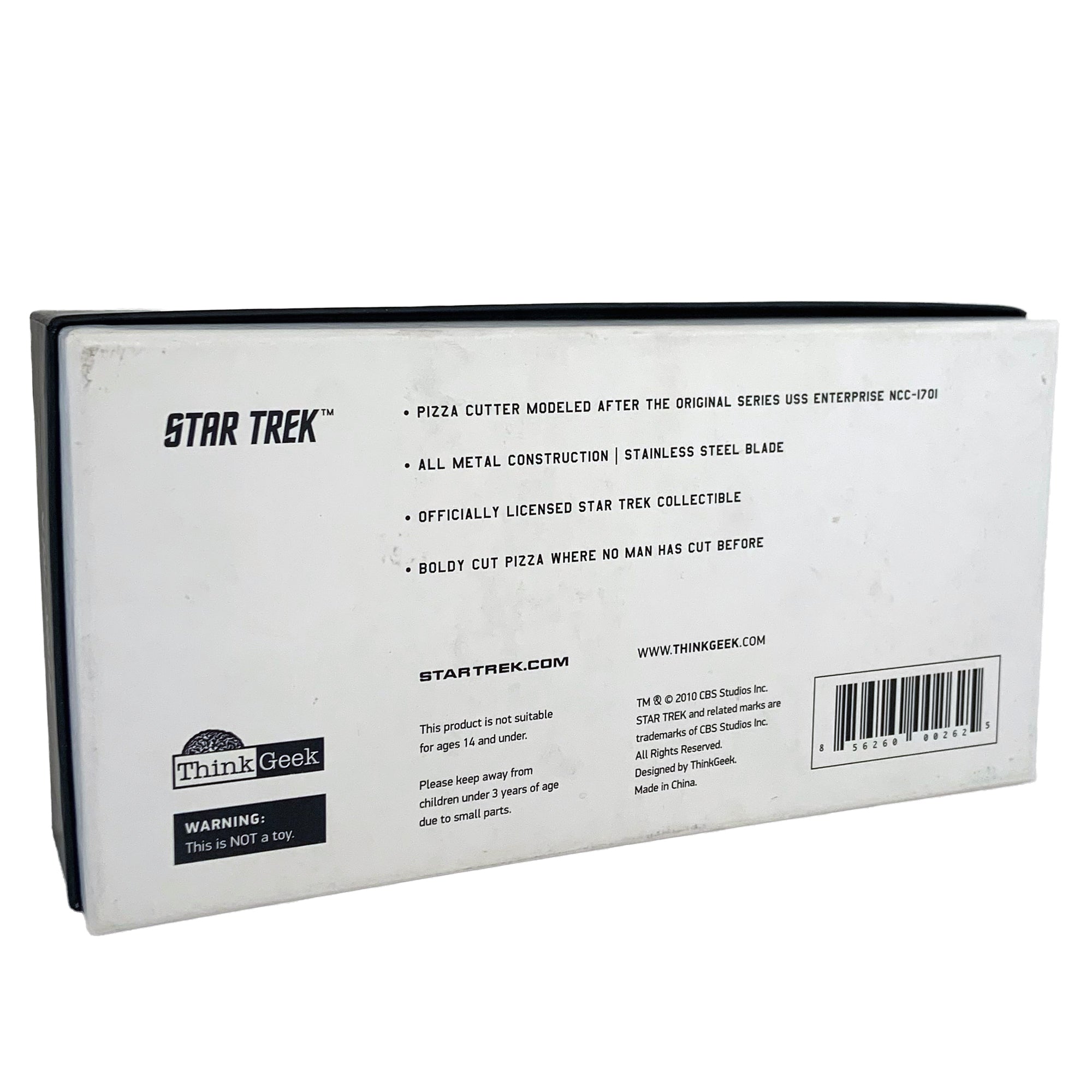 New in box Star Trek USS Enterprise NCC-1701 pizza cutter modeled after the original series. Made of all metal construction with a stainless steel blade. Officially licensed Star Trek collectible, designed by Think Geek™ 2010. Boldly cut pizza where no man has cut before!