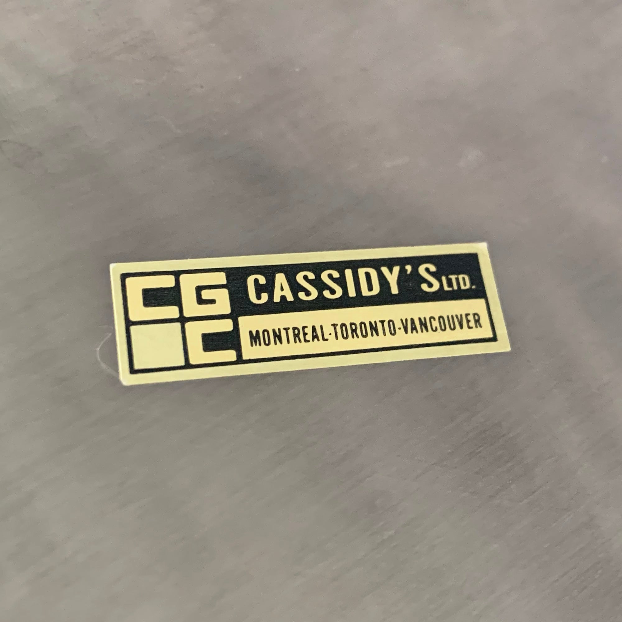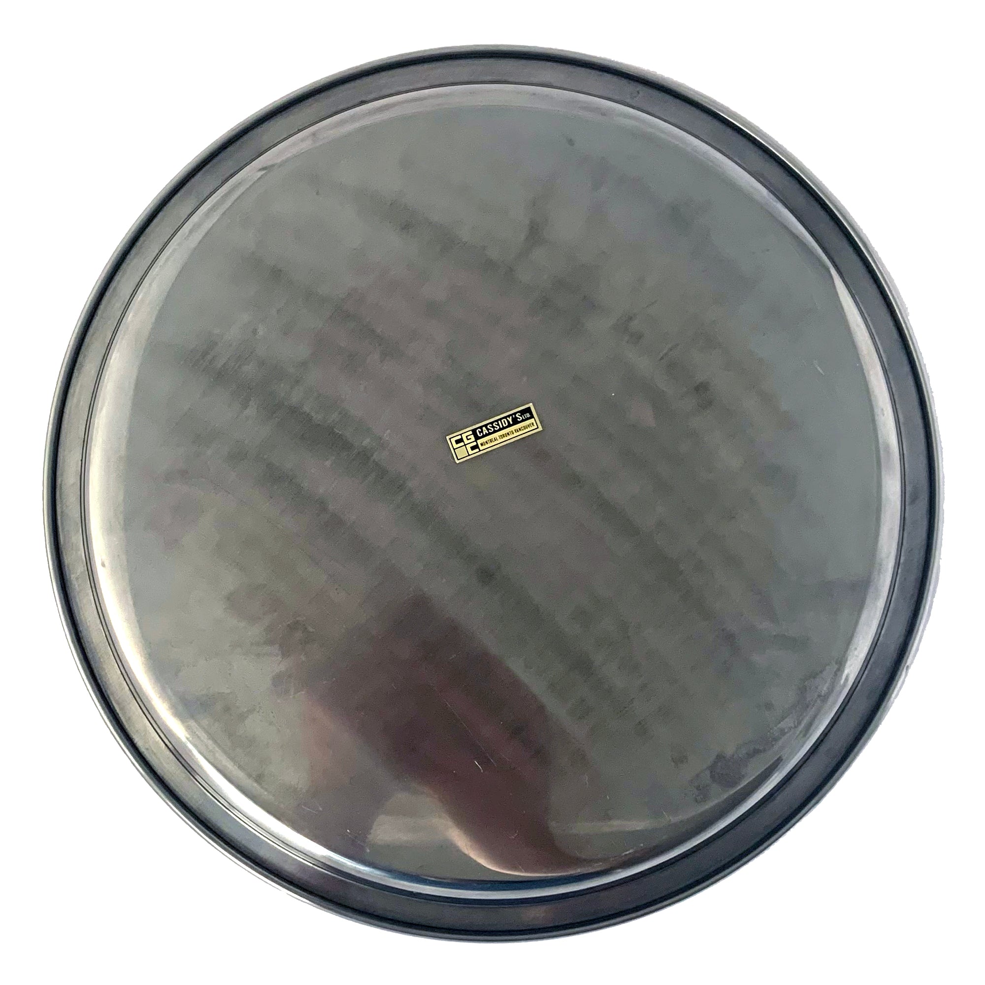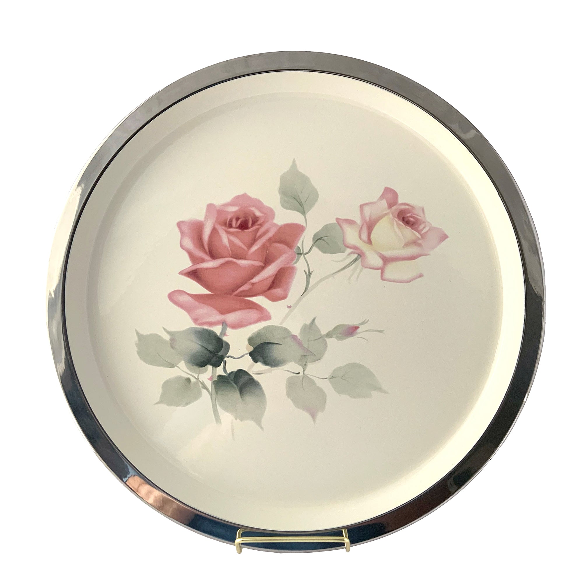 Vintage round metal serving tray featuring an enamled design of pink roses on a cream ground, with polished rim. Crafted by Cassidy's Ltd. Canada, 1960s. A gorgeous way to serve your guests or use as decor.