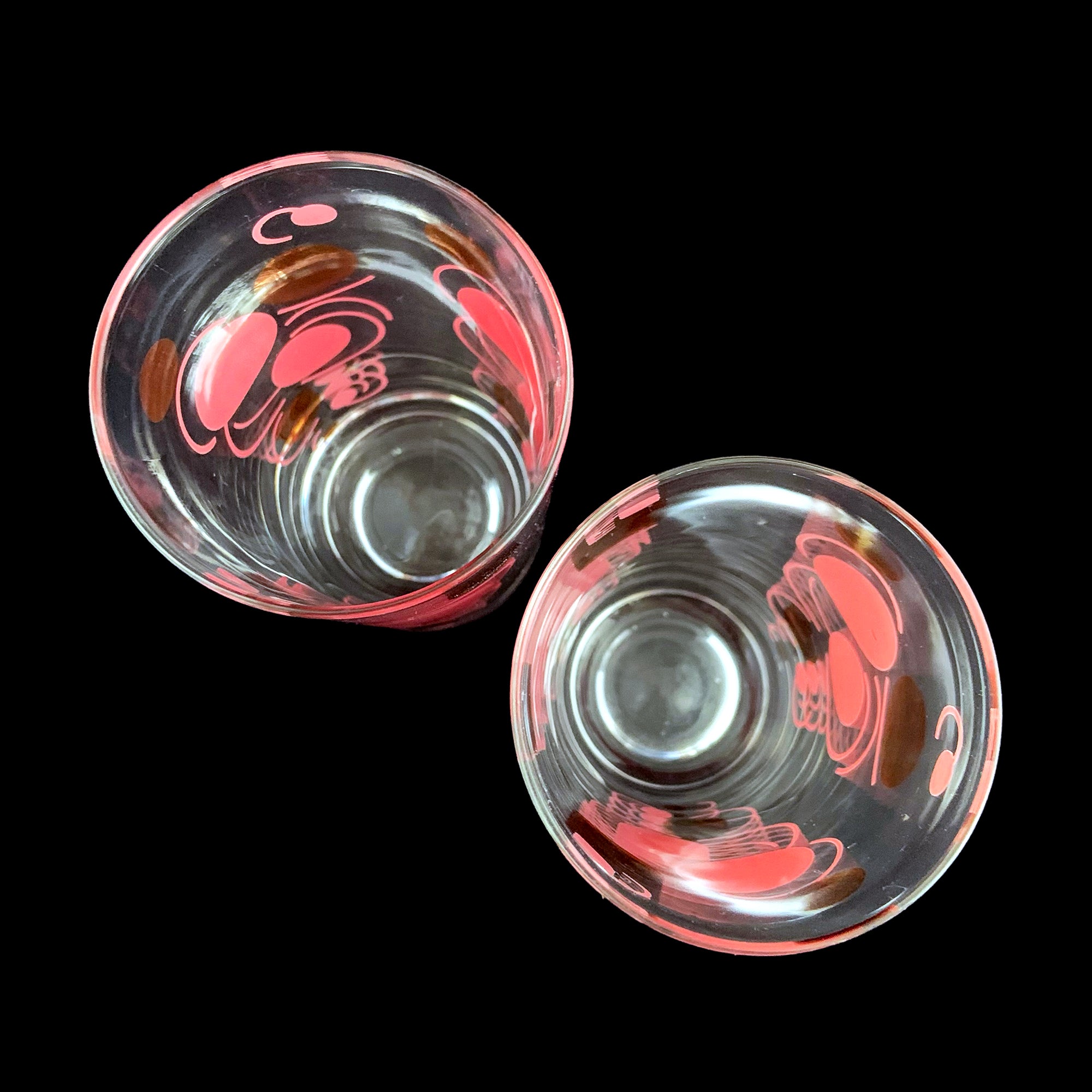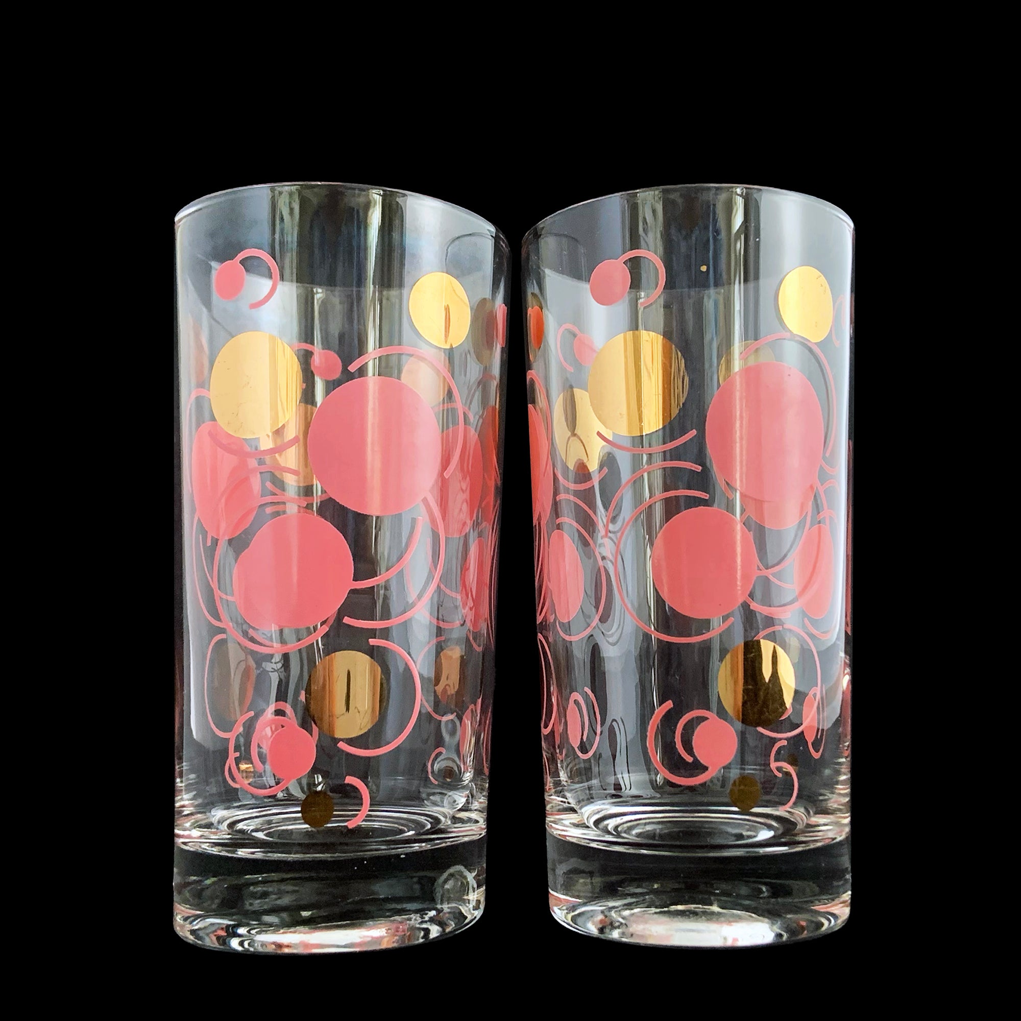 Vintage mid century era pink and gold "Atomic Dots" cocktail glass tumblers. Crafted by Federal Glass, USA, circa 1950s. These hard-to-find tumblers are spectacular with their effervescent rising bubbles. They are sure to be the stars of your bar cart...cheers!