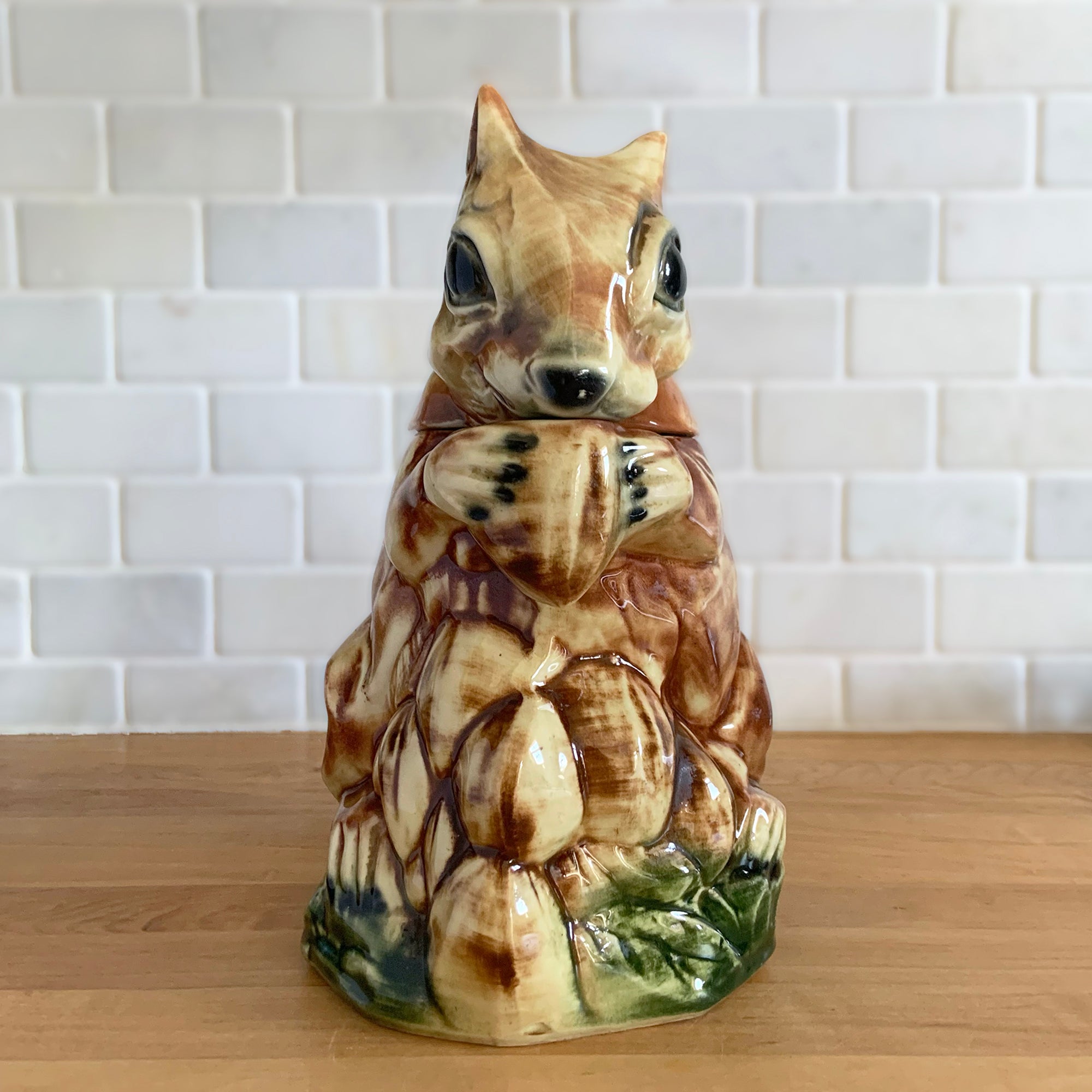 Jacks Daughter of All Trades Vintage Antique Mid-Century Kitsch Store Shop Reseller Etsy Shopify Toronto Canada Free Porch Pick Up Local Delivery Worldwide Shipping Judy Weinberg Unique Housewarming Gift Sustainable Gift Wedding Gift Home Decor Collectible Collector Gift Farmhouse Cottagecore Cottage Lodge Shabby Chic Industrial Animal  rare vintage retro figural brown squirrel ceramic cookie jar McCoy Pottery 1950s food storage kitchen decor gift for him gift for her