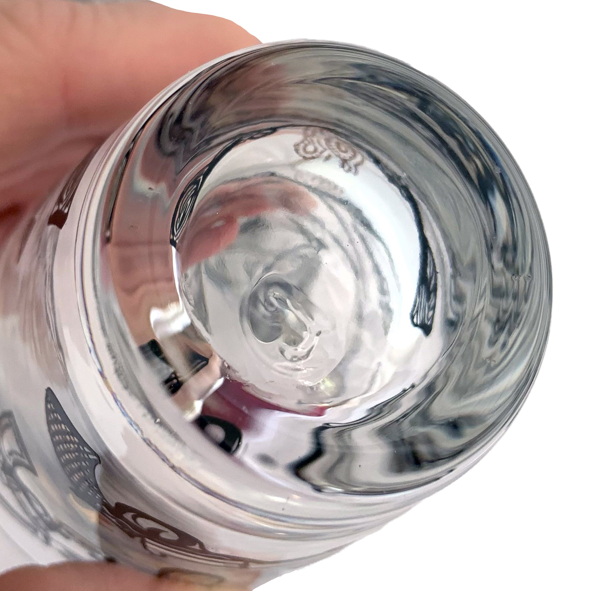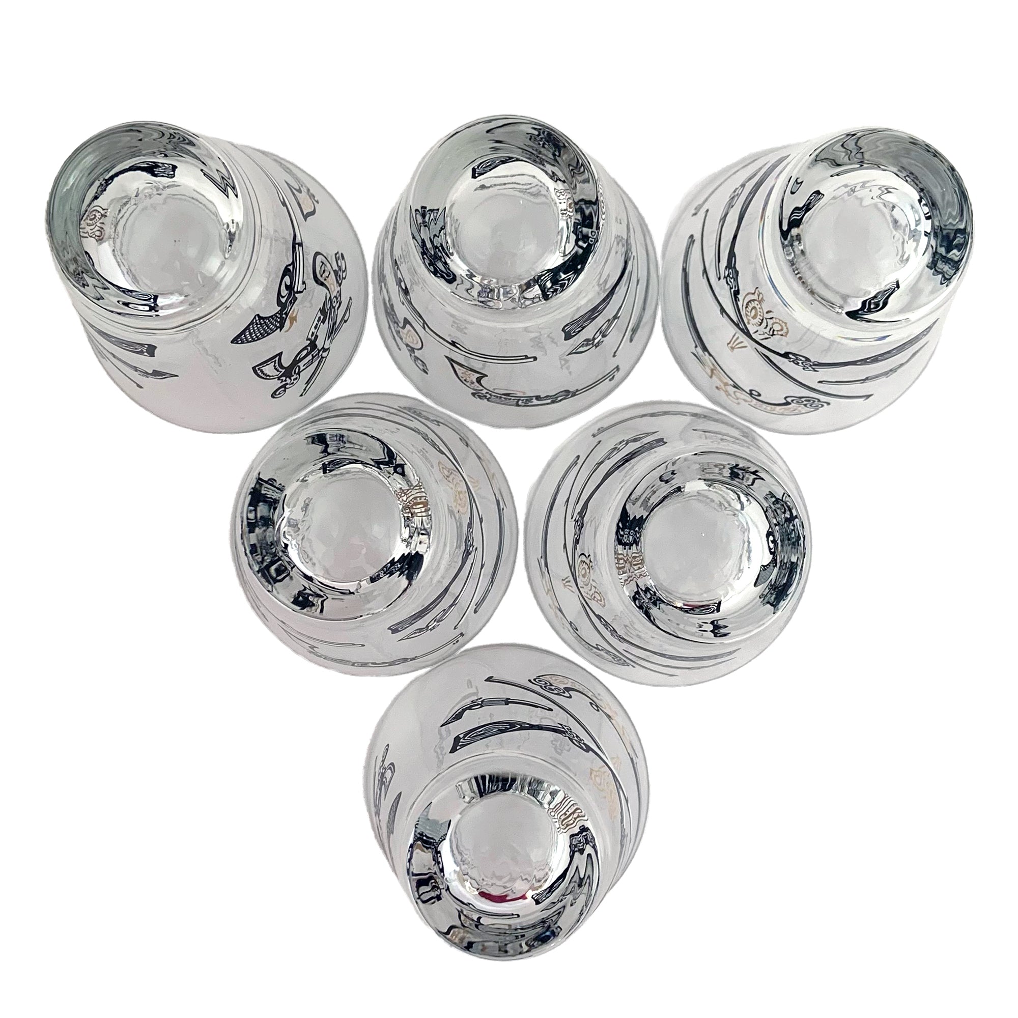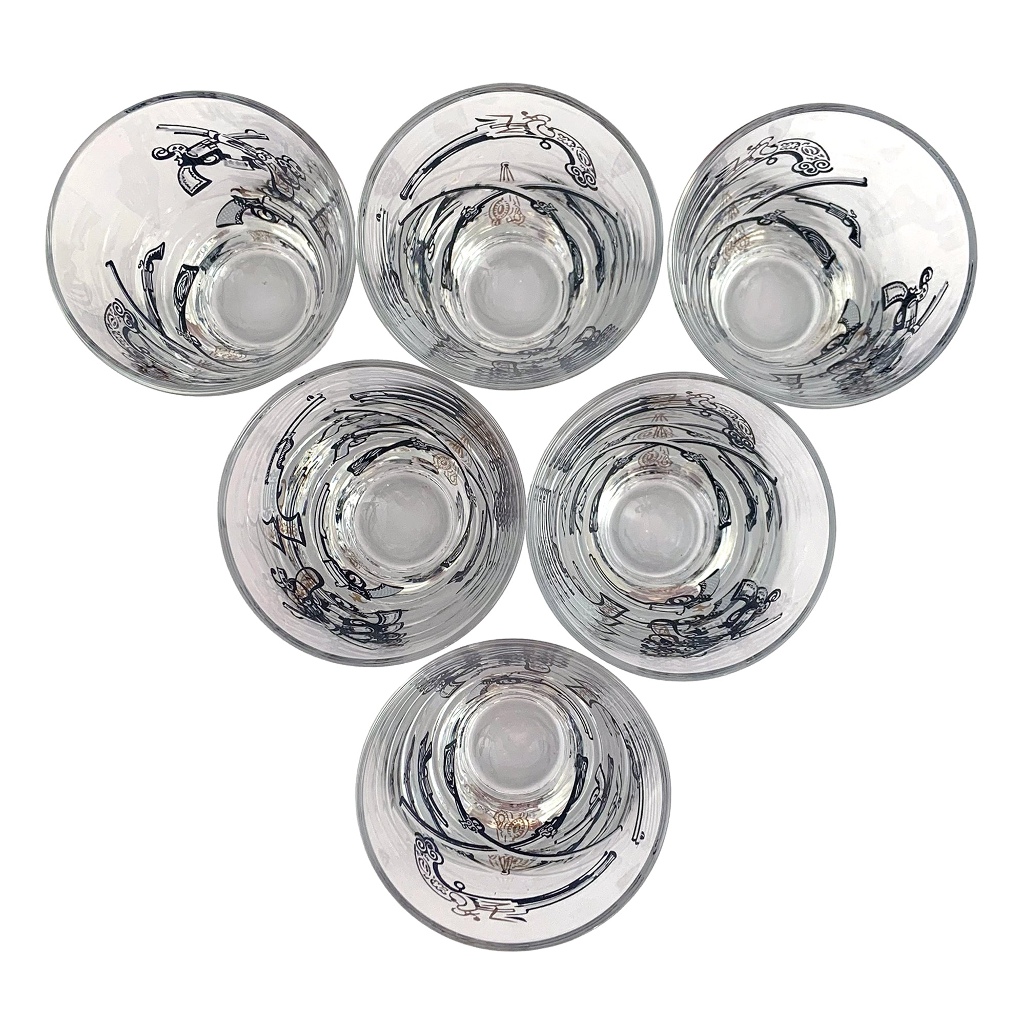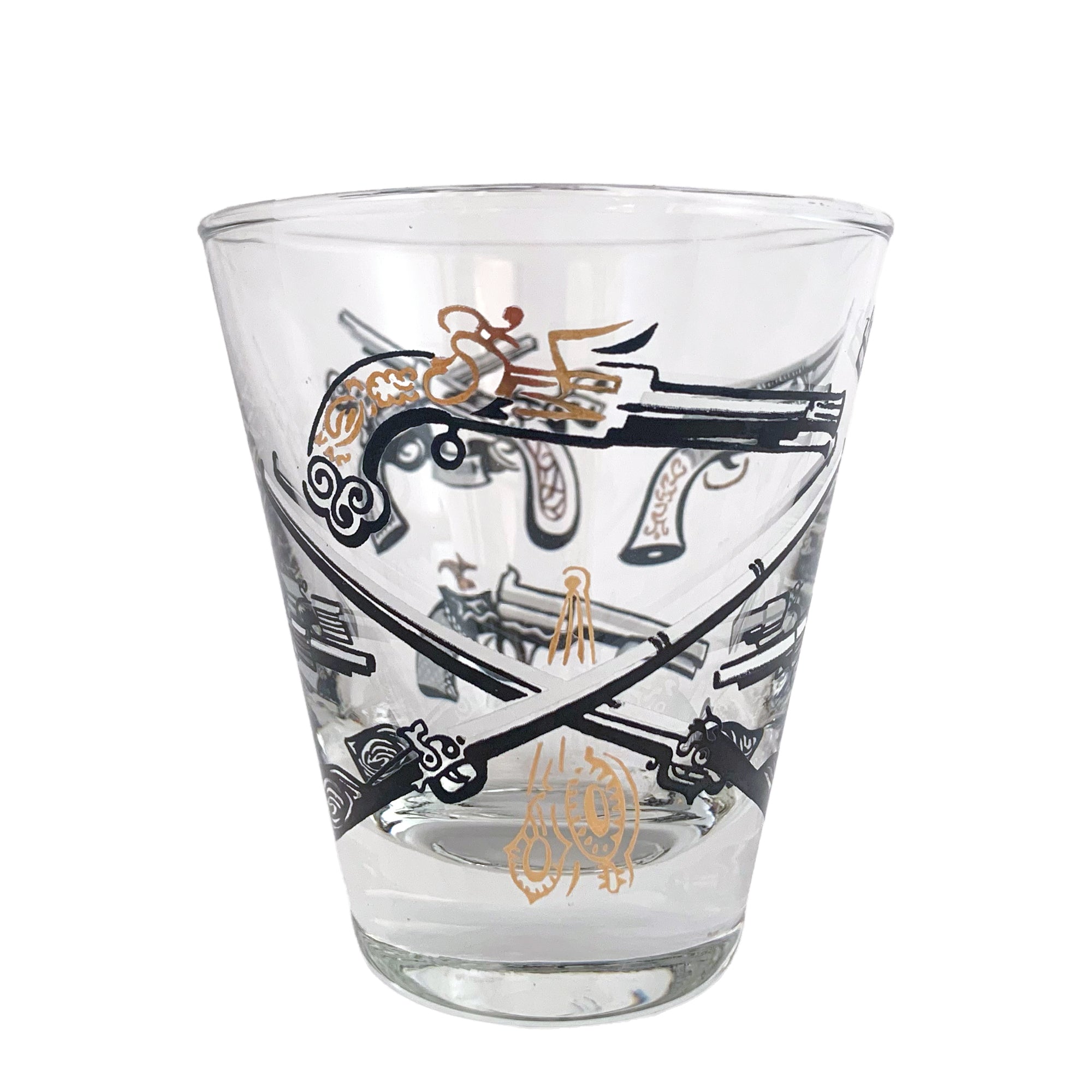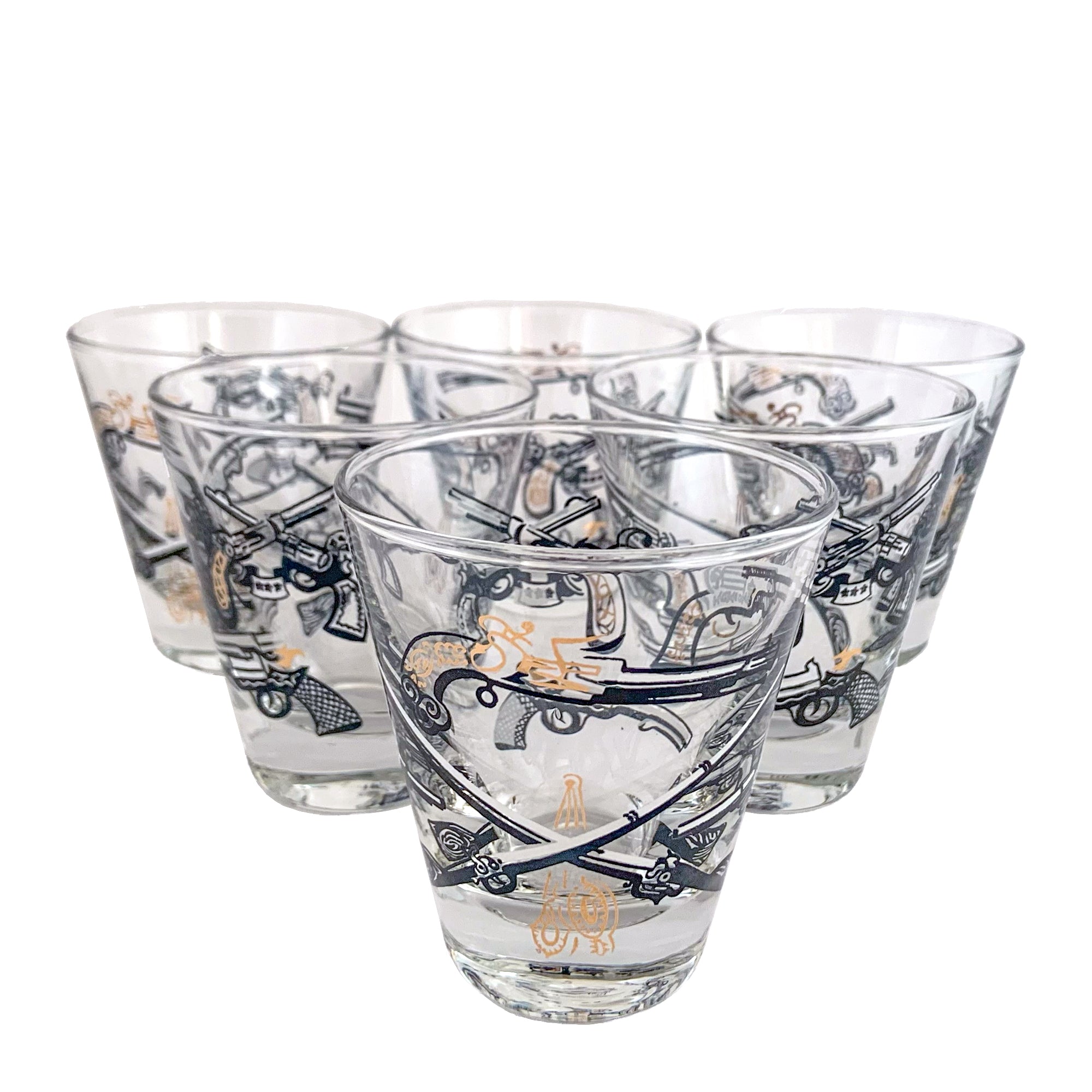 Set of Six Vintage Wild West Double Shot Glasses w/ Revolver and Pistol Motif in Black White Gold, Libbey Glass, USA