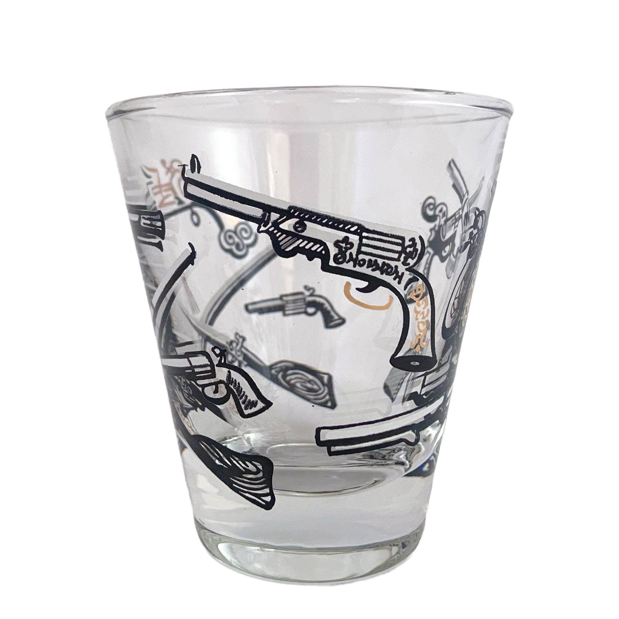 Set of six vintage wild west themed double shot glasses featuring revolvers and pistols in black, white and gold. Crafted by Libbey Glass, circa 1950s. A great addition to your barware collection!