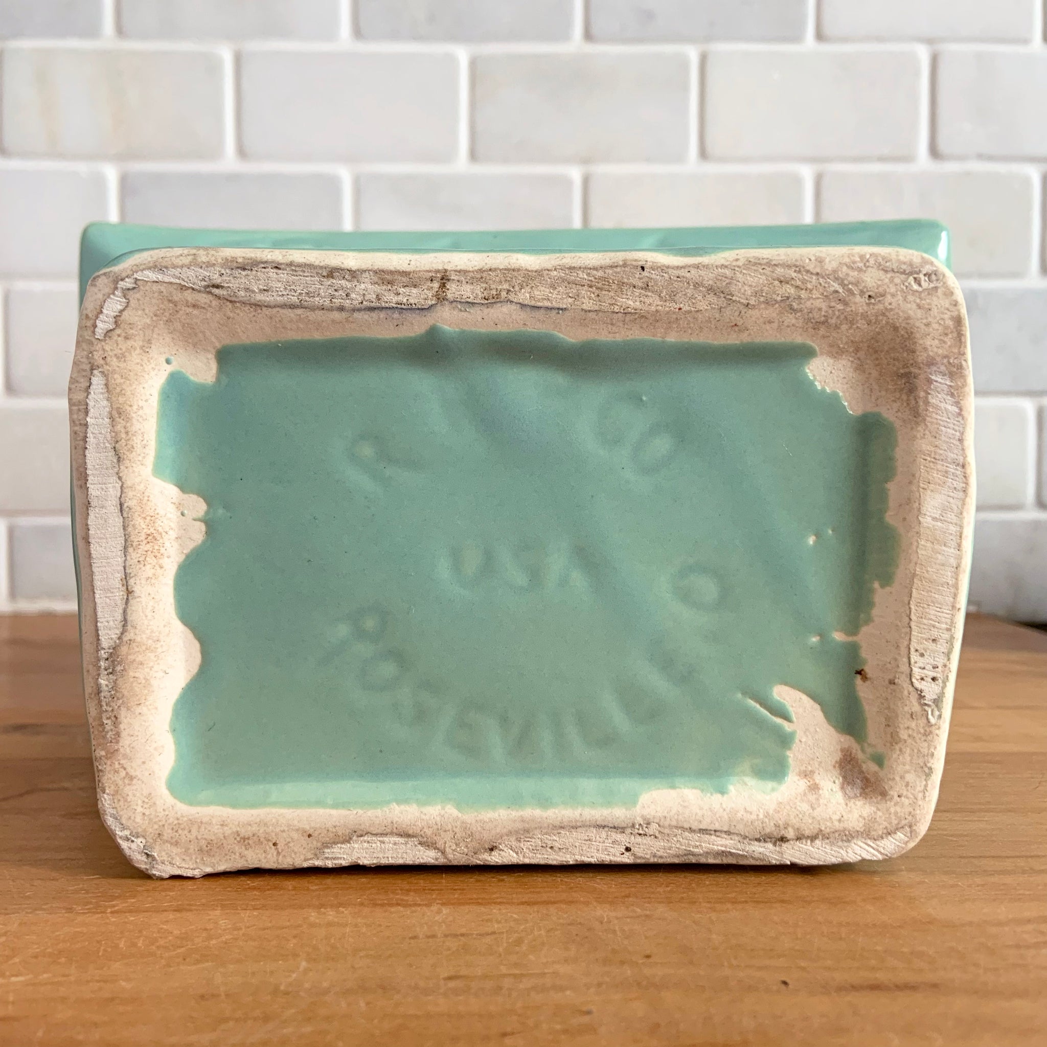 Vintage aqua glaze rectangular ceramic stoneware pedestal planter featuring an impressed pattern. Crafted by Robinson Ransbottom Pottery Co., USA, 1950s. A beautiful piece to add to your art pottery collection and plant up your favourite succulents or houseplant!