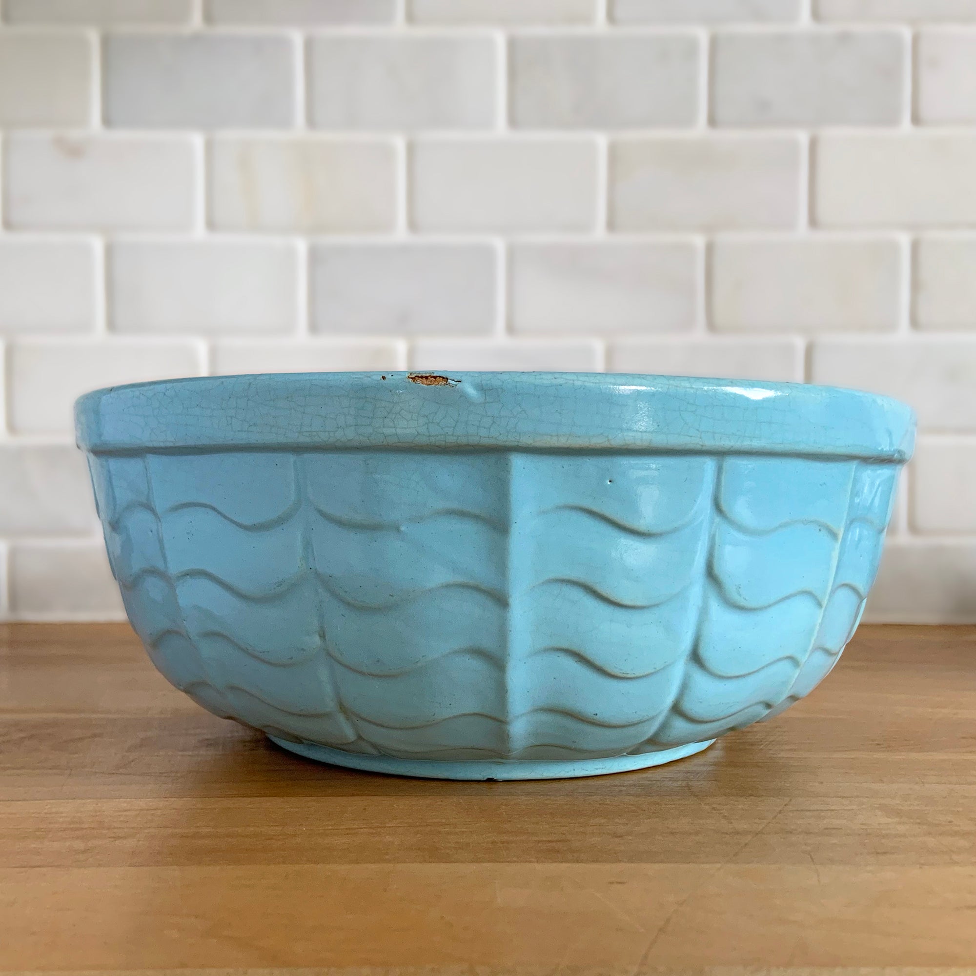 Vintage blue ceramic mixing/serving bowl 308, with an exterior pattern of horizontal waves. Crafted by Robinson Ransbottom Pottery Co., USA, 1960s. A beautiful piece to add to your art pottery collection!