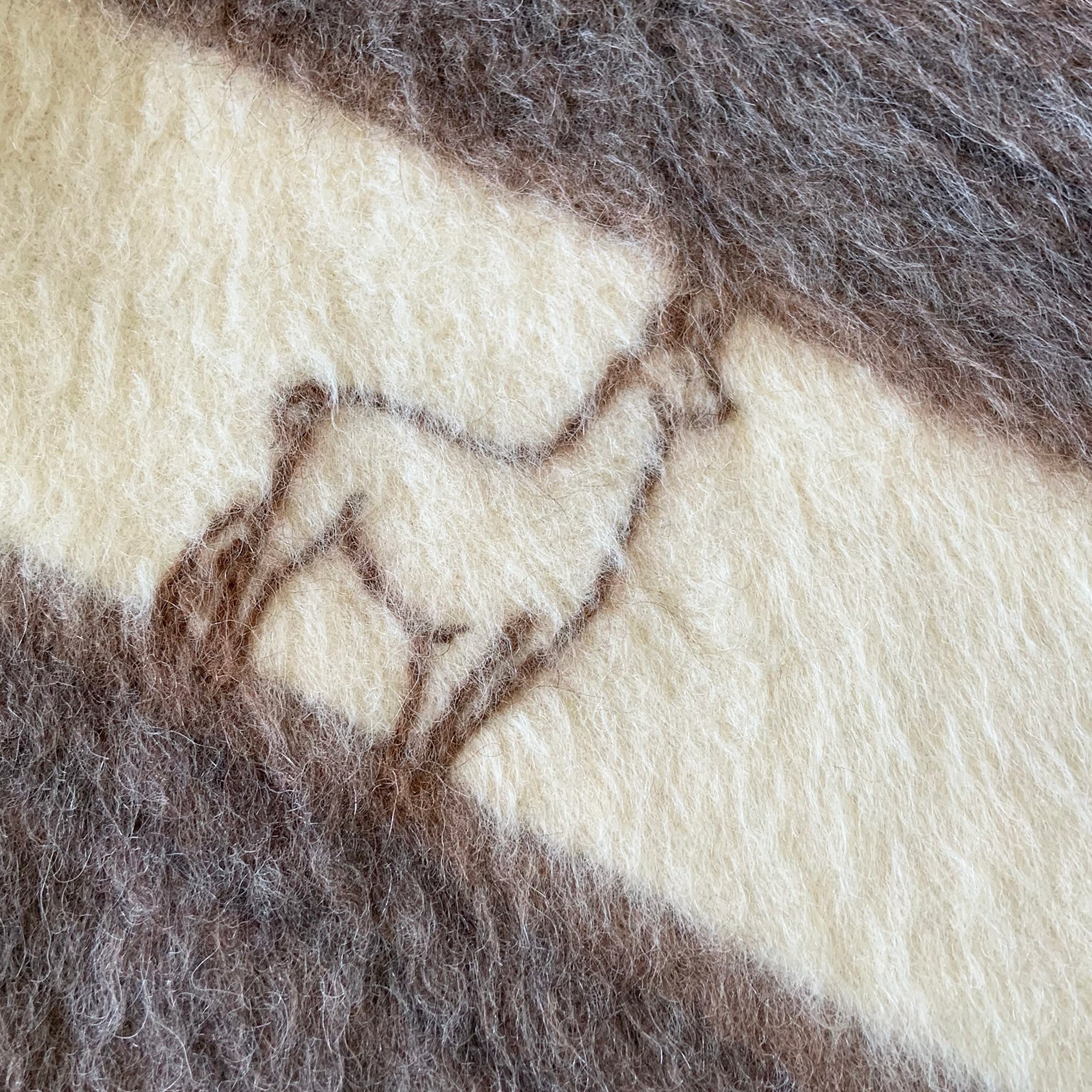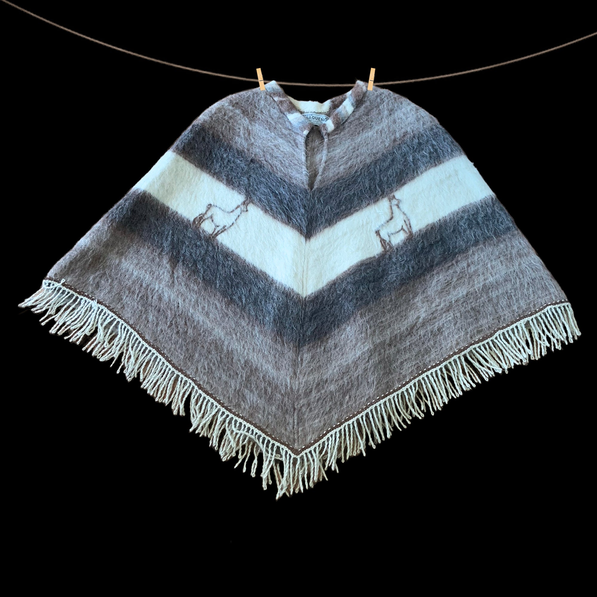 Charming vintage Boho-inspired split v-neck poncho, boasting a beautiful striped pattern in brown, mocha, and cream. The addition of a playful llama motif and fringed hem adds a touch of whimsy. This poncho is the perfect blend of style and comfort crafted from 50% llama/alpaca and 50% Merino wool, crafted by Poncho Quiaqueño, Argentina. A fabulous fashion statement to stay warm on those chilly days.