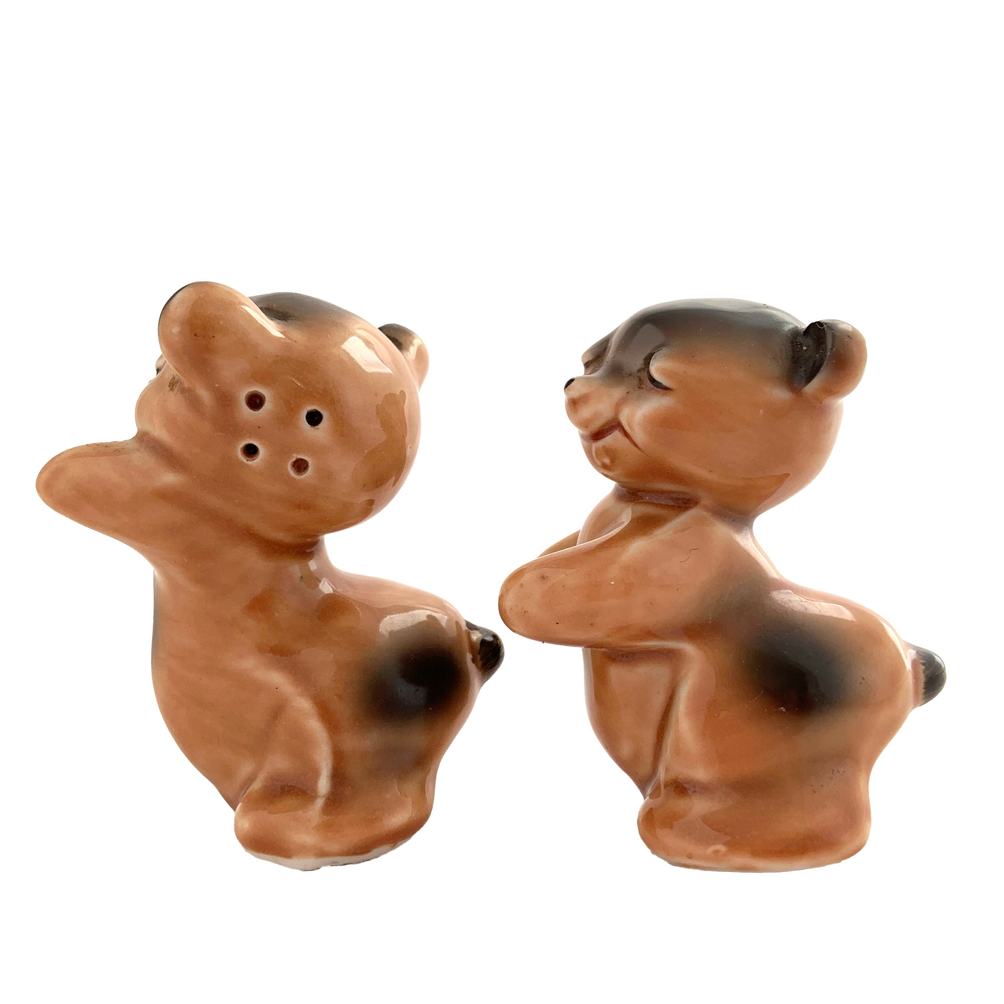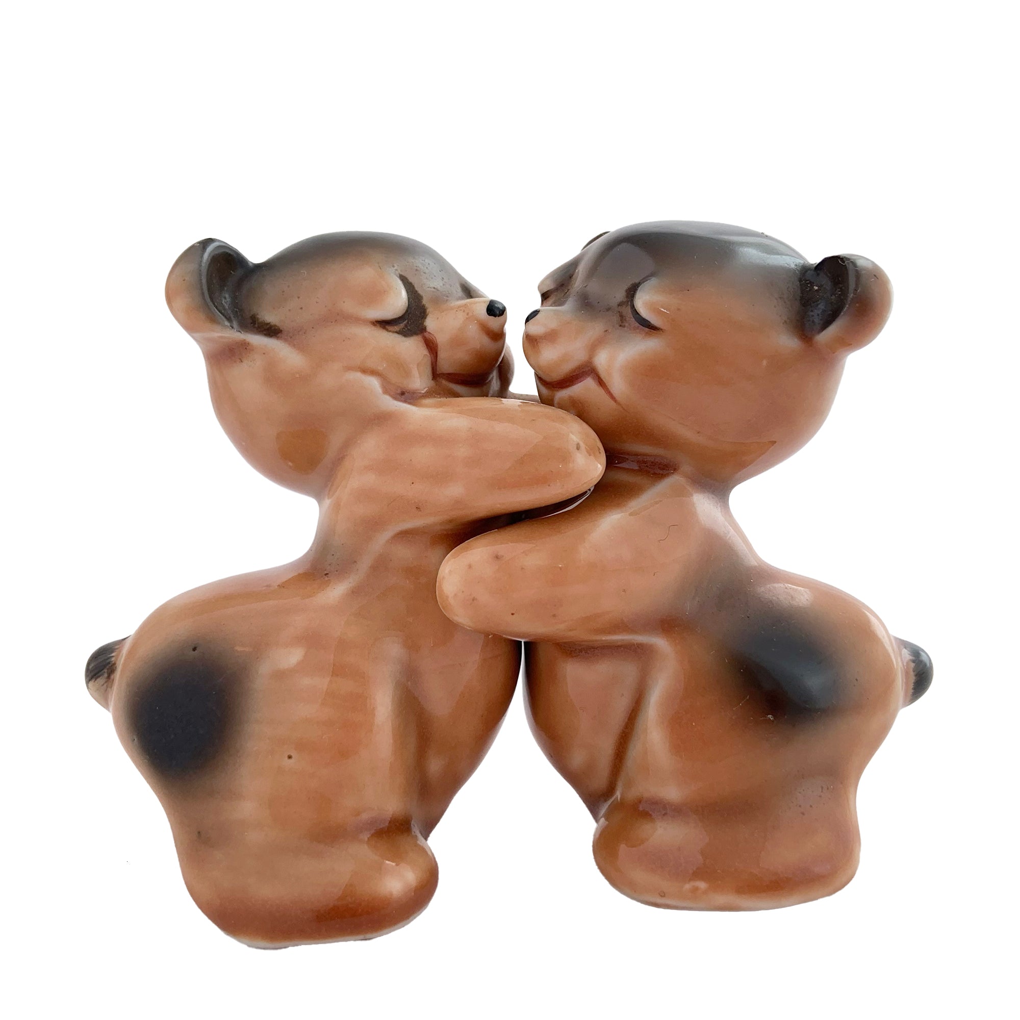 Vintage hand painted brown Snuggle Hugs hugging bears salt and pepper shakers. Designed by Ruth Van Tellingen, USA, 1940s. Add these adorable kitschy shakers to your collection!