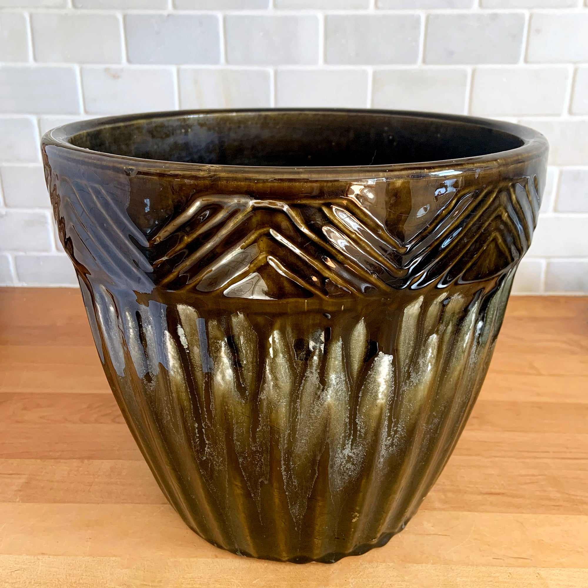 • Load image into Gallery viewer, Jacks Daughter of All Trades Vintage Antique Mid-Century Modern Store Shop Reseller Etsy Shopify Toronto Canada Free Porch Pick Up Local Delivery Worldwide Shipping Judy Weinberg Unique Housewarming Wedding Sustainable Home Decor Collectible Collector Gift Farmhouse Cottagecore Cottage Grannycore Shabby Chic Industrial Gardener Container Garden glossy moss green brown drip glaze ceramic jardiniere planter featuring ribbed body chevron band Robinson Ransbottom Pottery Co 1960s art pottery
