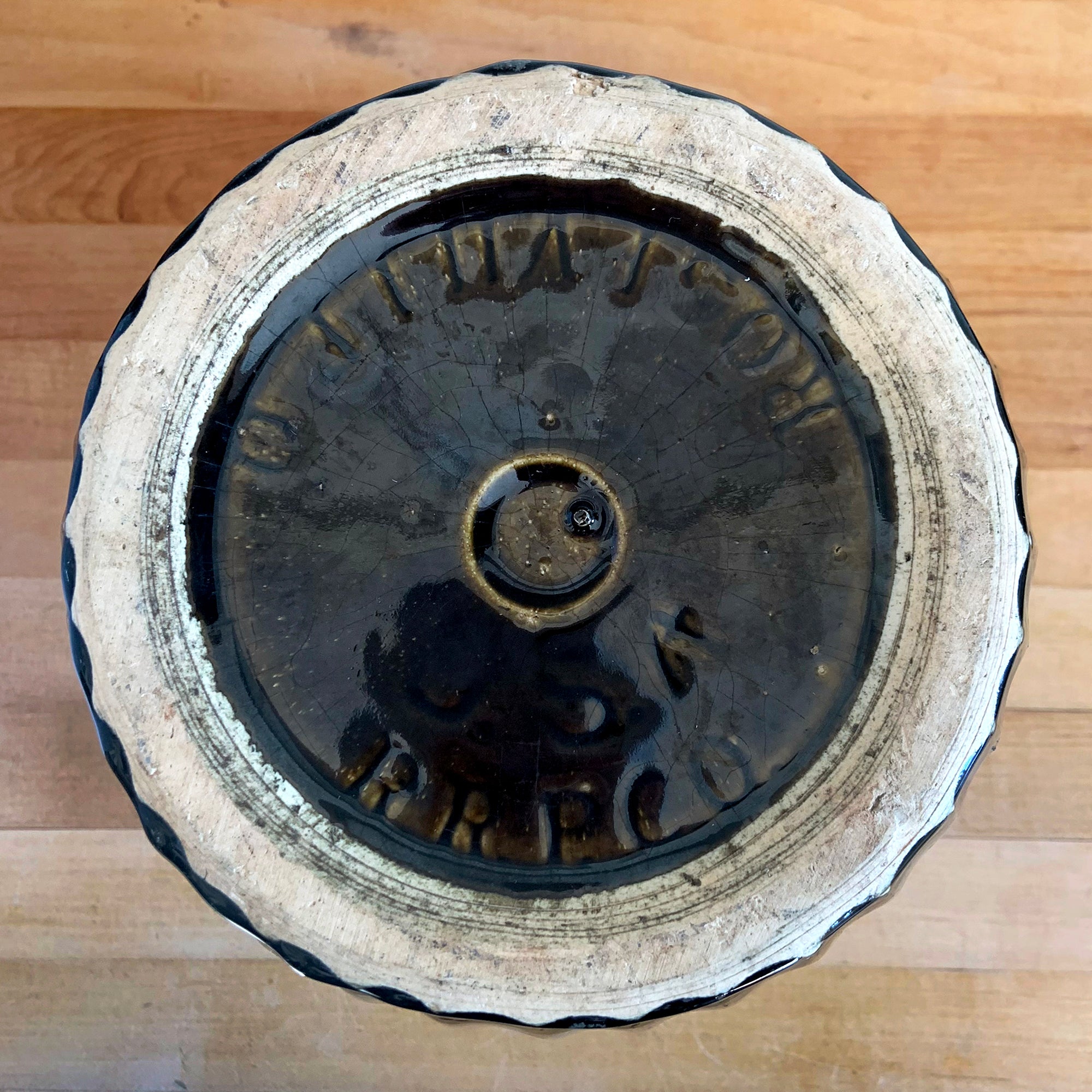 Jacks Daughter of All Trades Vintage Antique Mid-Century Modern Store Shop Reseller Etsy Shopify Toronto Canada Free Porch Pick Up Local Delivery Worldwide Shipping Judy Weinberg Unique Housewarming Wedding Sustainable Home Decor Collectible Collector Gift Farmhouse Cottagecore Cottage Grannycore Shabby Chic Industrial Gardener Container Garden glossy moss green brown drip glaze ceramic jardiniere planter featuring ribbed body chevron band Robinson Ransbottom Pottery Co 1960s art pottery