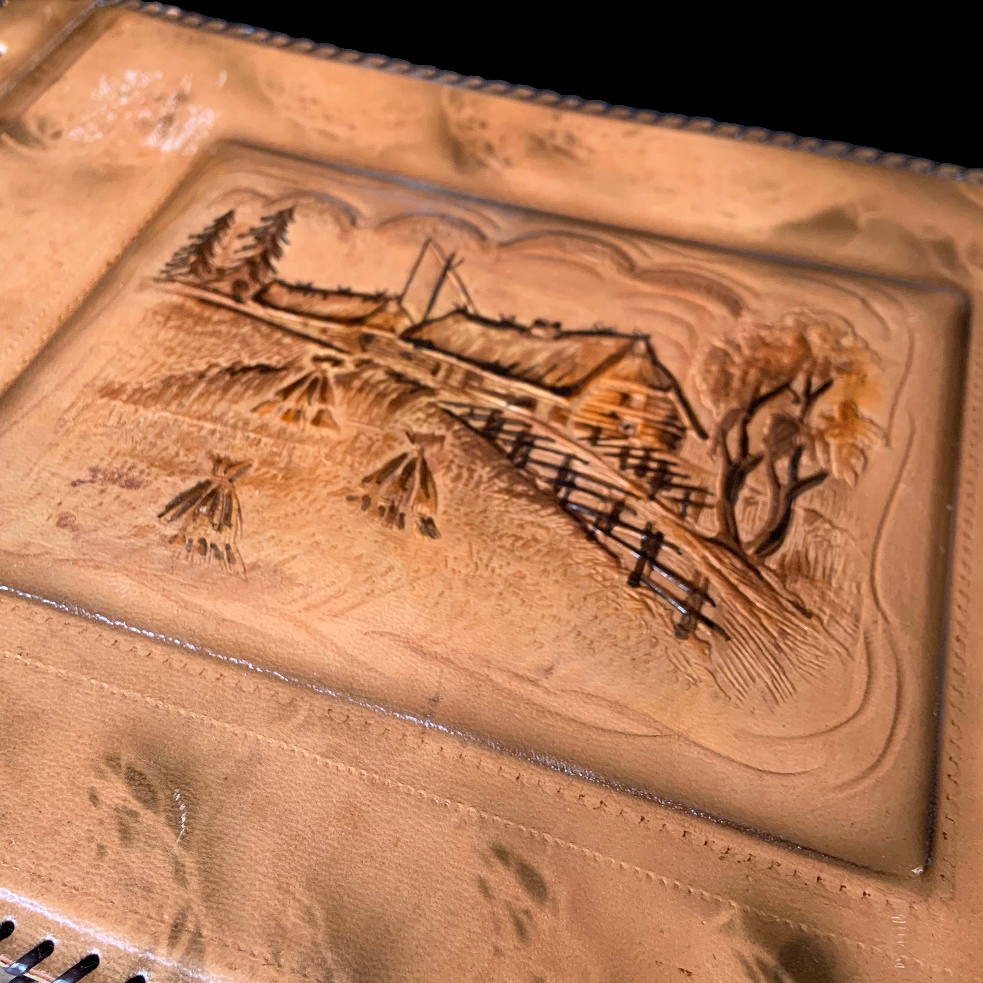Beautiful vintage mid-century era faux leather bound photo album featuring a tooled farmstead scene and stitched edge, contains 25 black pages separated with thin onion paper. Create your own book of precious memories with this charming album.