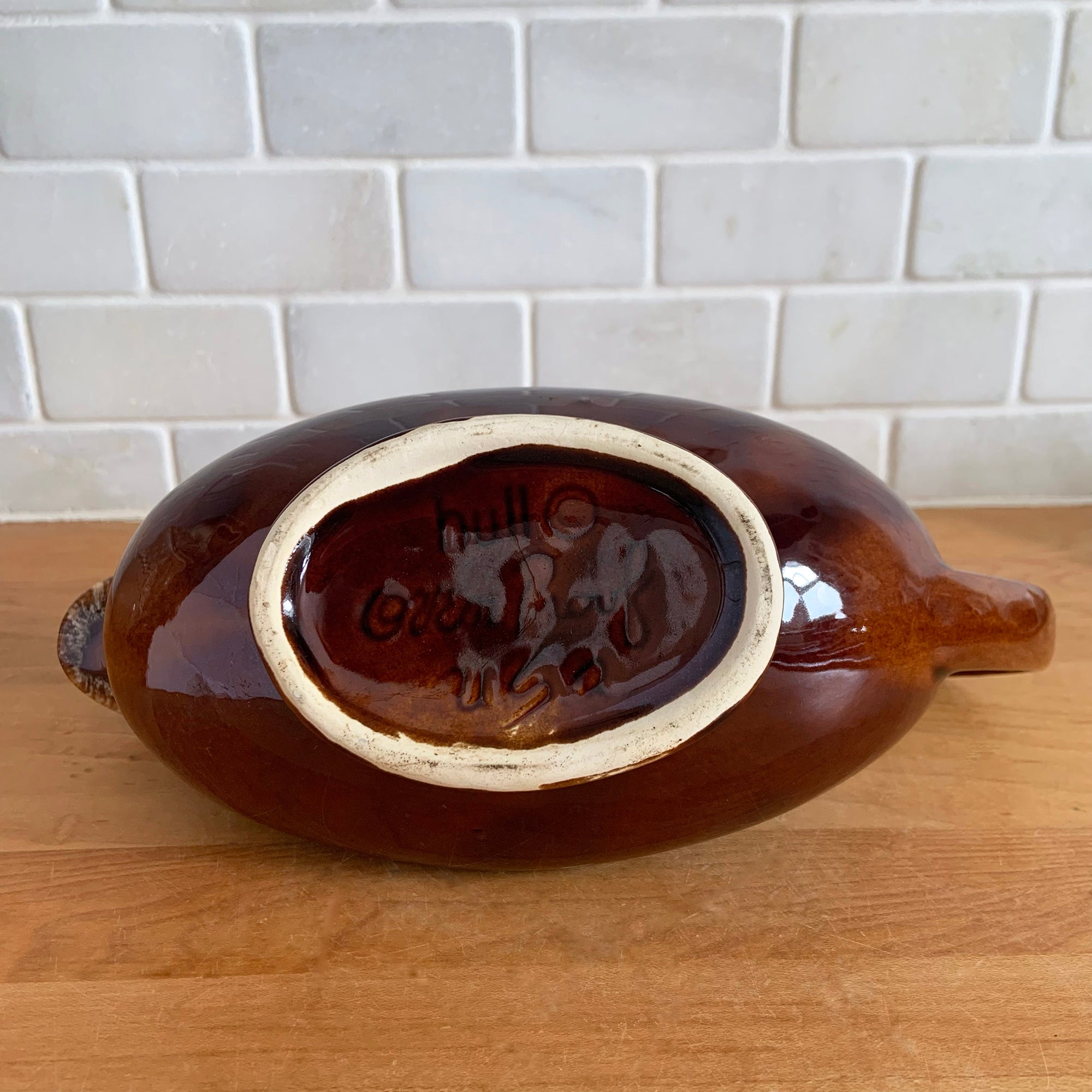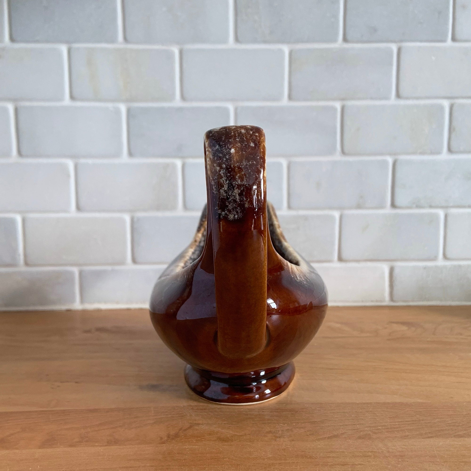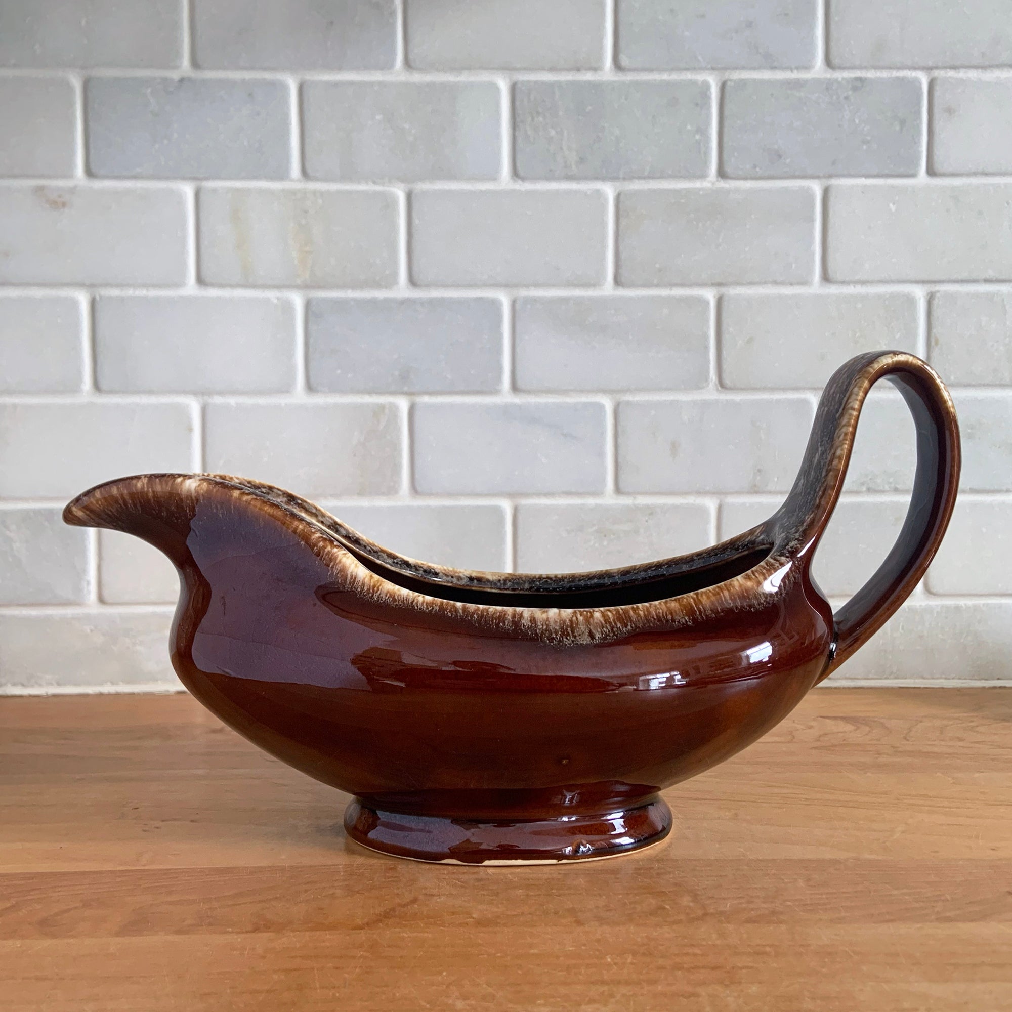 Vintage glossy brown drip glazed ceramic handled gravy boat. Crafted by Hull Pottery, USA, 1960s. A beautiful piece to add to your art pottery tableware collection!