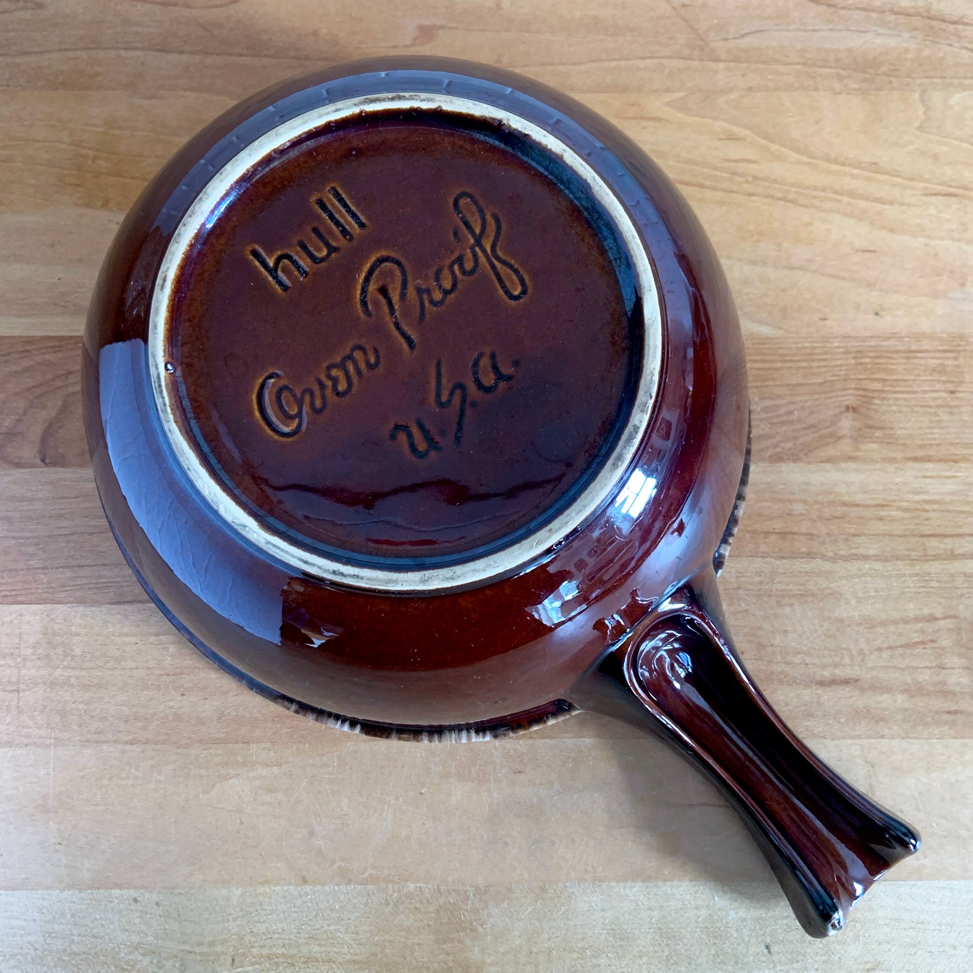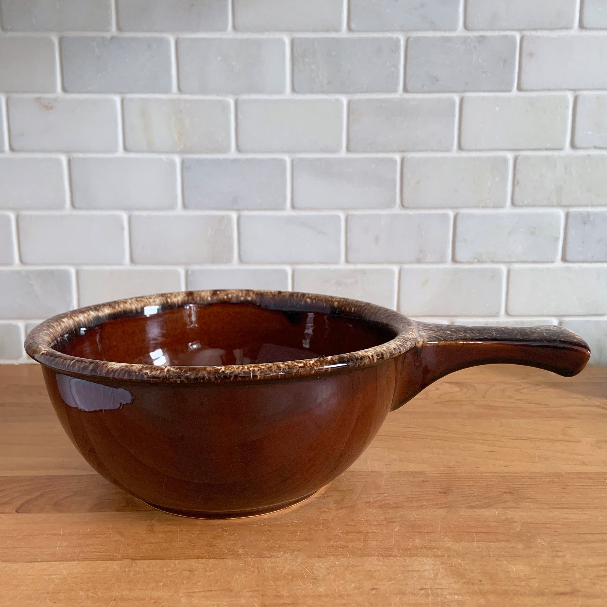 Vintage glossy brown drip glazed ceramic handled soup serving bowl. Crafted by Hull Pottery, USA, 1960s. A beautiful piece to add to your art pottery tableware collection!