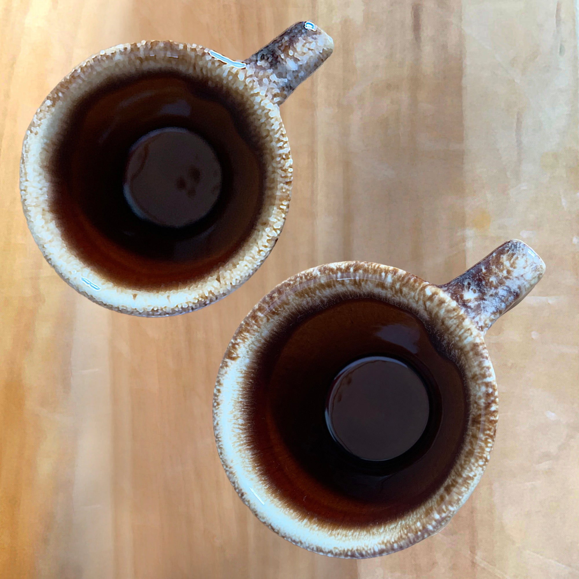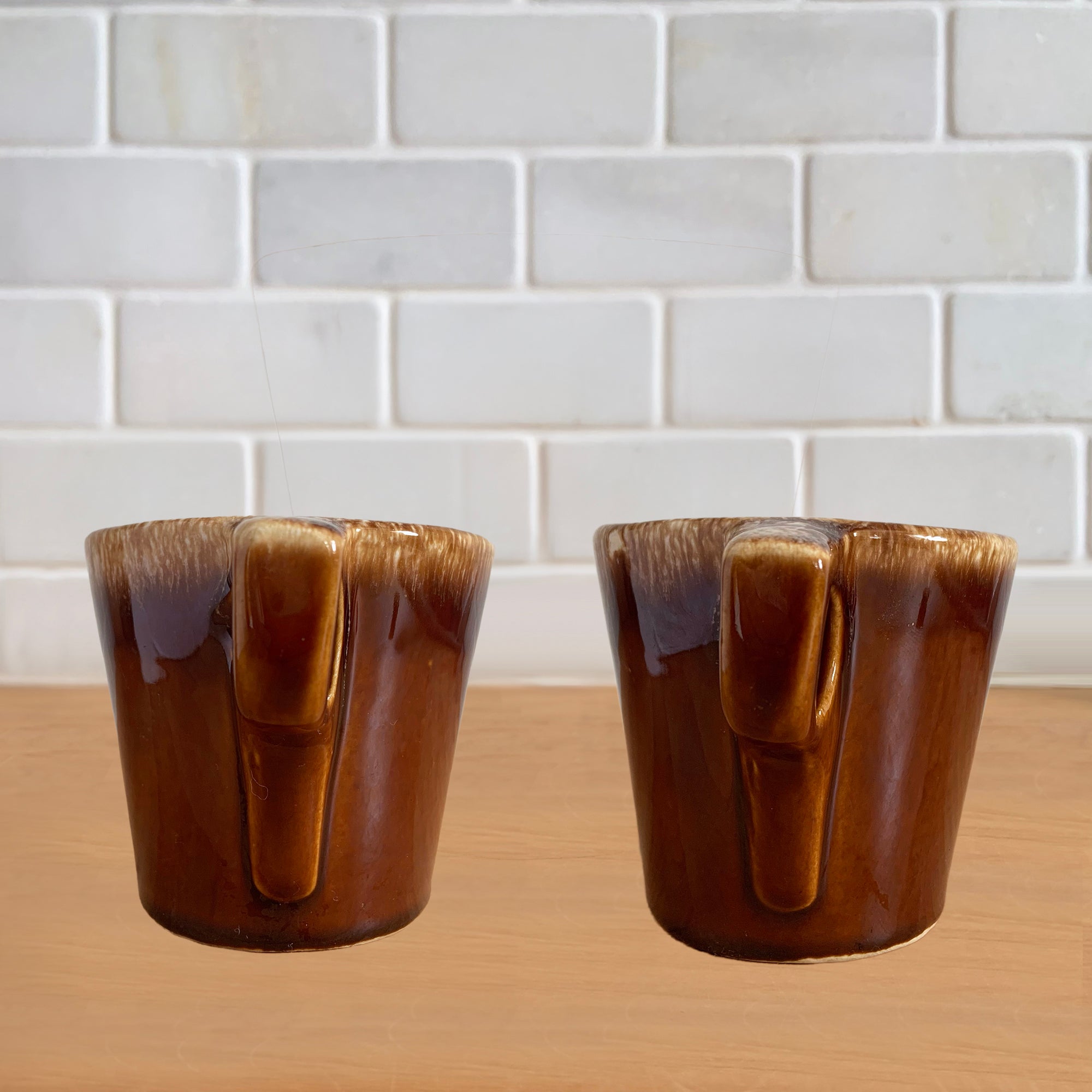 Pair of vintage glossy brown drip glaze mugs. Crafted by Hull Pottery, USA, 1960s. Enjoy any hot beverage in this fabulous retro oven-proof tableware!