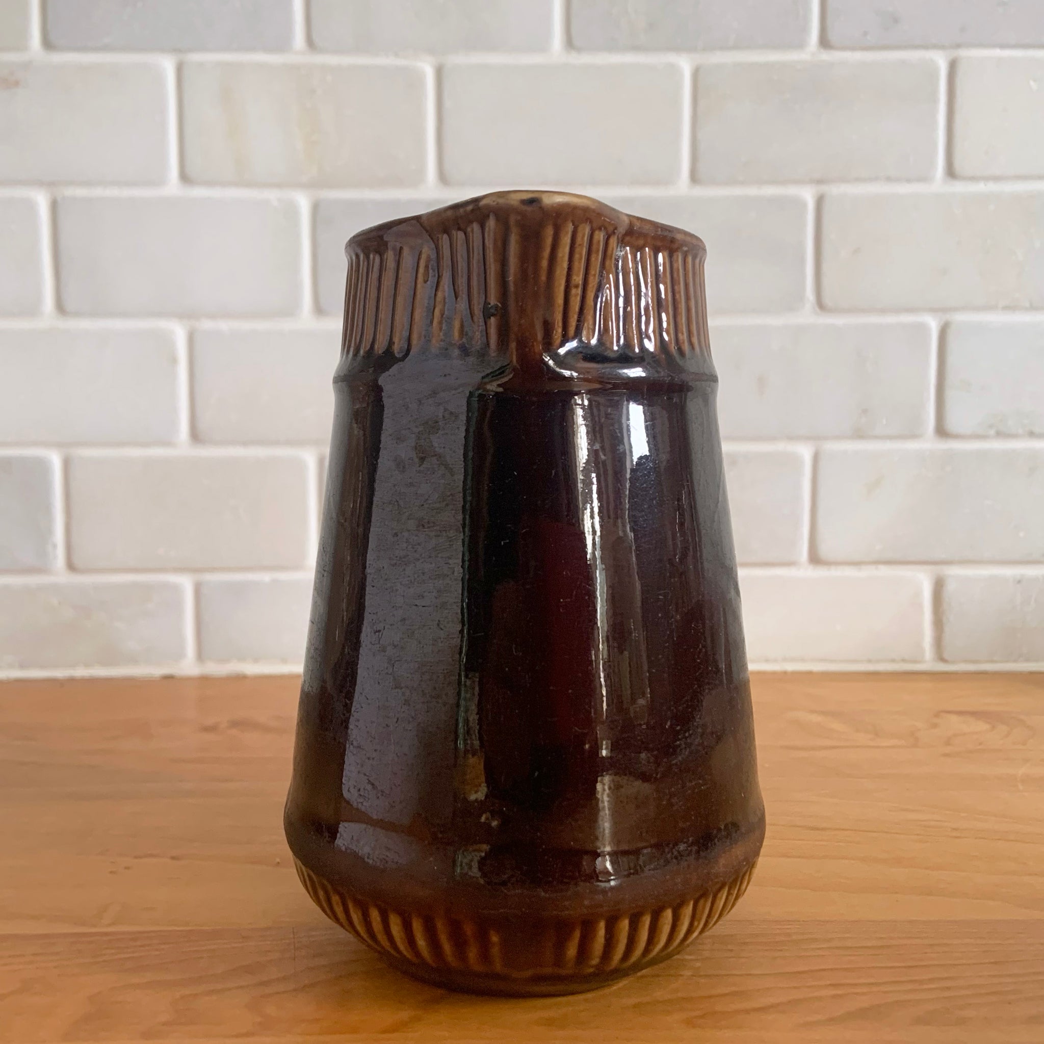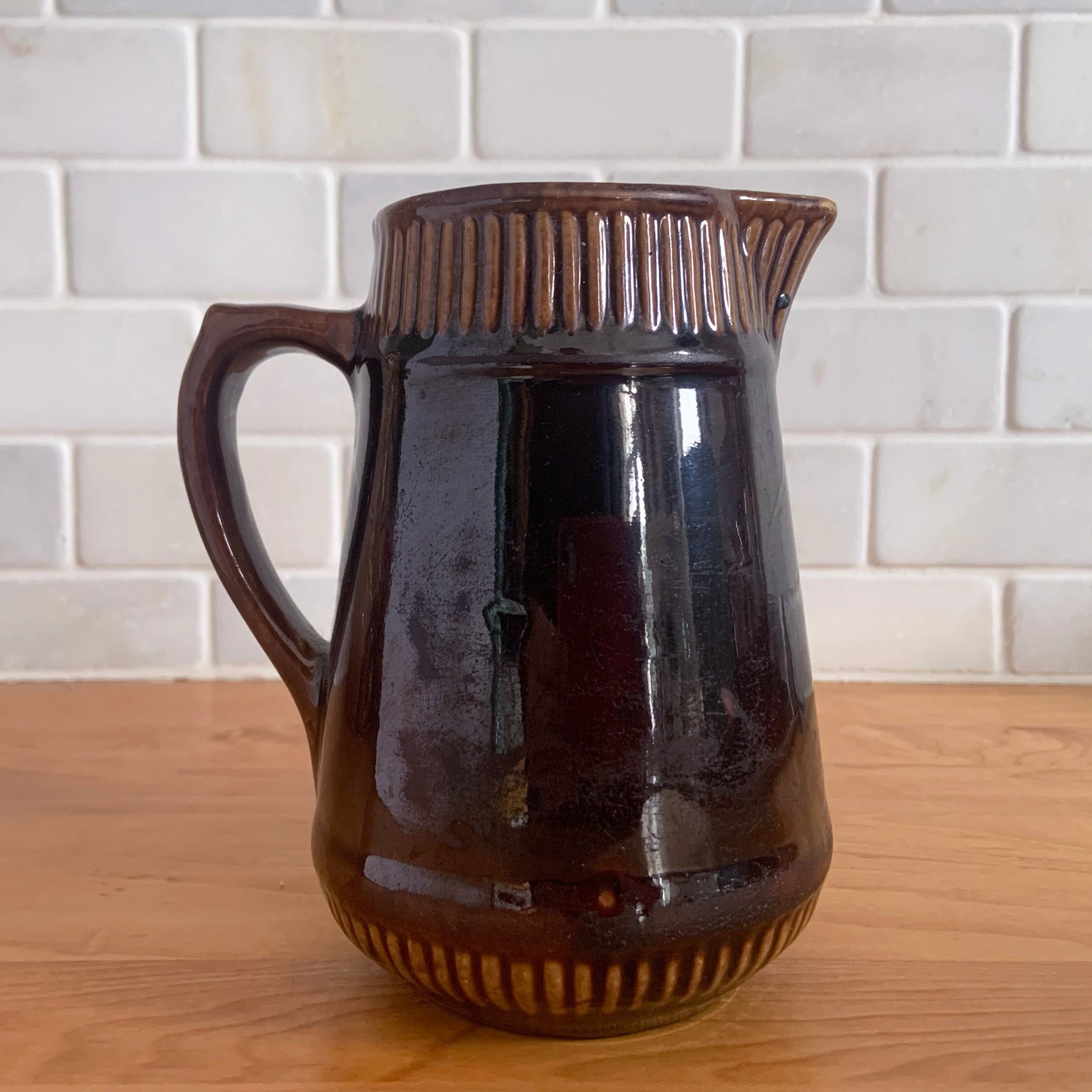 Vintage gloss brown stoneware pitcher with ribbed bands. Crafted by Medalta Stoneware, Canada, 1924. This utilitarian piece nicely complement any farmhouse or cottage kitchen!
