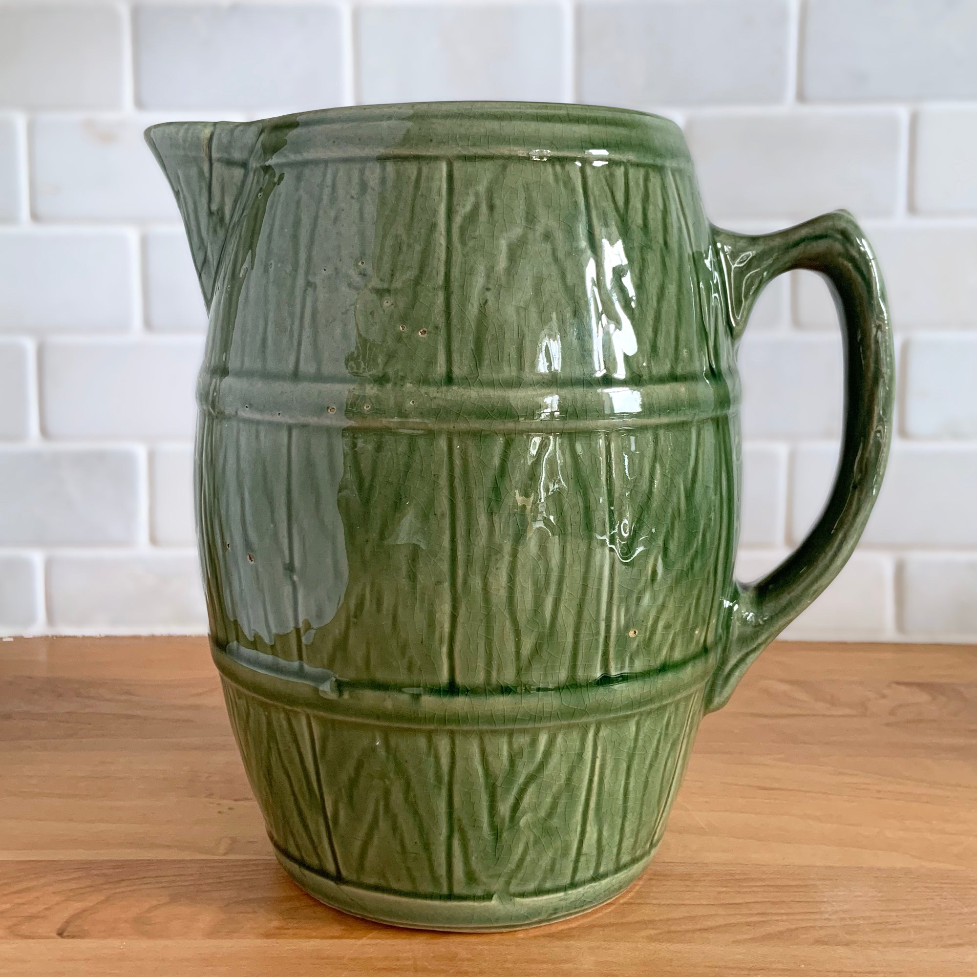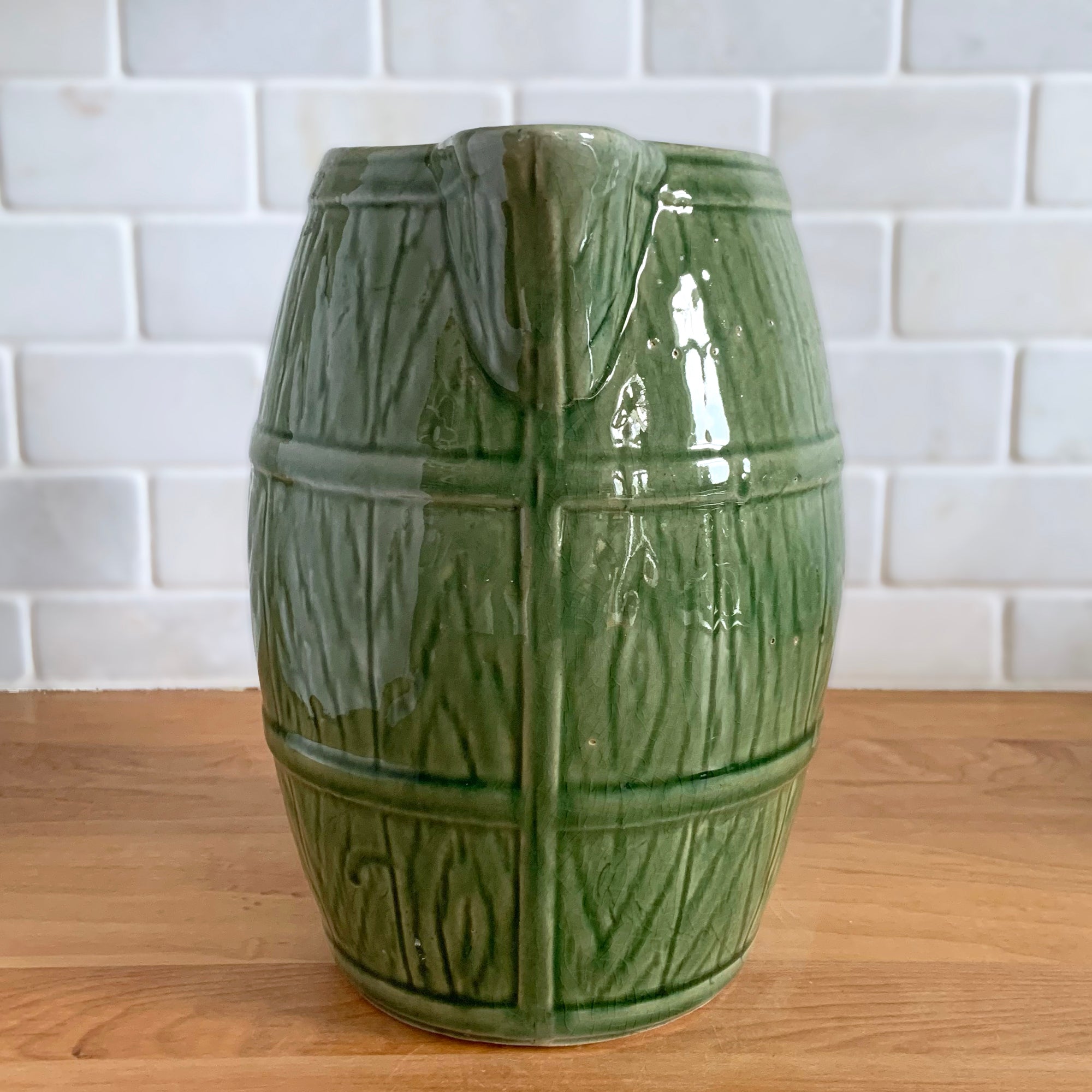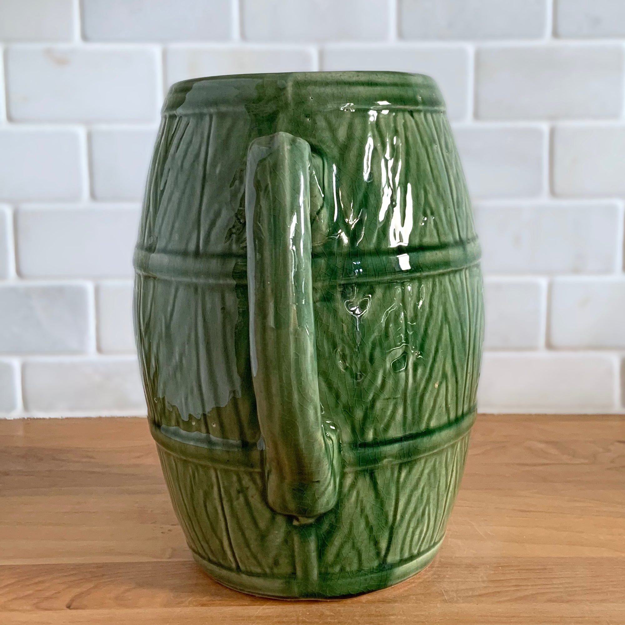 Vintage green barrel ceramic mugs and tankard pitcher set, includes six mugs and and one pitcher. Crafted by McCoy Pottery, USA, 1920s. Off the hop this set gives us all the beer, hot chocolate and cider vibes!