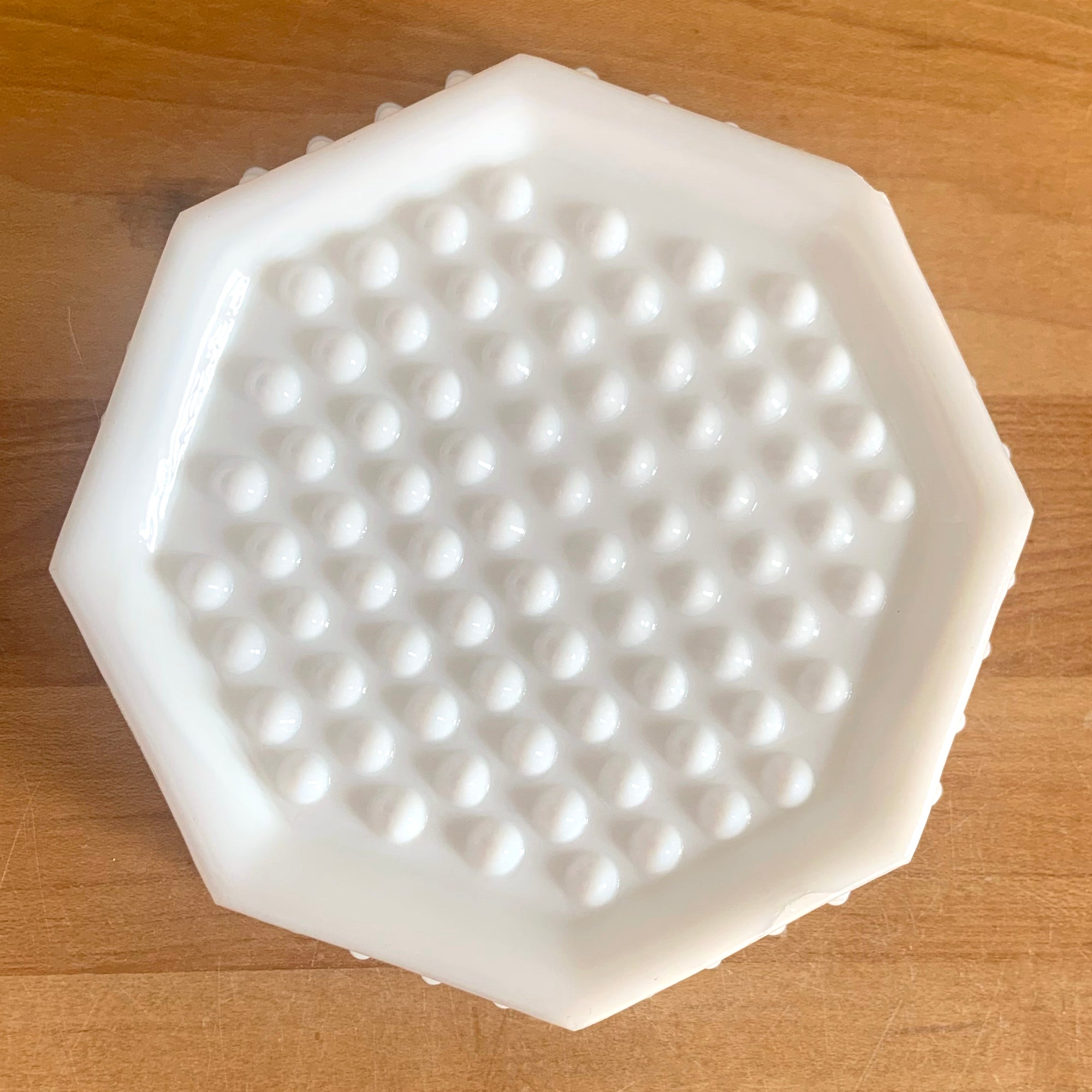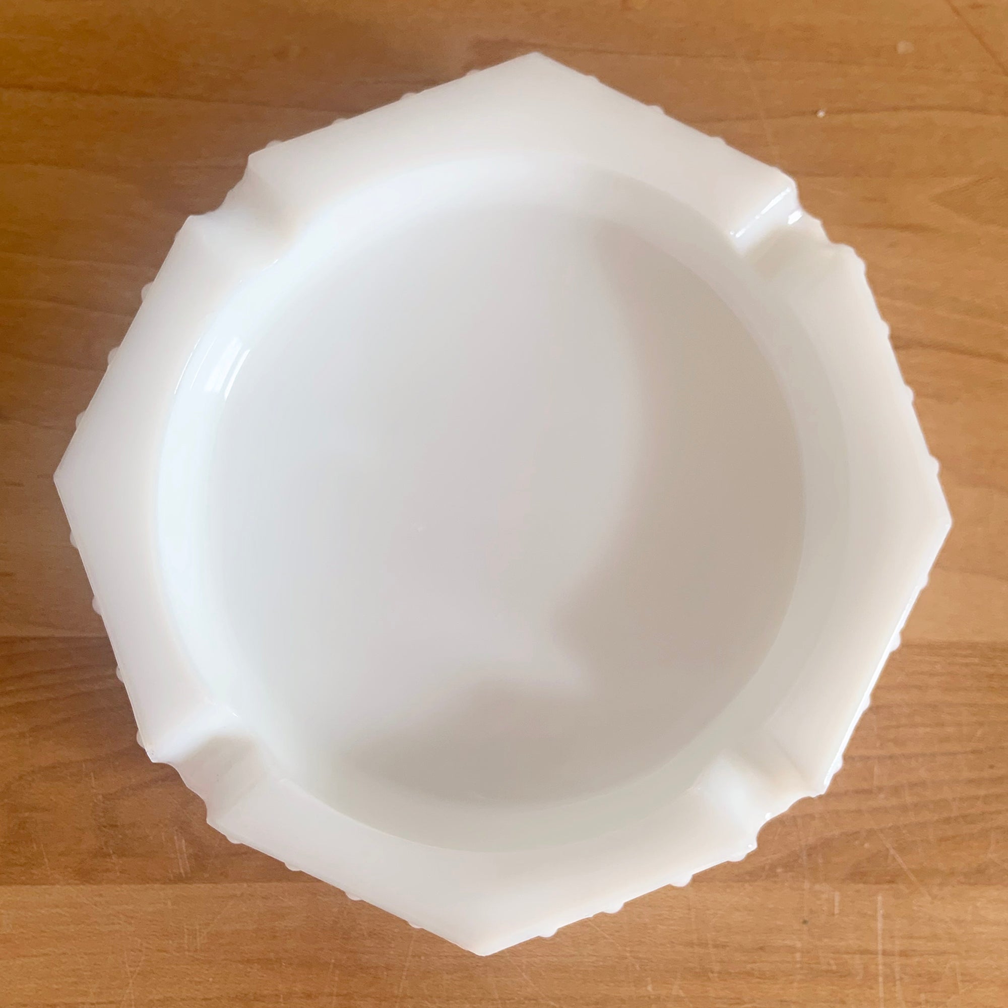 Vintage octagonal "Hobnail" milk glass ashtray. Crafted by Fenton Art Glass, USA, pre-1970. A perfect addition to any decor style, it offers a sense of understated elegance, as well as versatility - use as an ashtray, or repurpose it to store trinkets, jewelry, or even soap!