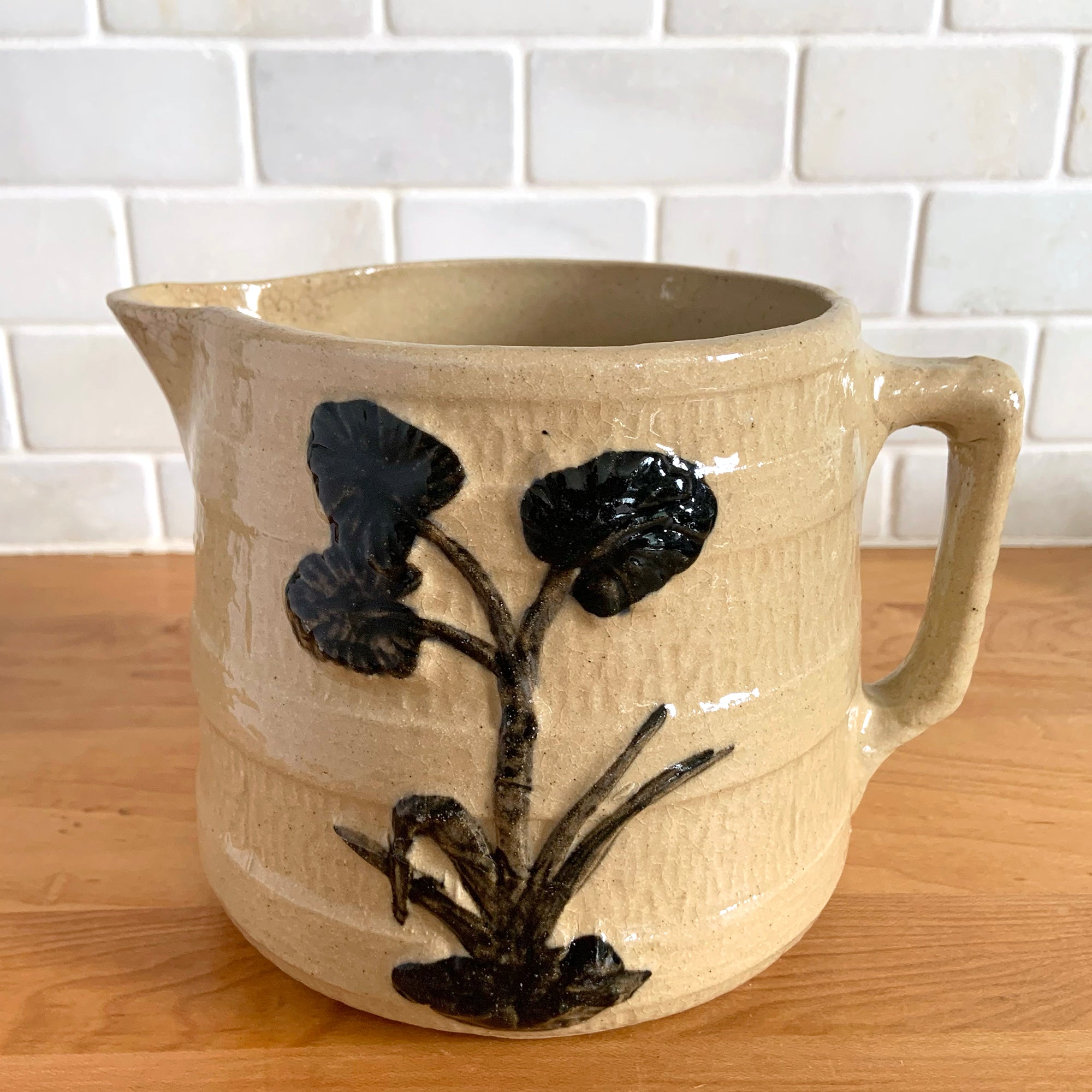 Vintage natural yellow ware strapped barrel milk pitcher featuring black lily in bas relief with rope style handle, No. 21171. Crafted by Robinson Ransbottom Pottery Co., USA, 1930s. A beautiful piece of primitive farmhouse tableware to enhance your home's decor and a wonderful addition to any art pottery collection!