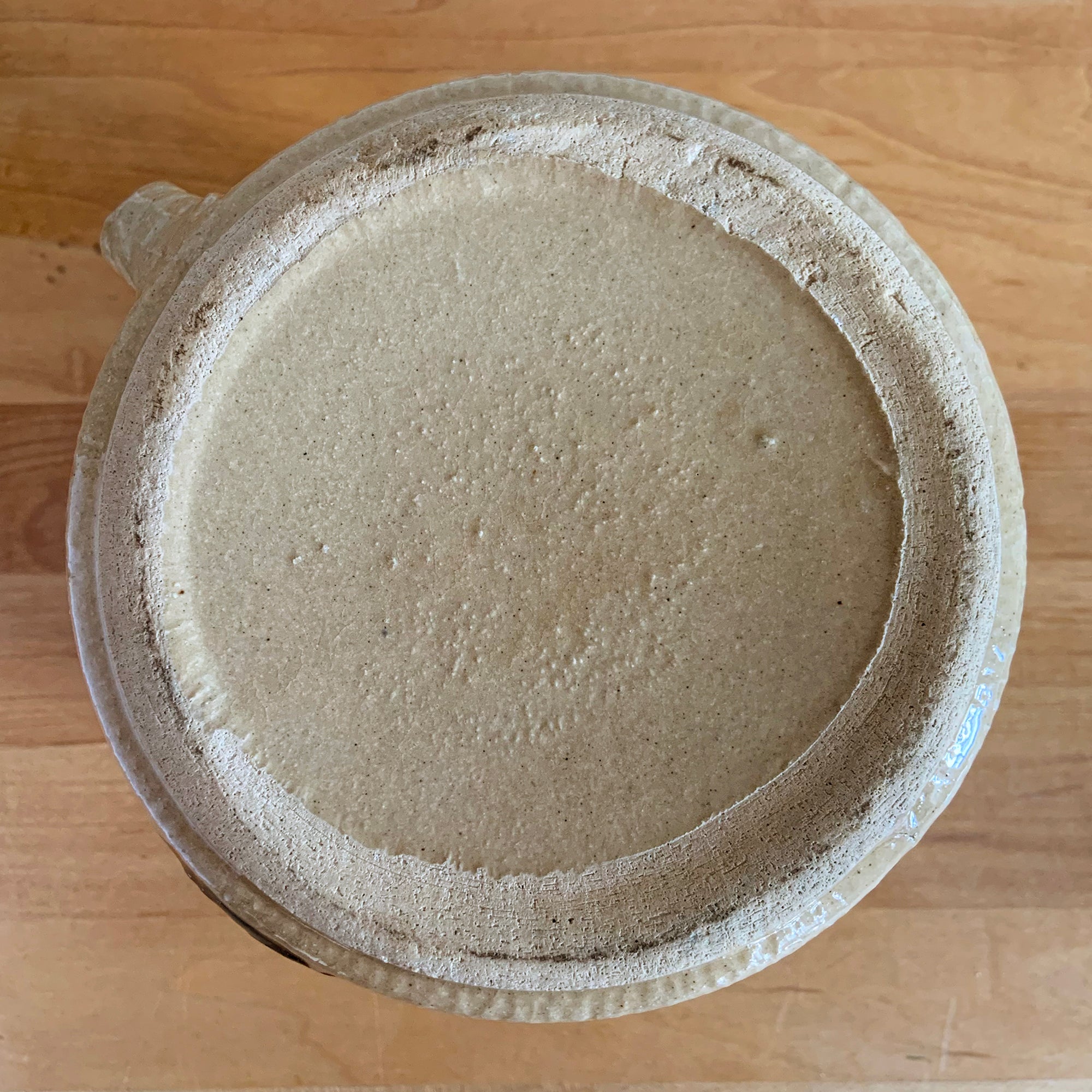 Measures 5 1/4 x 7 1/2 x 5 3/8 inches. In as found vintage condition, chip to rim, no cracks/repairs, glaze wear at the spout, age-related crazing and glaze pops. Unmarked. Capacity 48 ounces