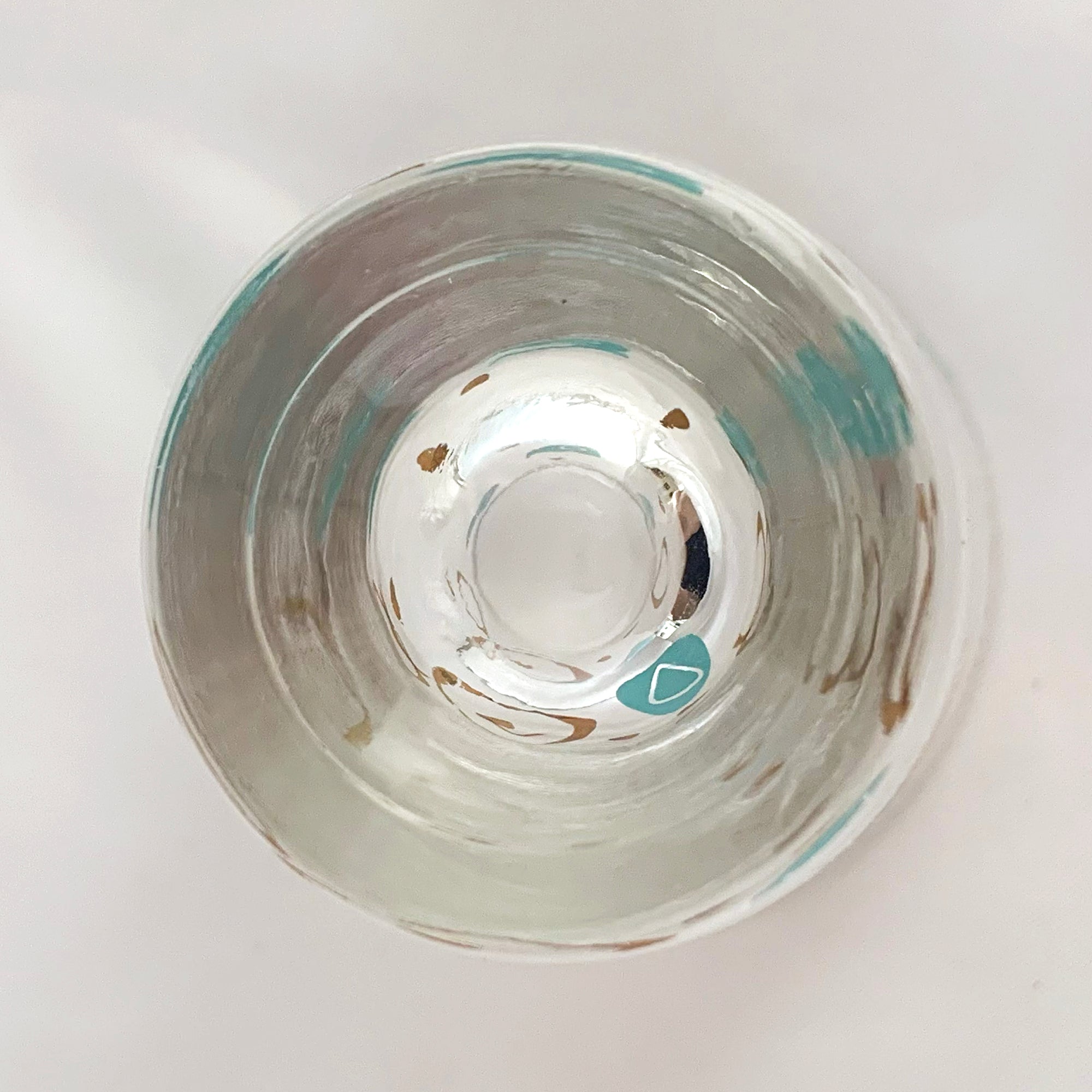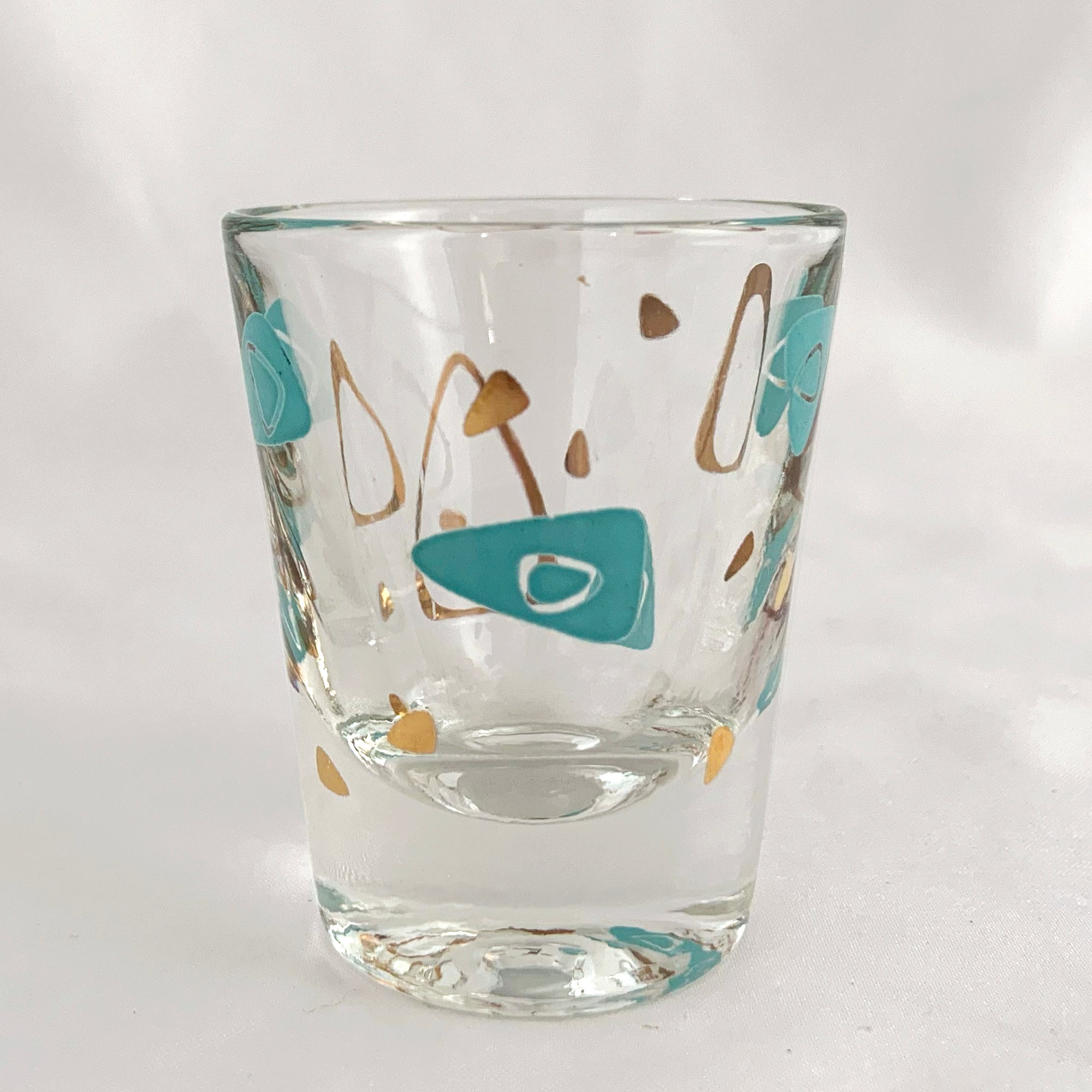 Vintage mid-century design in this turquoise and 22kt gold "Boomerang Amoeba" shot glass. Crafted by Federal Glass, USA, 1960s. A fabulous example of atomic style, this wee cocktail glass will amp up any bar cart and makes a fabulous addition to any barware collection.
