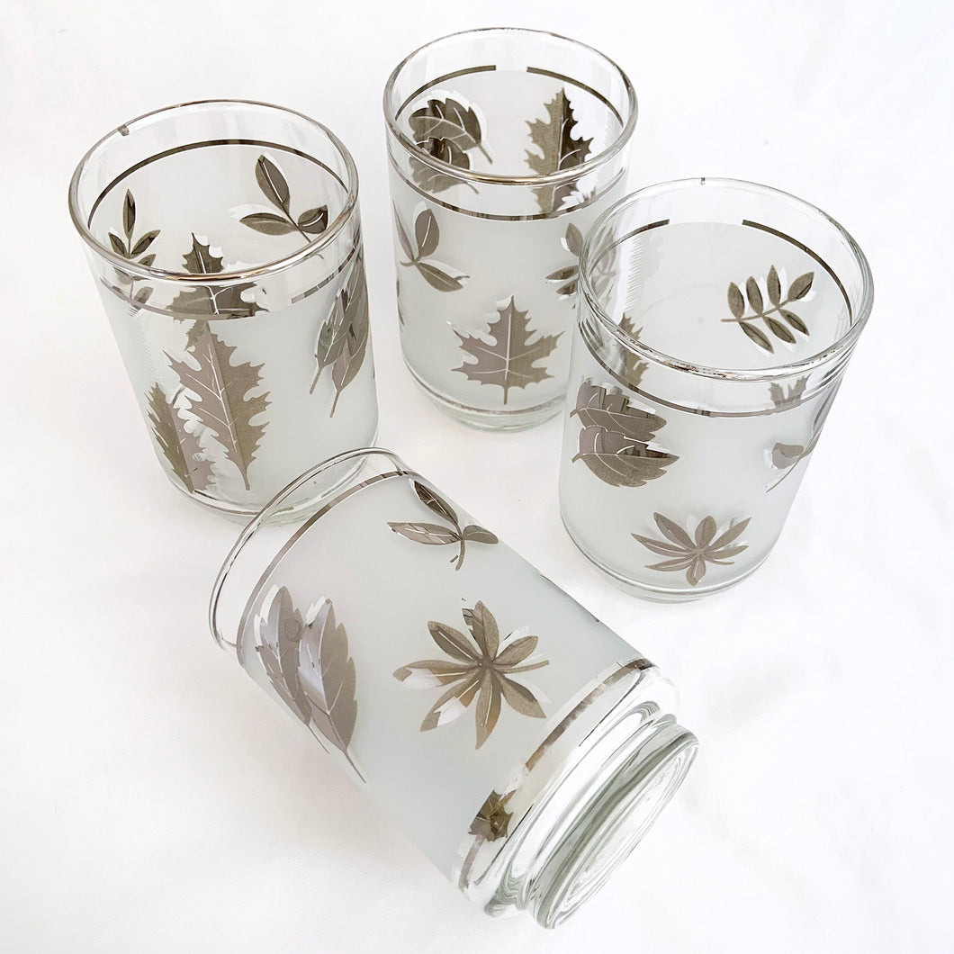 Set of four vintage "Silver Foliage" flat glass tumblers. Crafted by Libbey Glass, USA, 1953 - 1978. The perfect addition to your barware collection!