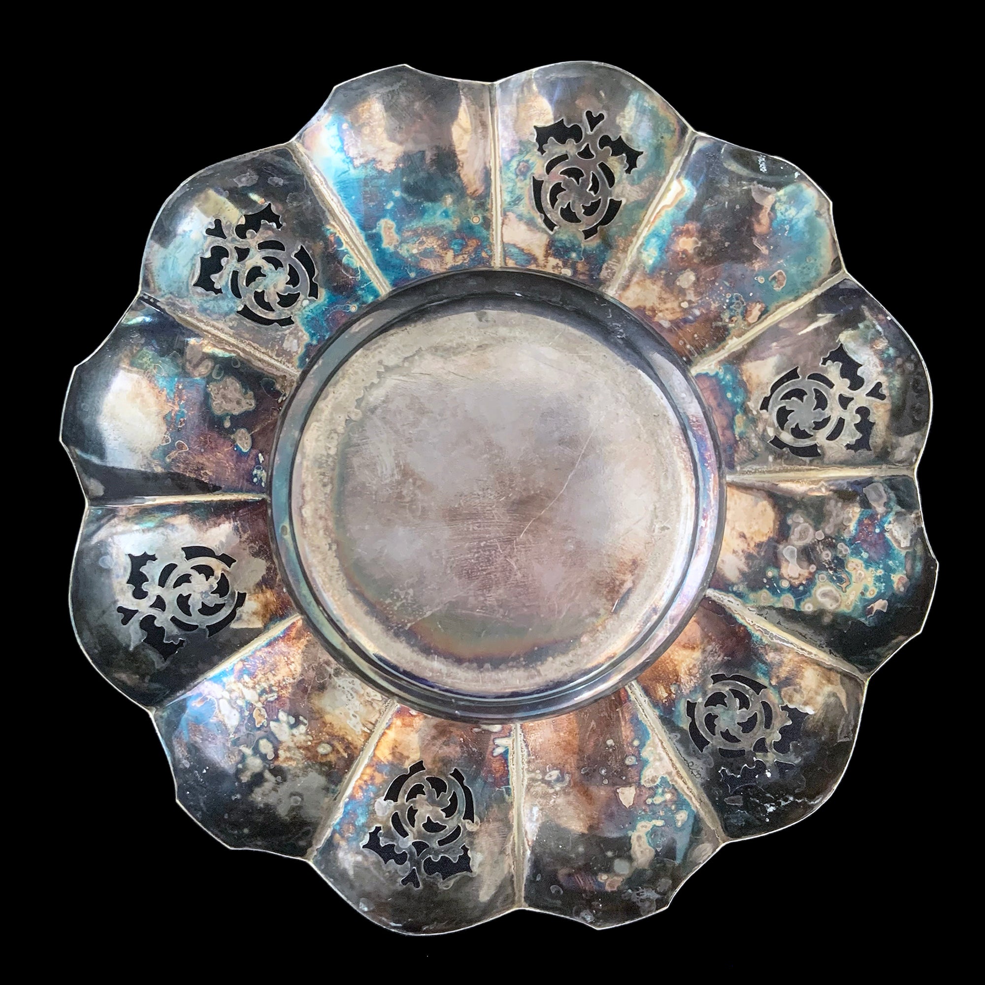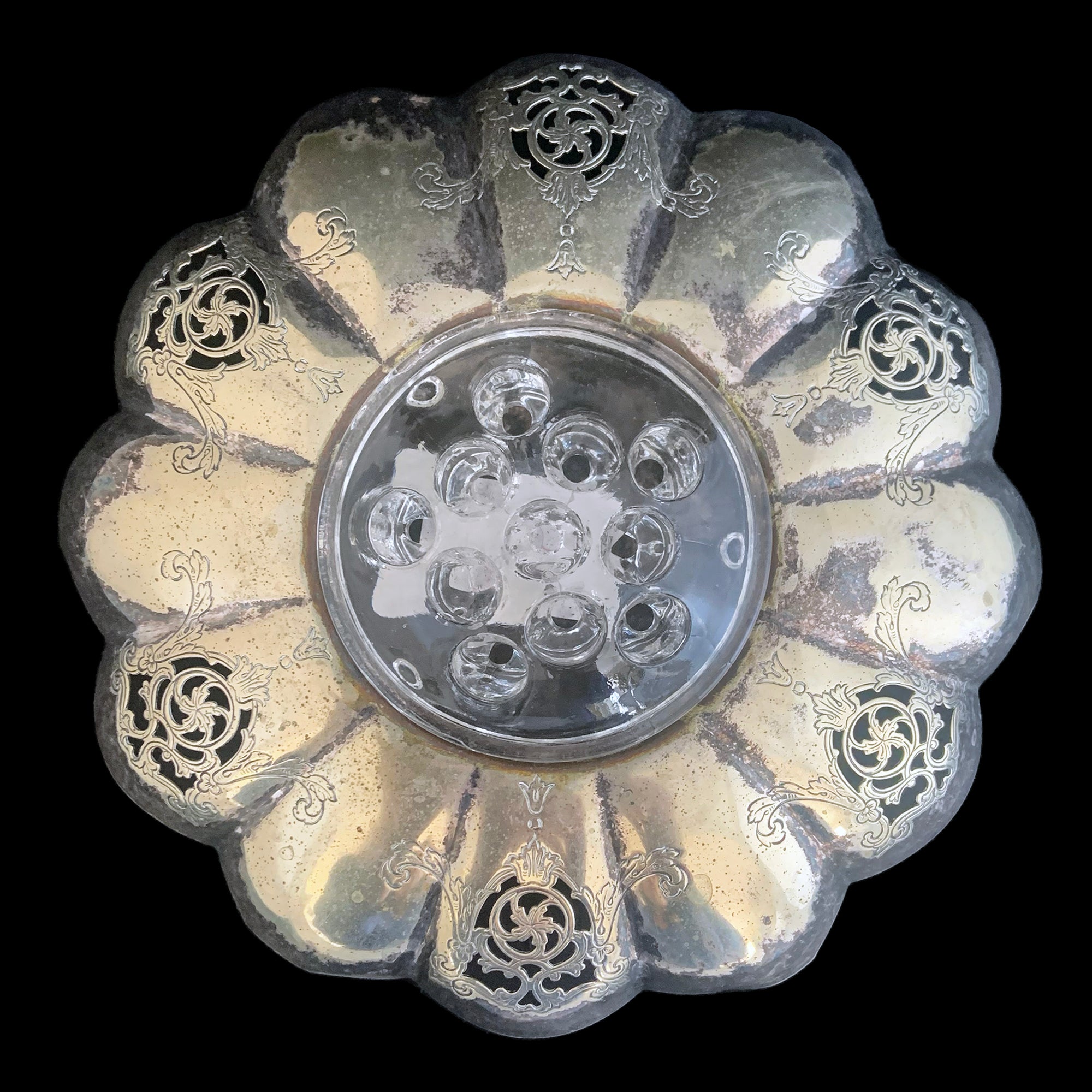This lovely vintage silver plated flower vessel is ornately engraved with florals, decorative swirls, leaves and pierced details. Crafted by Essay Silversmiths, Canada 1950s. With the glass flower frog you'll be able to create a beautiful centrepiece.