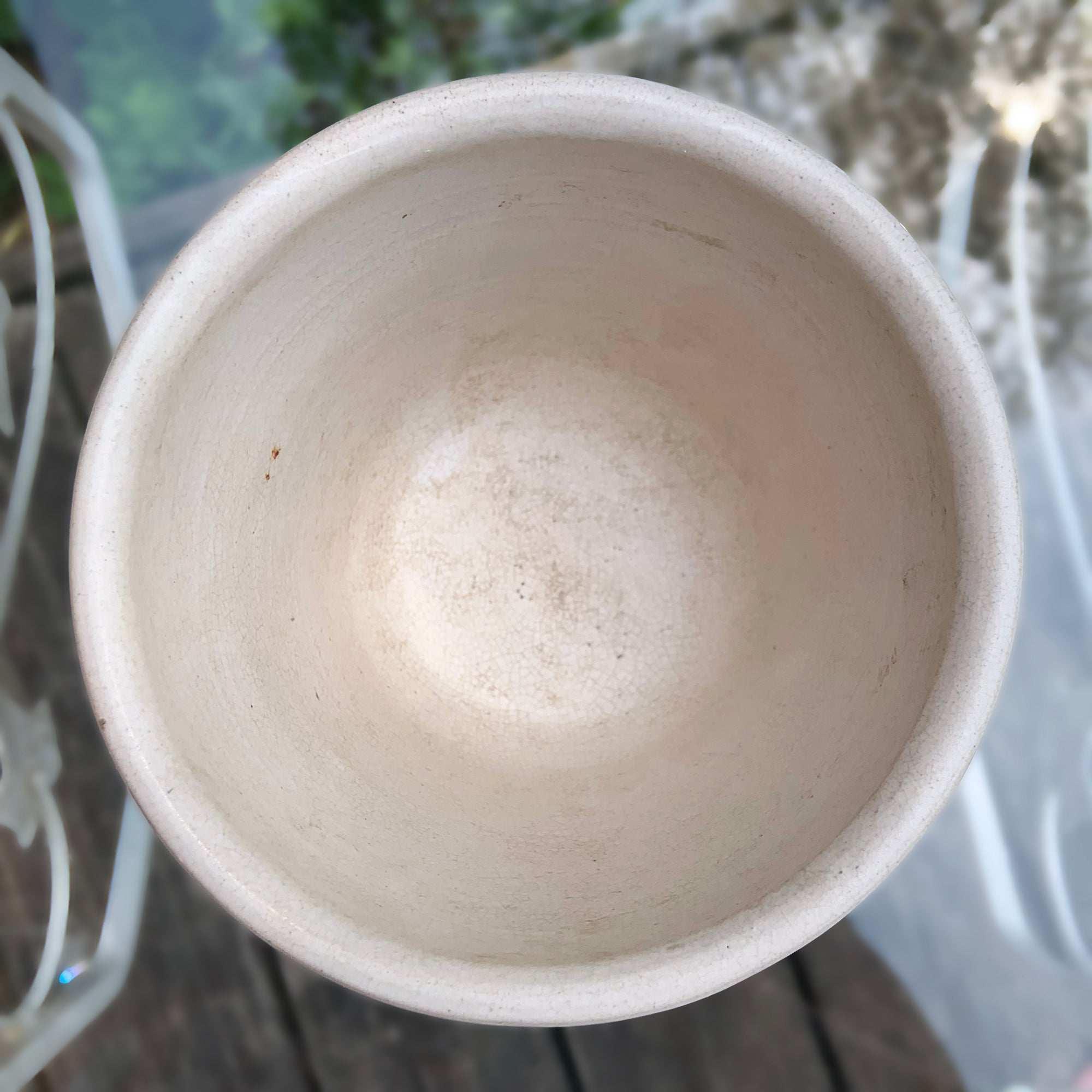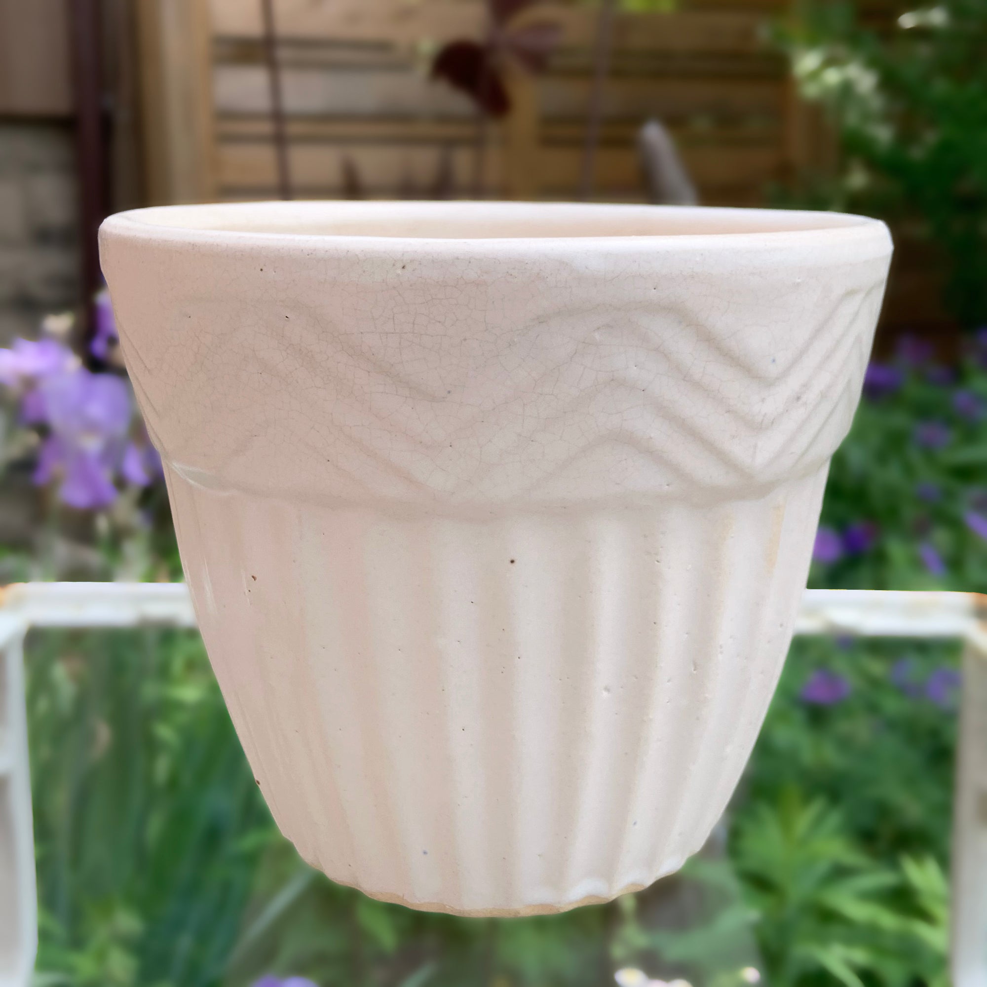 Vintage white matte glaze ceramic jardiniere planter featuring ribbed body with chevron band at the rim. Crafted by Robinson Ransbottom Pottery Co., 1950s. A beautiful piece to add to your art pottery collection and rehome your favourite plant!