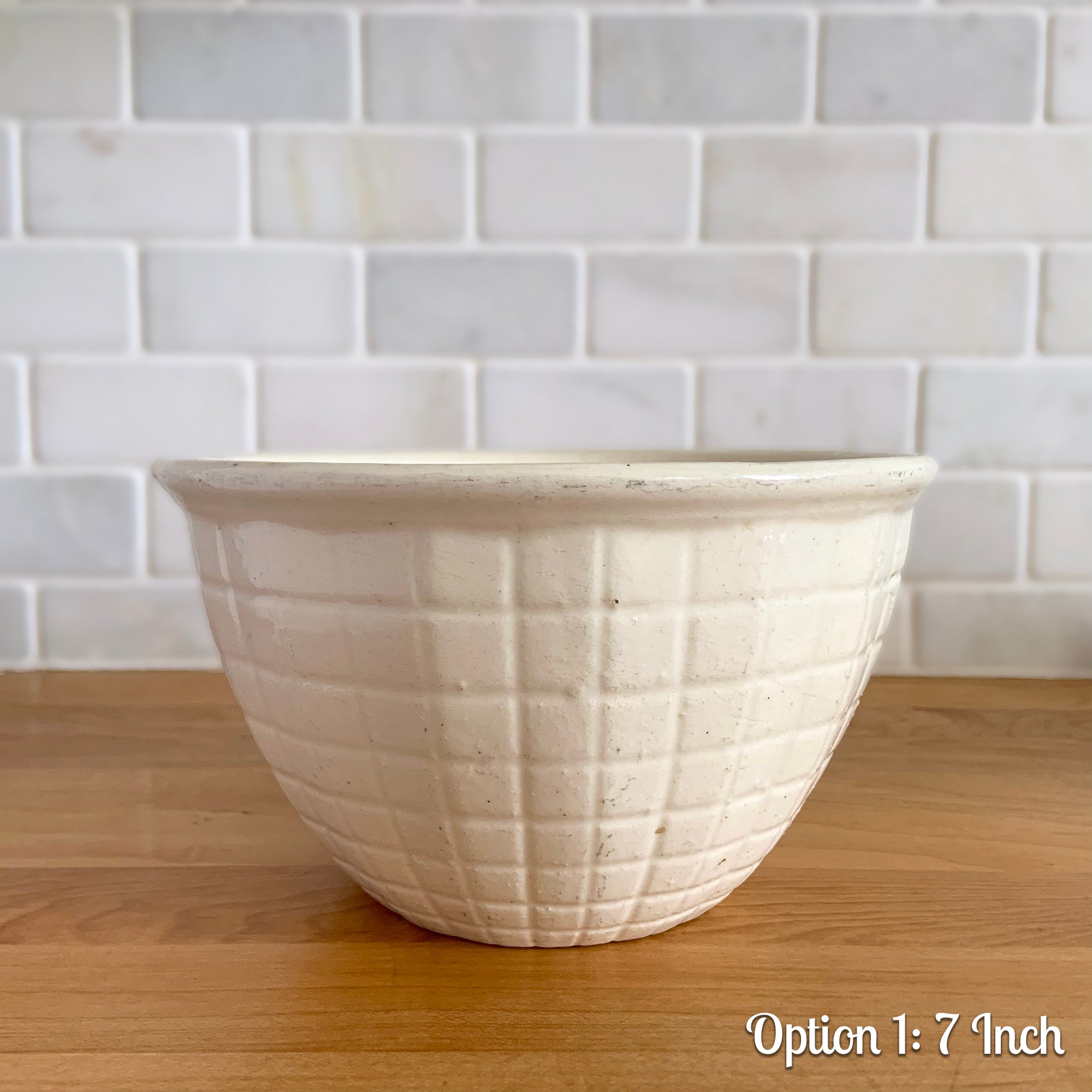 Jacks Daughter of All Trades Vintage Antique Mid-Century Store Shop Reseller Etsy Shopify Toronto Canada Free Porch Pick Up Local Delivery Worldwide Shipping Judy Weinberg Unique Housewarming Gift Sustainable Gift Wedding Gift Home Decor Collectible Collector Gift Farmhouse Cottagecore Cottage Lodge Shabby Chic Industrial white embossed grid squares mixing bowl Robinson Ransbottom Pottery Co RRPCo 1950s stoneware nostalgic kitchenware kitchen decor