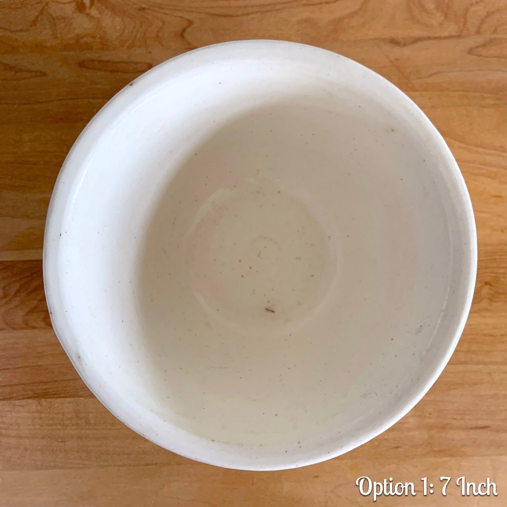 Option 1: Capacity 2QTs. Measures 7 1/8 x 4 1/8 inches. In as found vintage condition, chips at the foot, age-related crazing, manufacturer's glaze pops. Unmarked.
