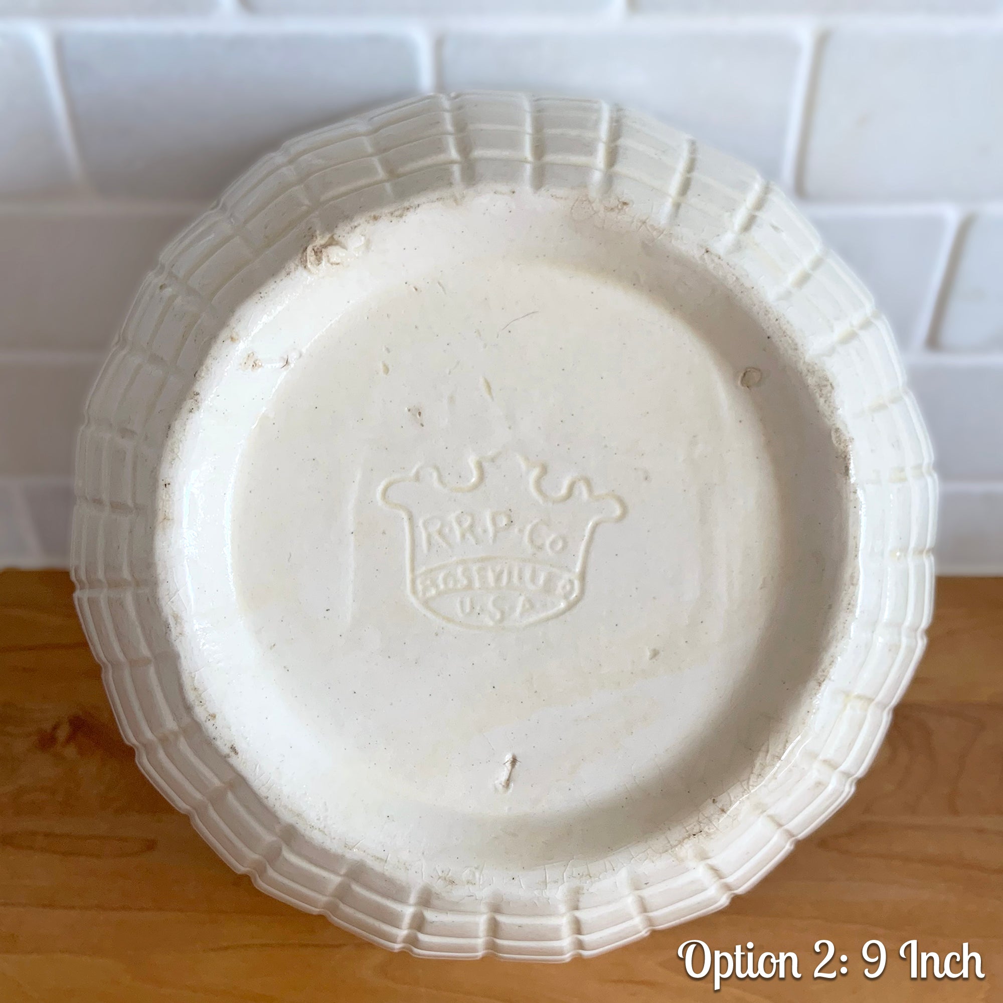 Option 2: Capacity 3 QTs. Measures 9 1/8 x 5 1/8 inches. In good vintage condition, no chips/cracks/repairs, age-related crazing and minor staining on the interior, manufacturer's glaze pops. Maker's mark.