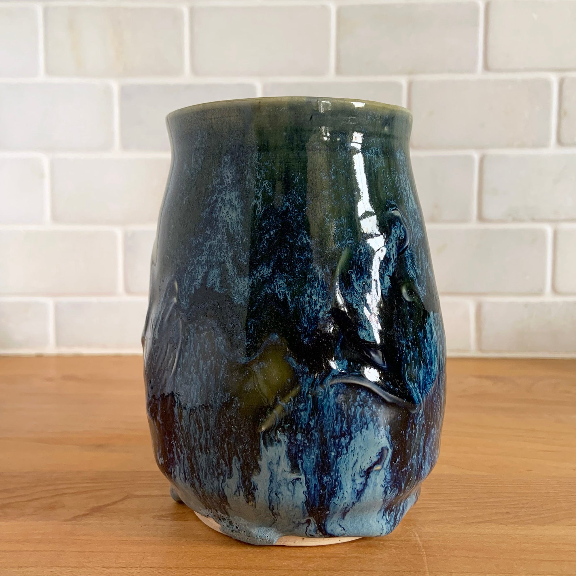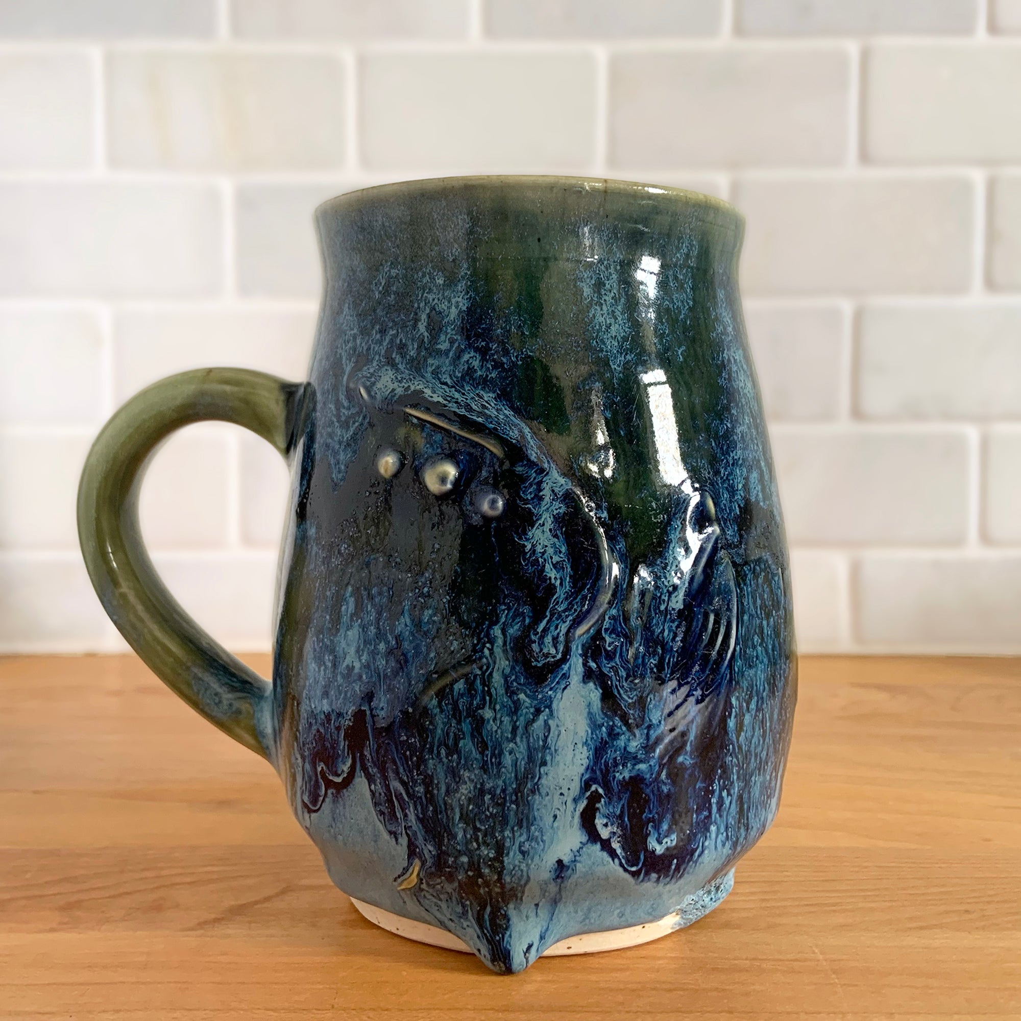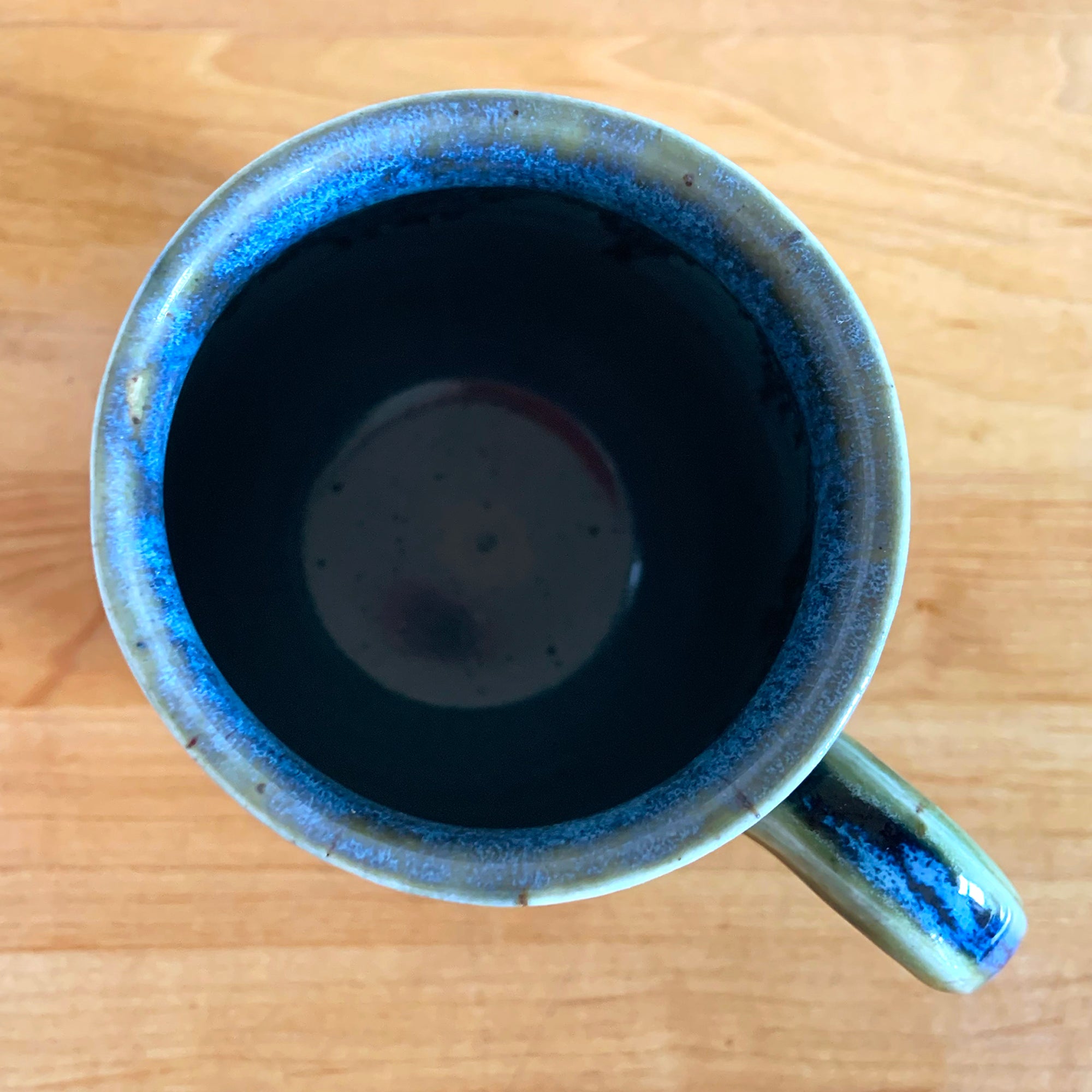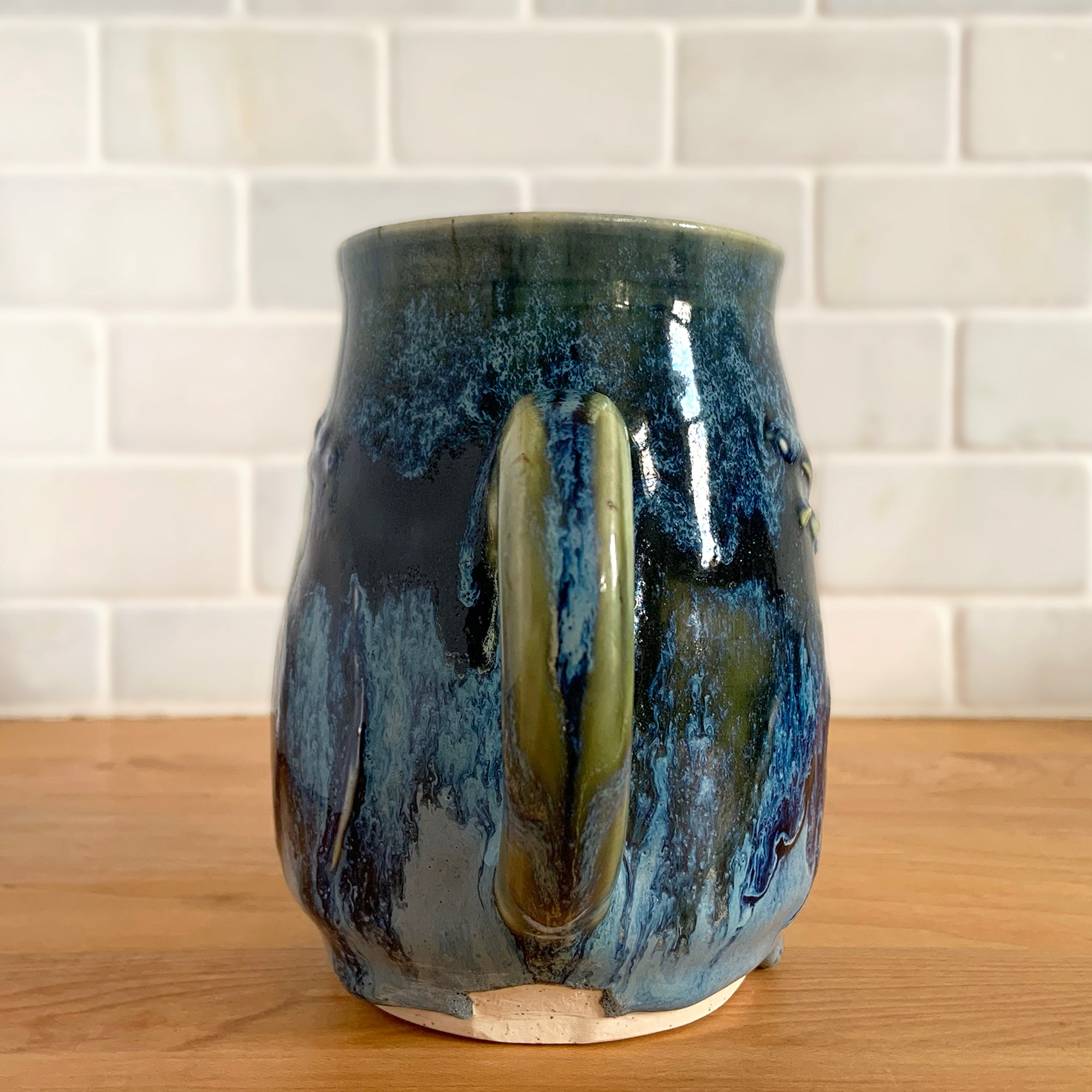 Vintage studio pottery blue and green drip glaze ceramic mug. Signed PBH. This gorgeous handmade vessel is perfect for any hot beverage.